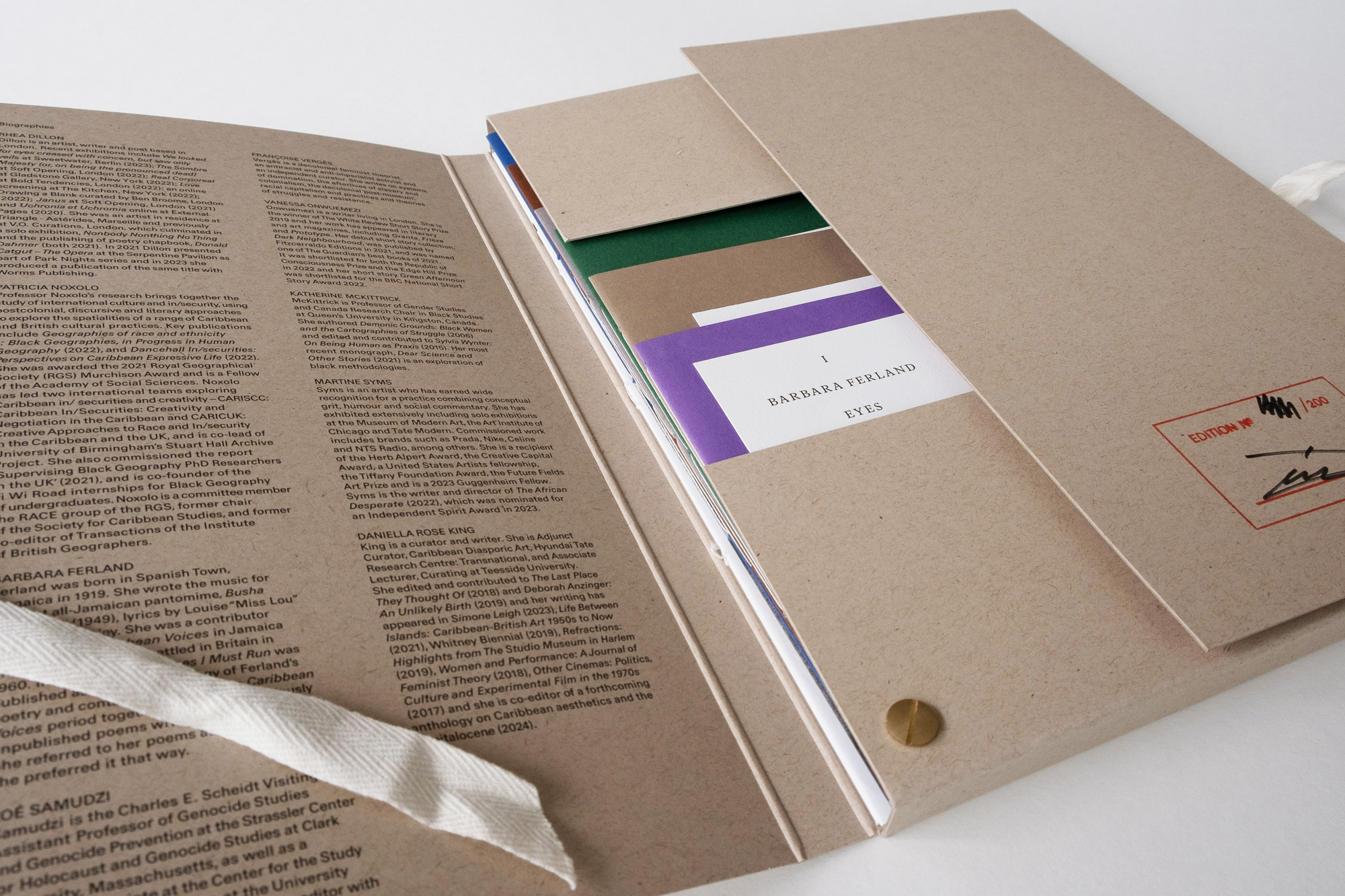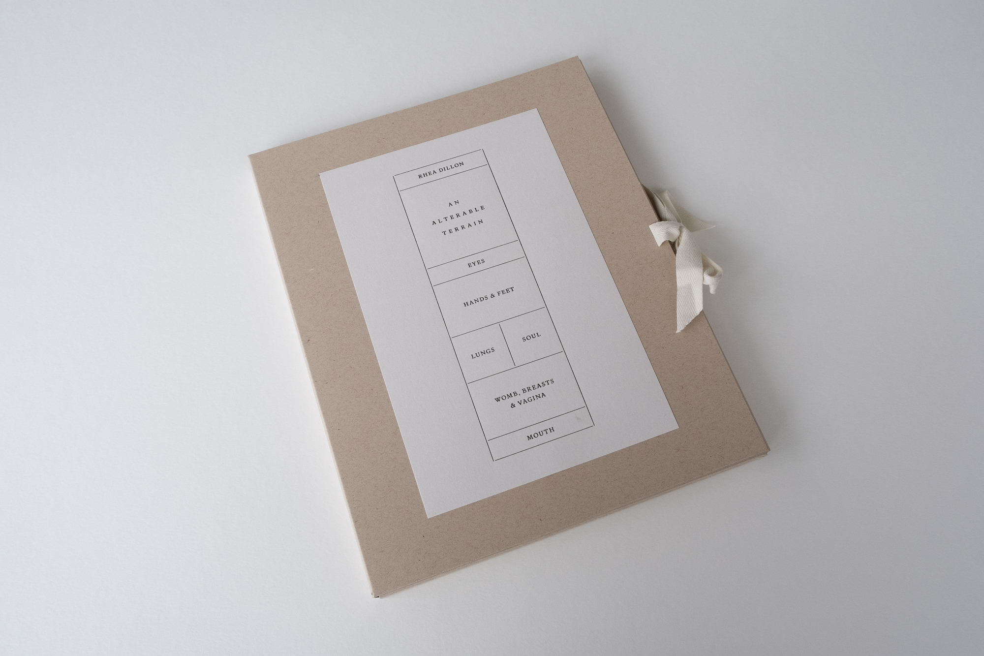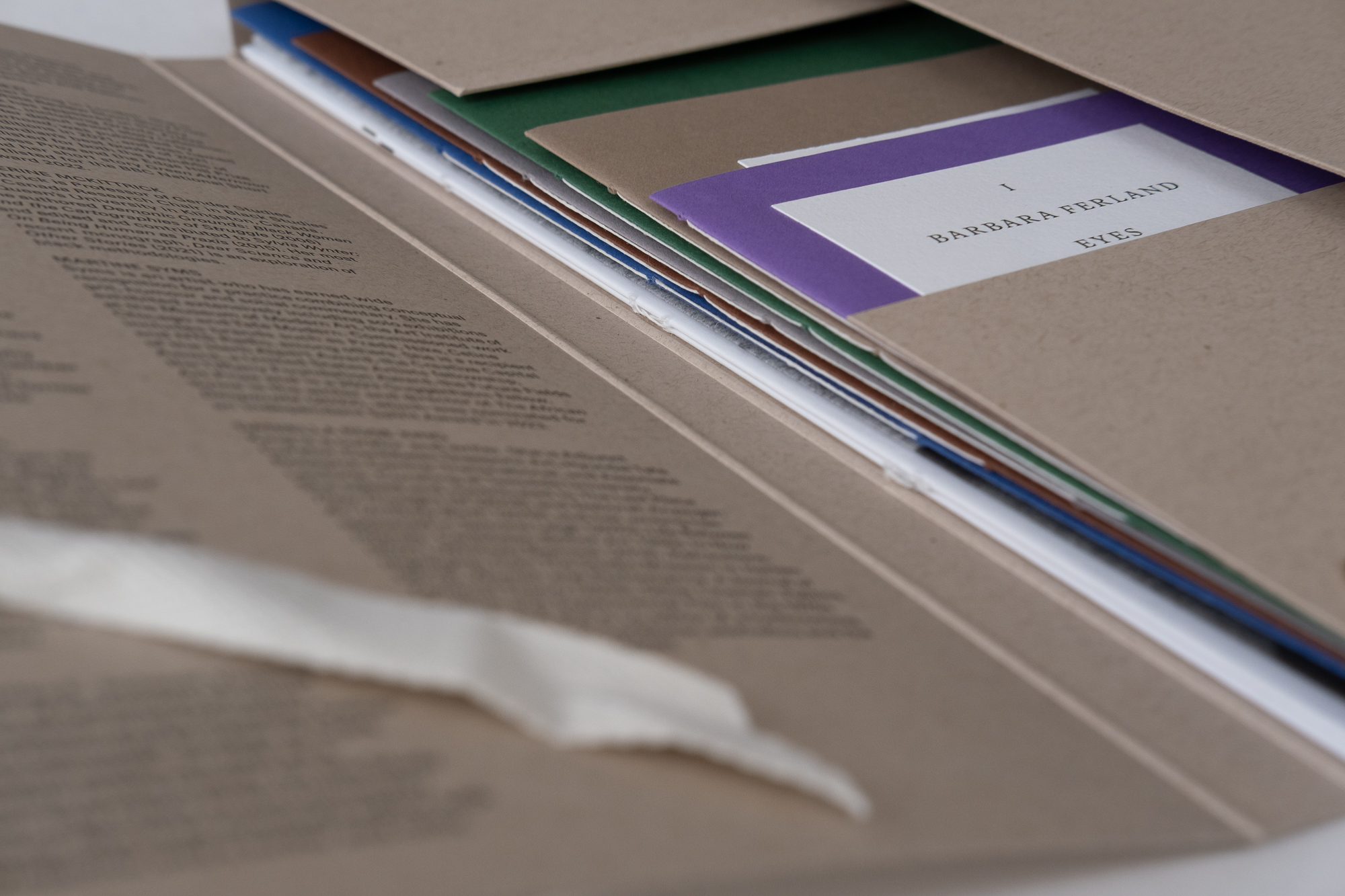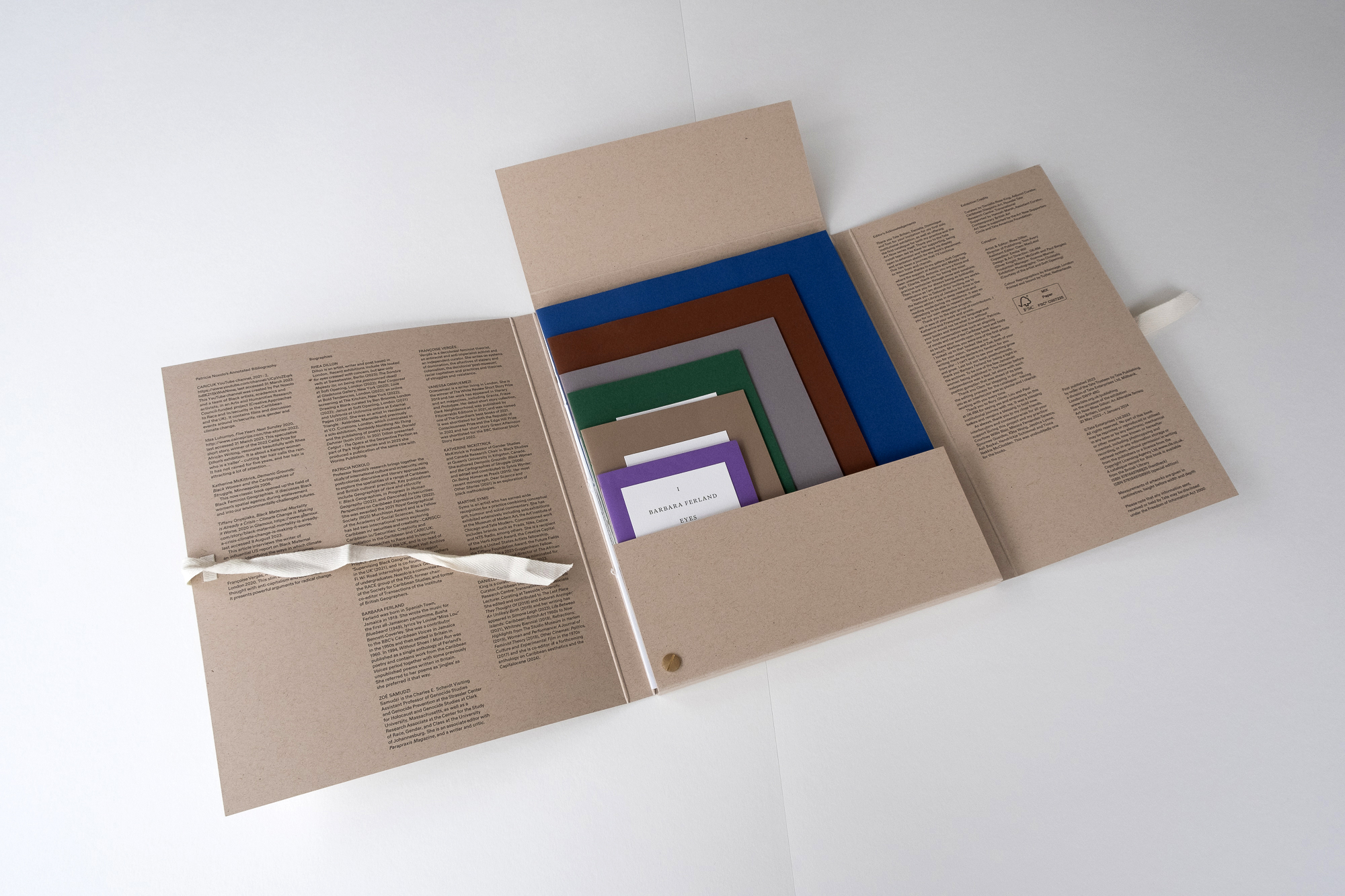 An artists’ edition created for the Tate Gallery consisting of six different pamphlets and prints contained inside a folding box. The books were held together with a screw post that fed through the bottom corner and secured by the bottom edge flap. The folding box has a letterpress printed label mounted on the front cover.