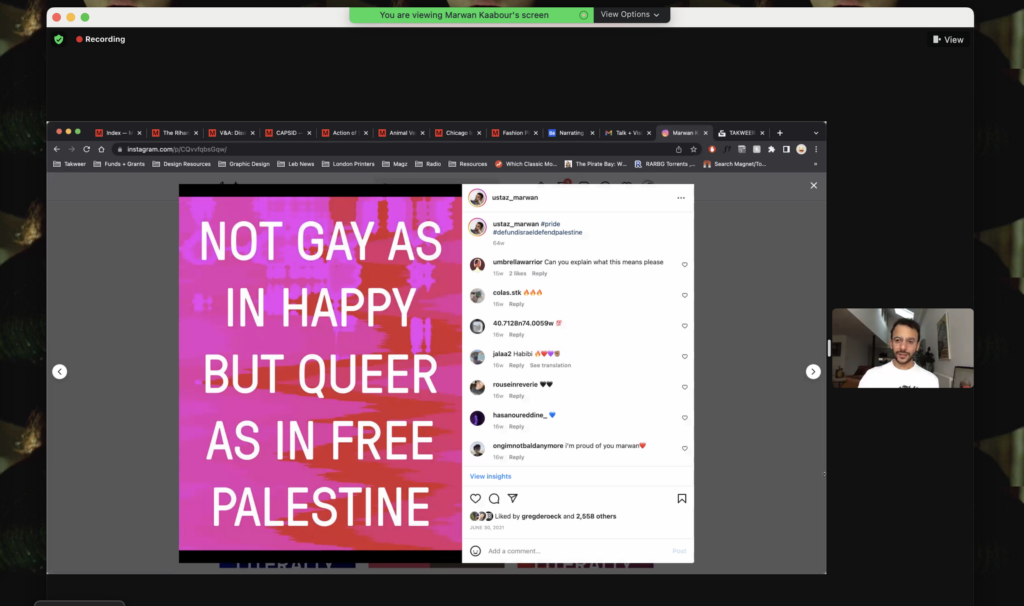 As part of our series of conversations with designers, Graphic Negotiations, we were delighted to welcome graphic designer, artist, founder of Takweer and author of The Queer Arab Glossary, Marwan Kaabour for a chat on Zoom. Below is a full verbatim transcript. If you would like a plain-text version compatible with screen readers, please drop us a message here.