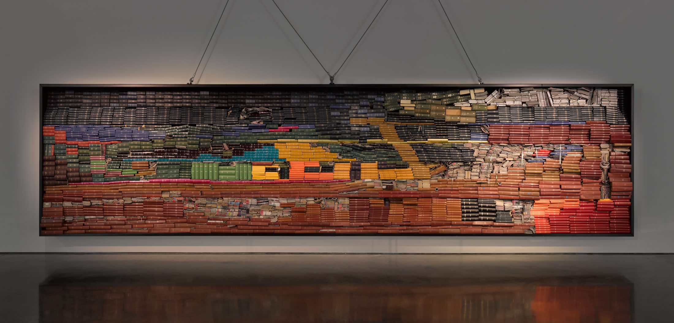 A unique installation of books contained within a huge steel framed case. The secondhand books were collected by the artist with subject matter connected to American history. Each book was titled across the spine with JET or EBONY, and a shortened version of the books’ actual title running vertically down the spine. Specific colours of bookcloth were used to create the overall design.