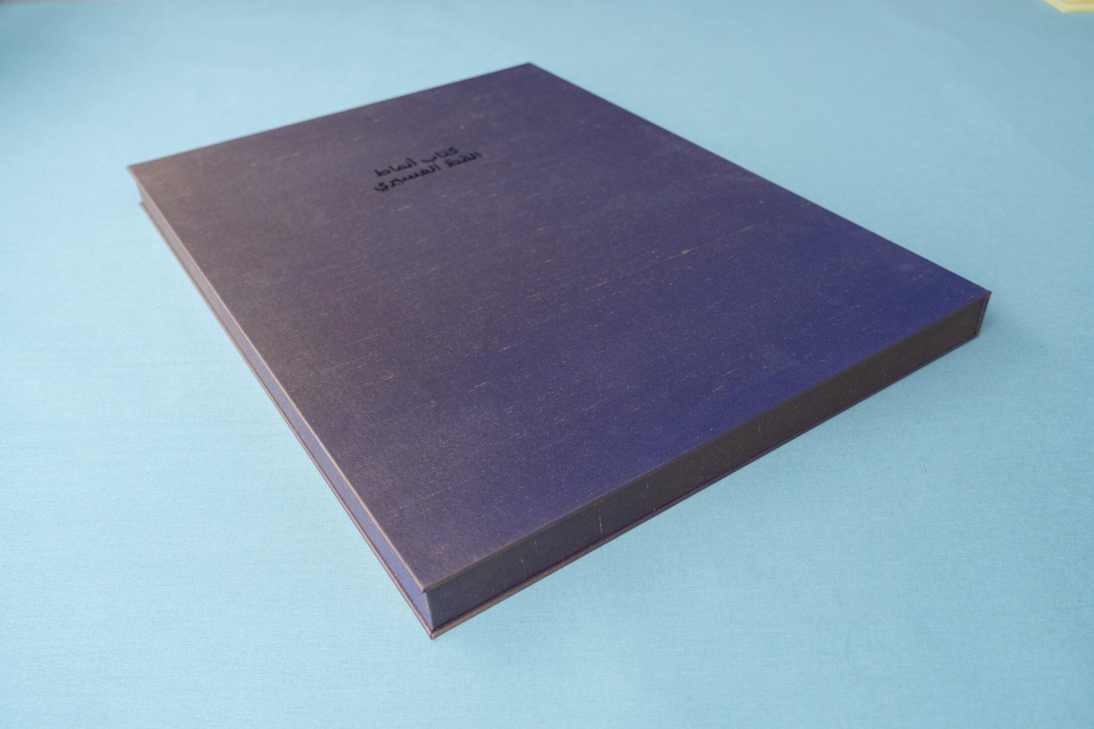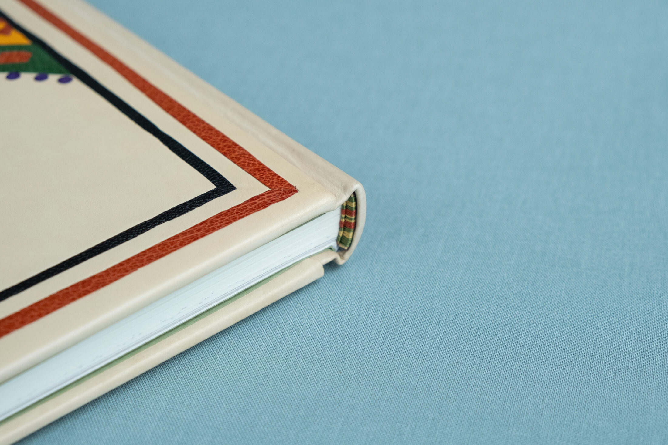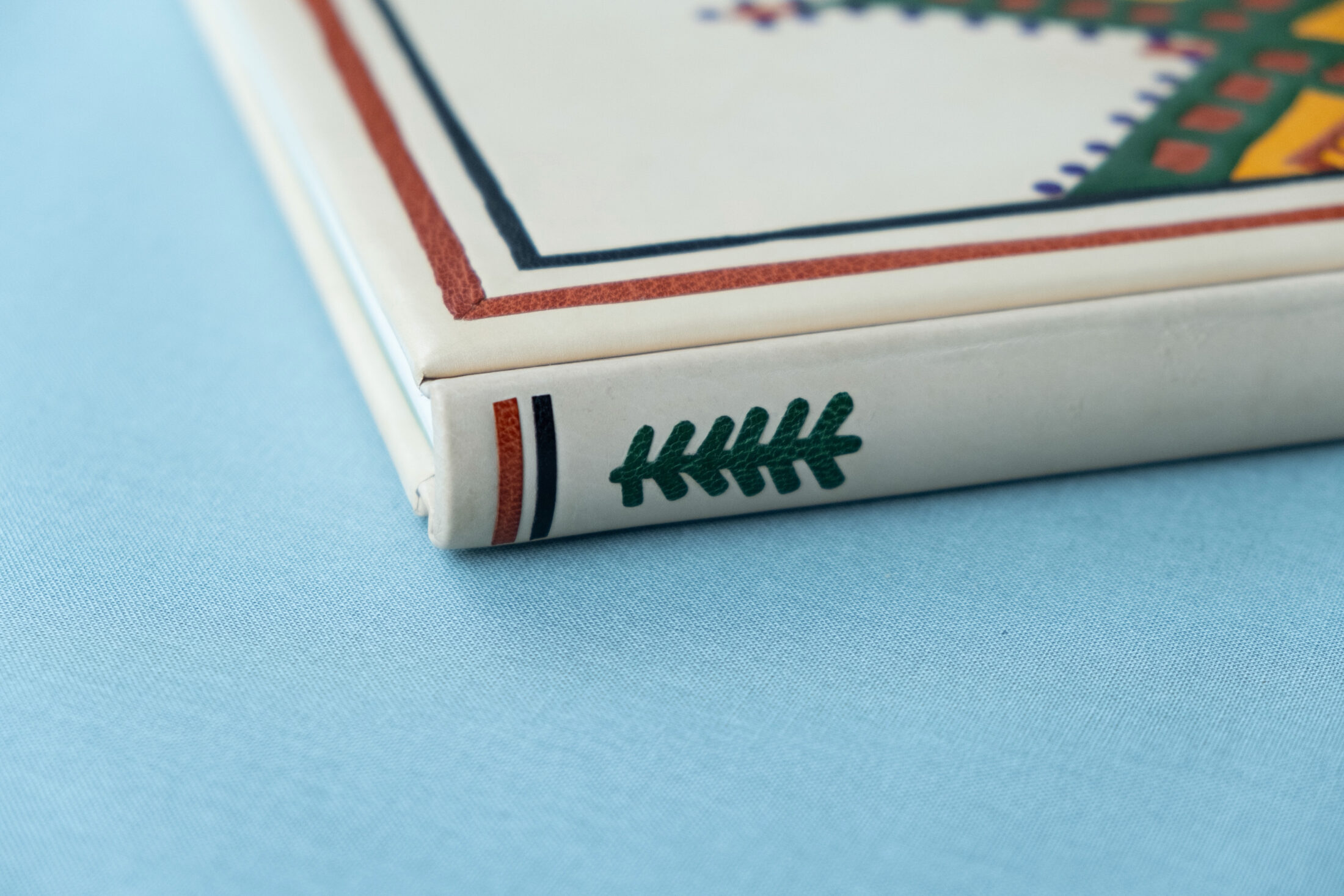 A special fine binding for a book created for Factum Arte documenting the traditional wall painting patterns from a village of Amir on the Yemeni border. One of the hand drawn designs was used in the form of leather onlays onto the front and back covers of the calfskin binding. Some of the onlays are flat to the surface and other elements raised. The title on the front and back covers is also blocked using a specialised technique involving two colours of foil. The book has hand embroidered headbands and is presented in a silk covered clamshell box.