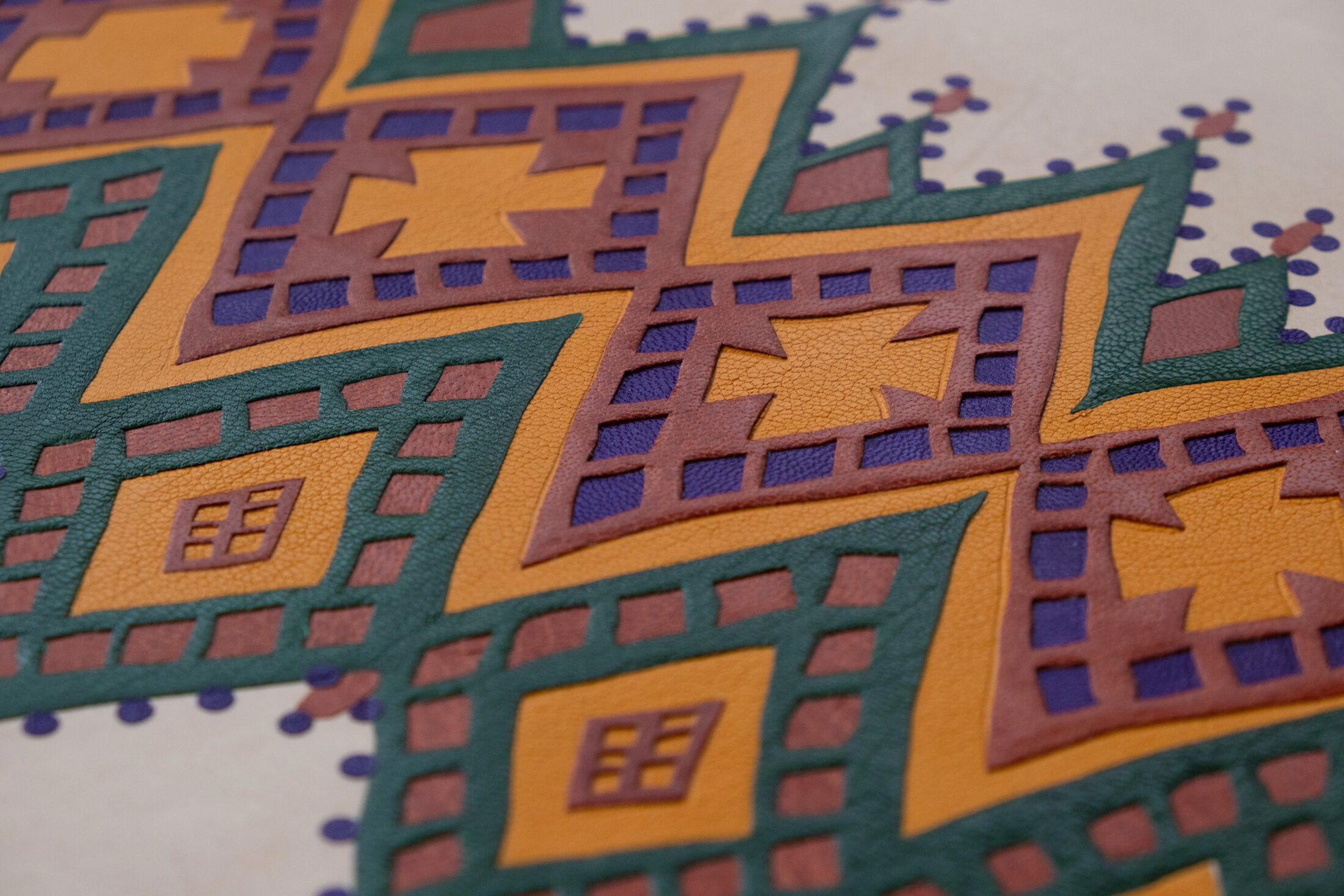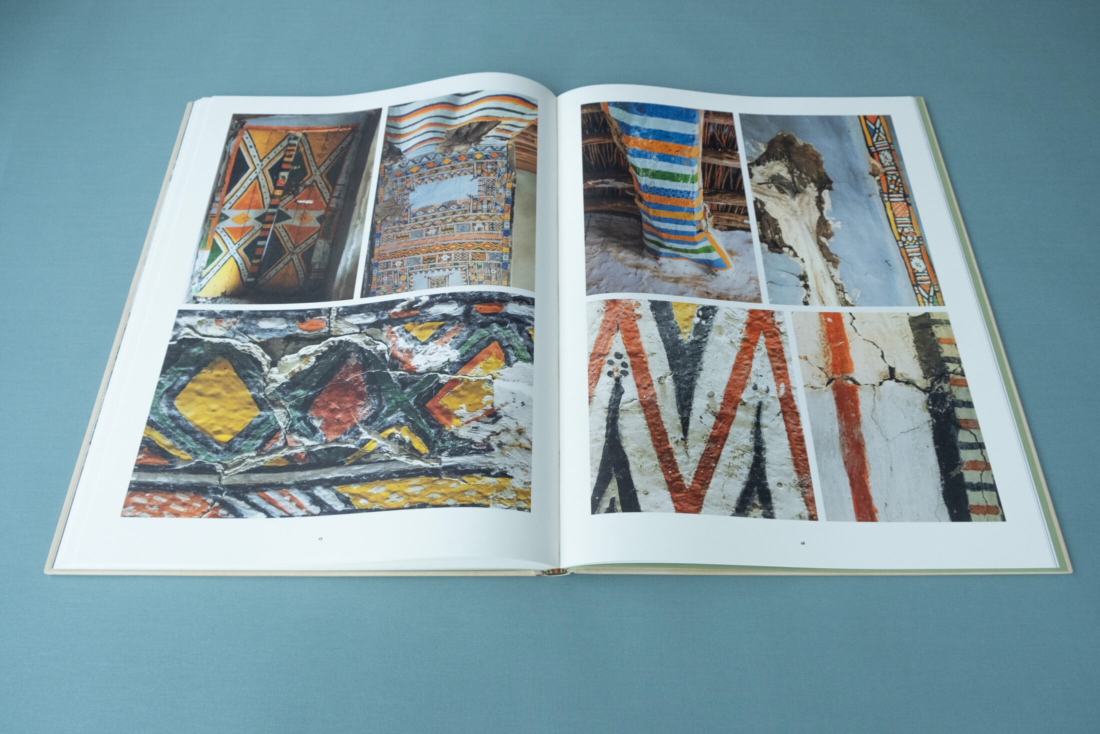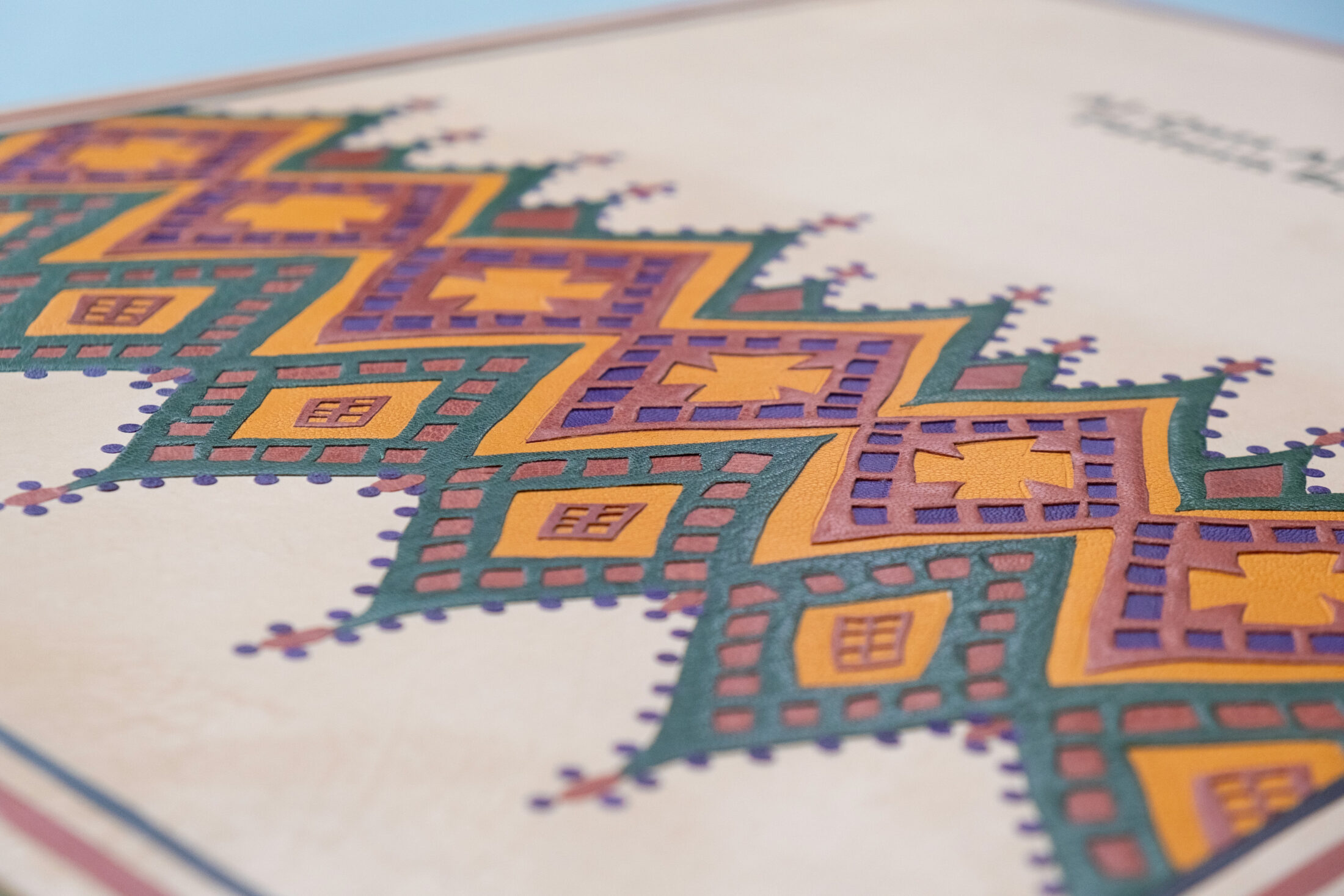 A special fine binding for a book created for Factum Arte documenting the traditional wall painting patterns from a village of Amir on the Yemeni border. One of the hand drawn designs was used in the form of leather onlays onto the front and back covers of the calfskin binding. Some of the onlays are flat to the surface and other elements raised. The title on the front and back covers is also blocked using a specialised technique involving two colours of foil. The book has hand embroidered headbands and is presented in a silk covered clamshell box.