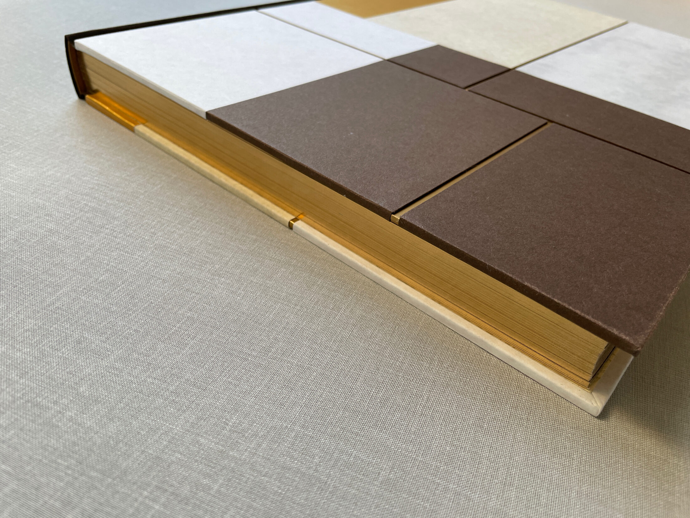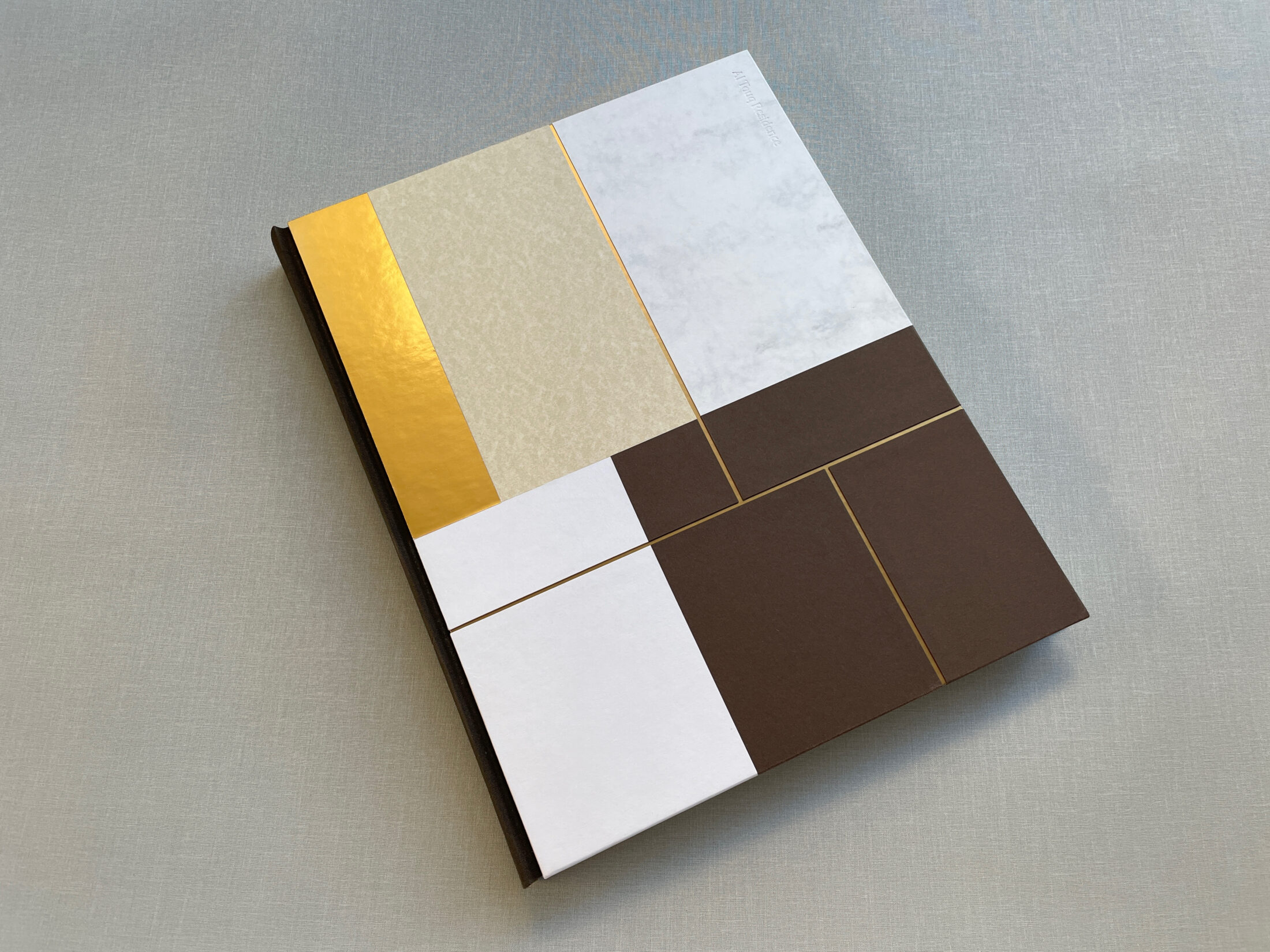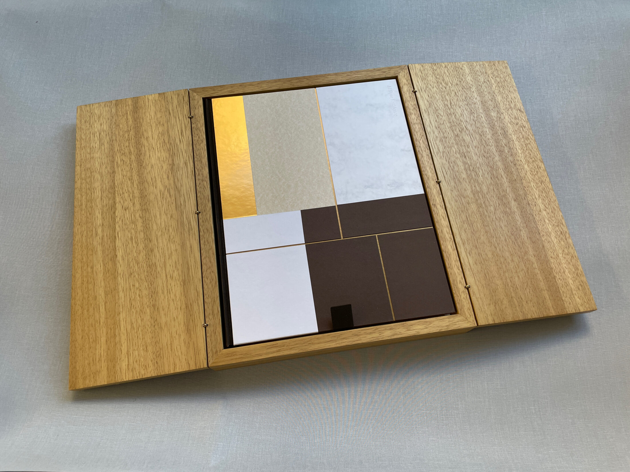 A short-run presentation book for the owners of the residence in Riyadh. Printed and bound by the Studio incorporating a series of applied panels in different materials combined with gold lines on the covers. The boxes were made from Iroko wood with inlaid lines in ebony and gold.