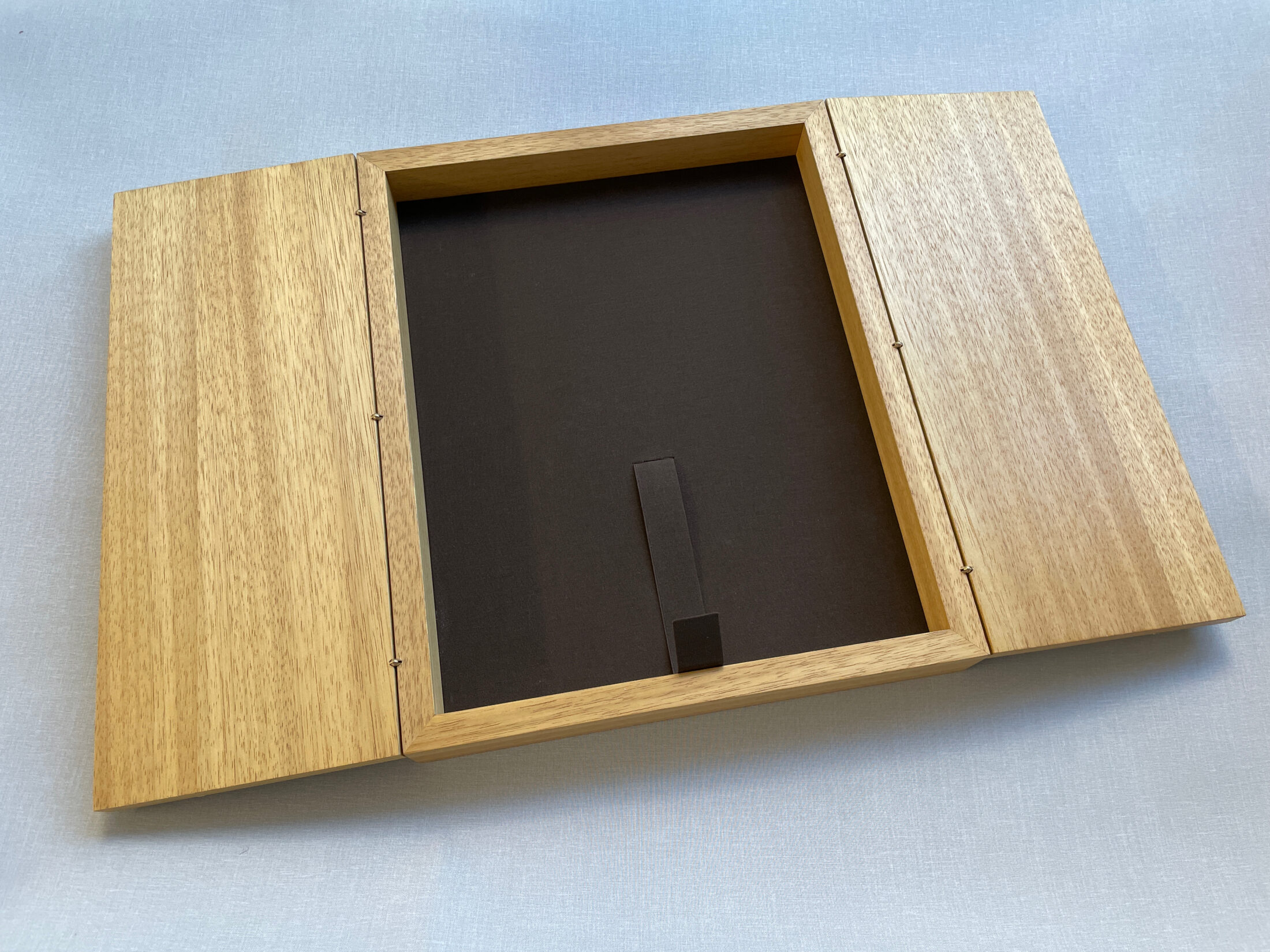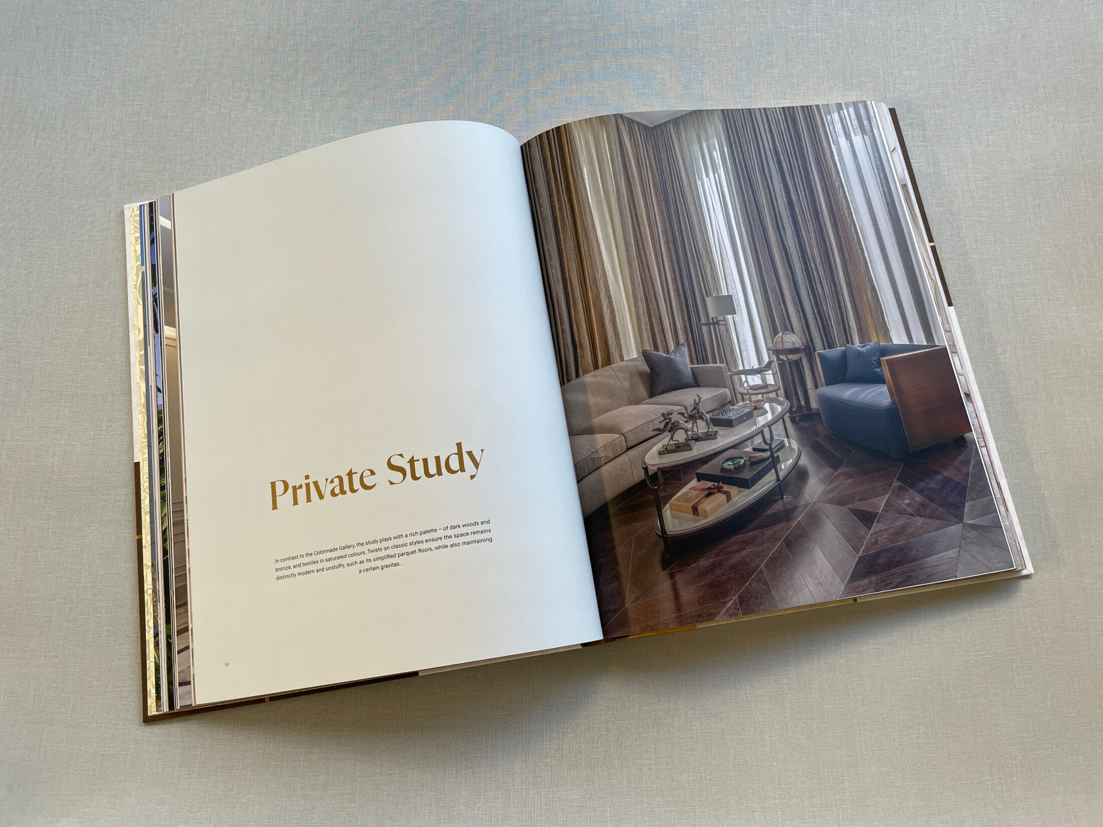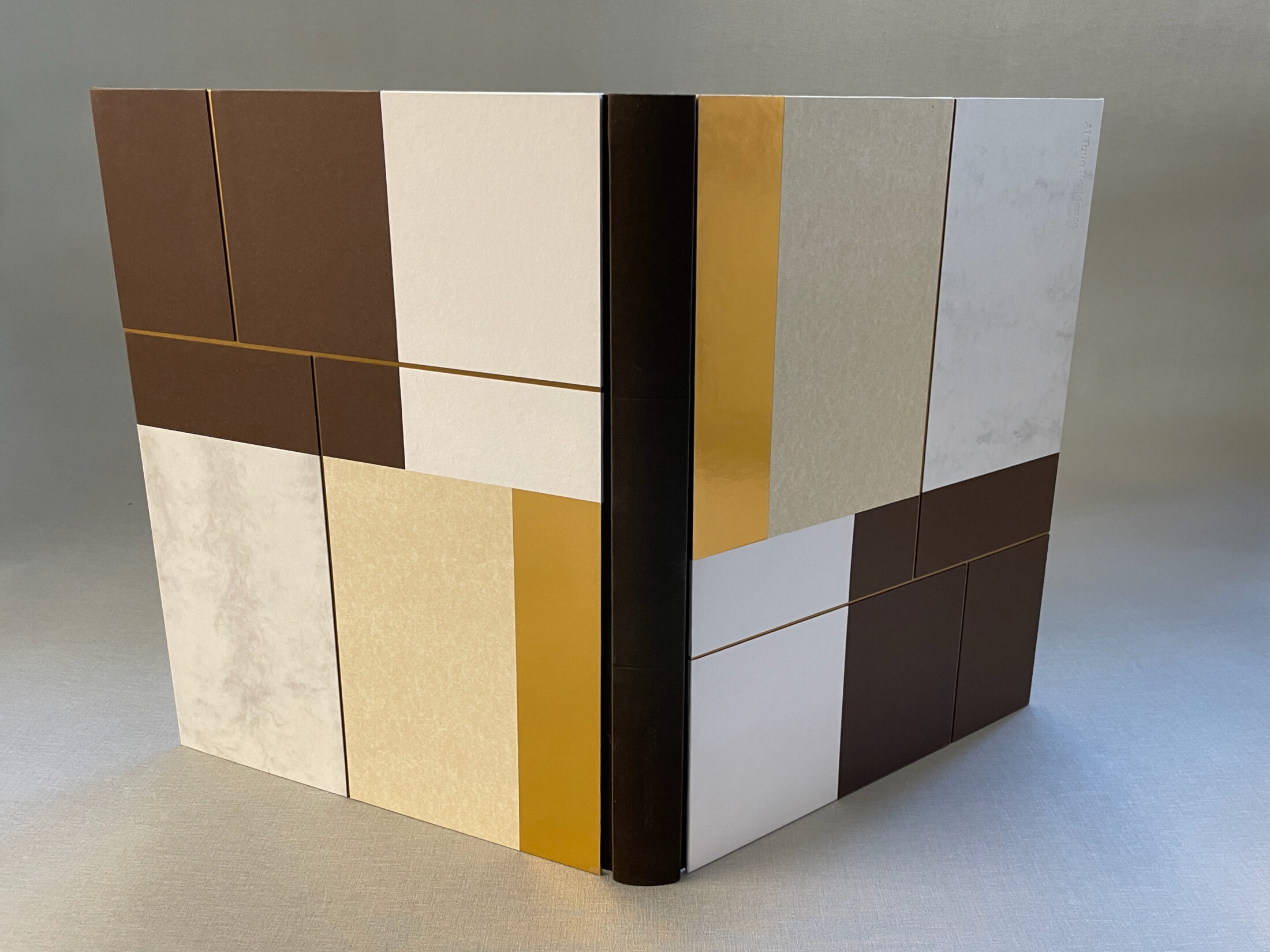 A short-run presentation book for the owners of the residence in Riyadh. Printed and bound by the Studio incorporating a series of applied panels in different materials combined with gold lines on the covers. The boxes were made from Iroko wood with inlaid lines in ebony and gold.