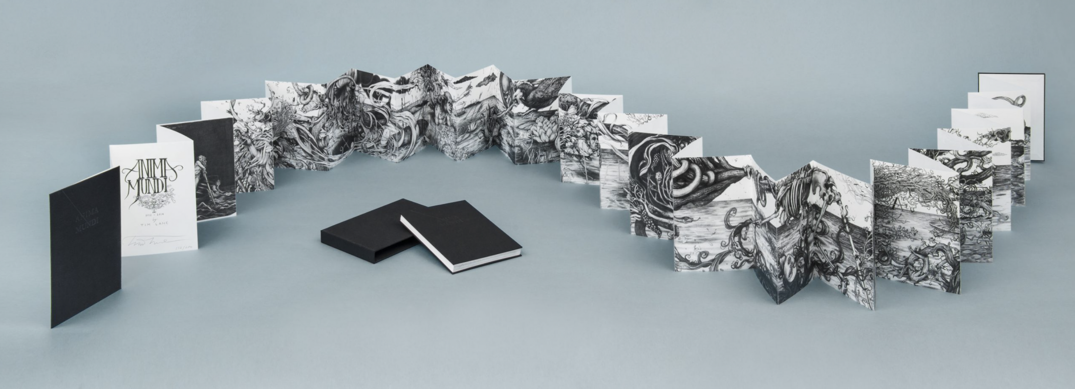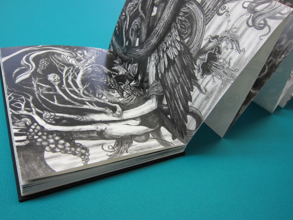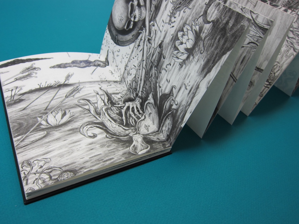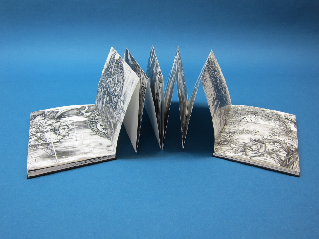 A digitally printed five metre long concertina format book containing the artist’s pencil drawings. The black bookcloth cover is blind debossed with the title and each book is housed in a card sleeve.