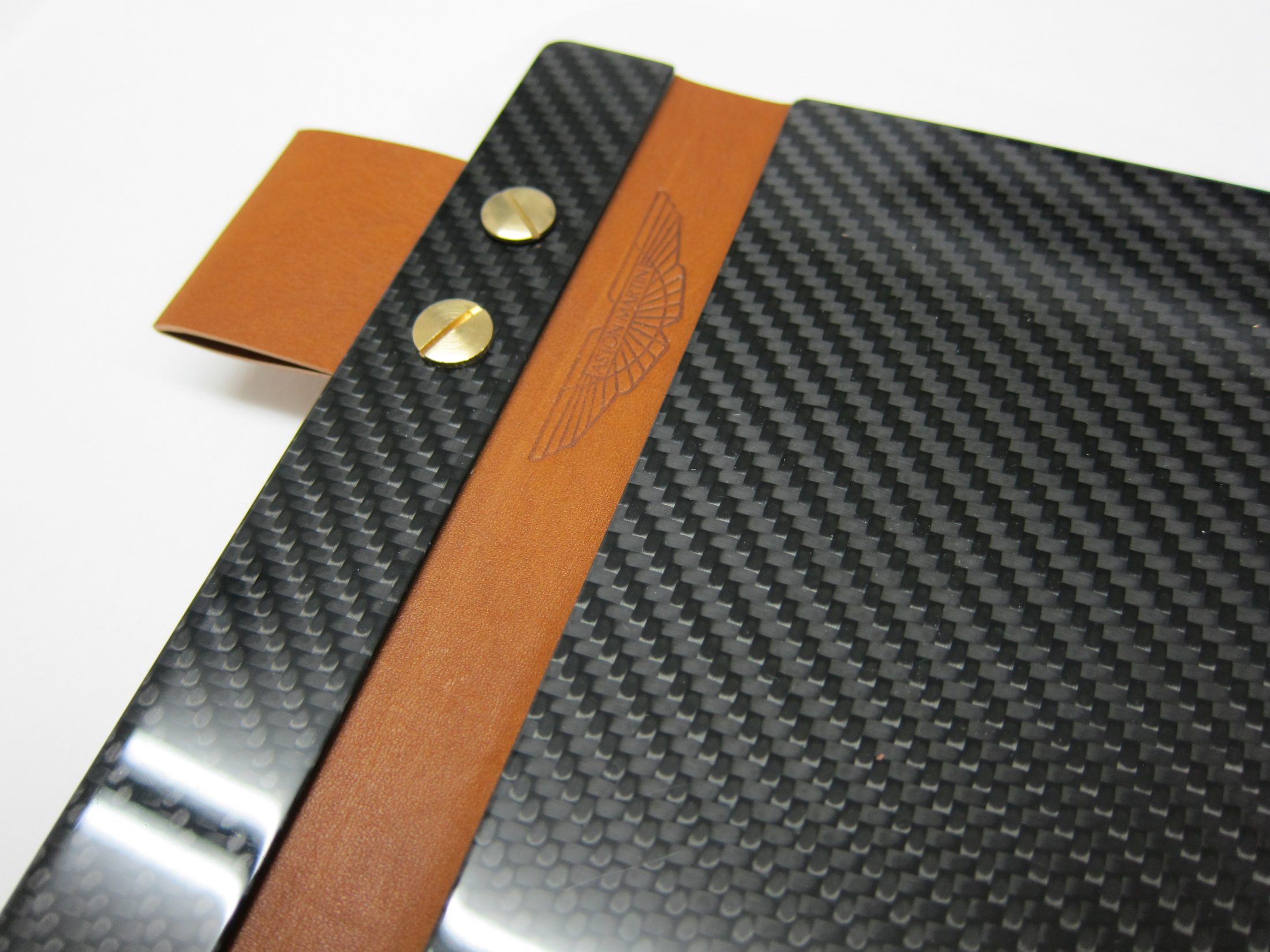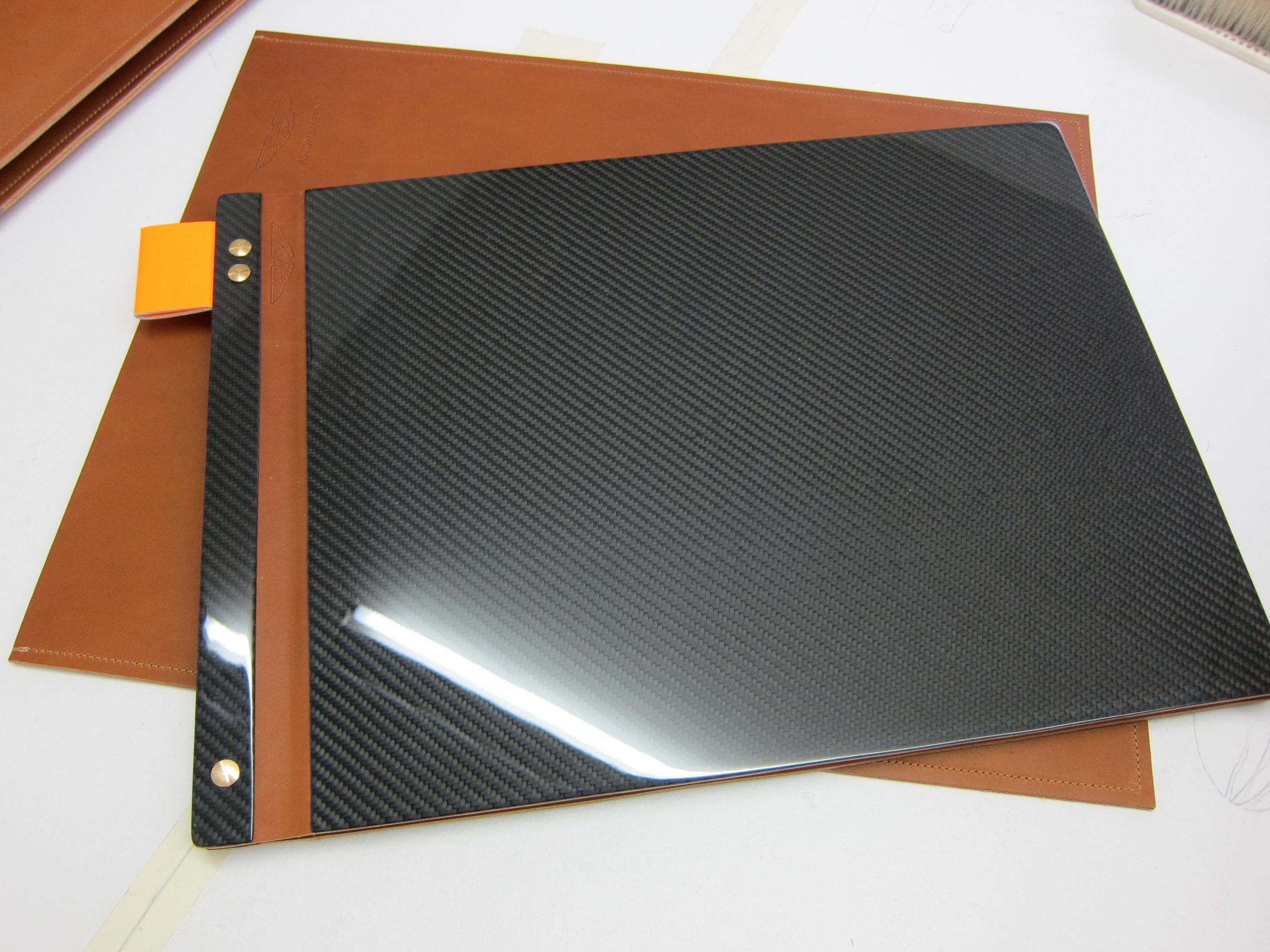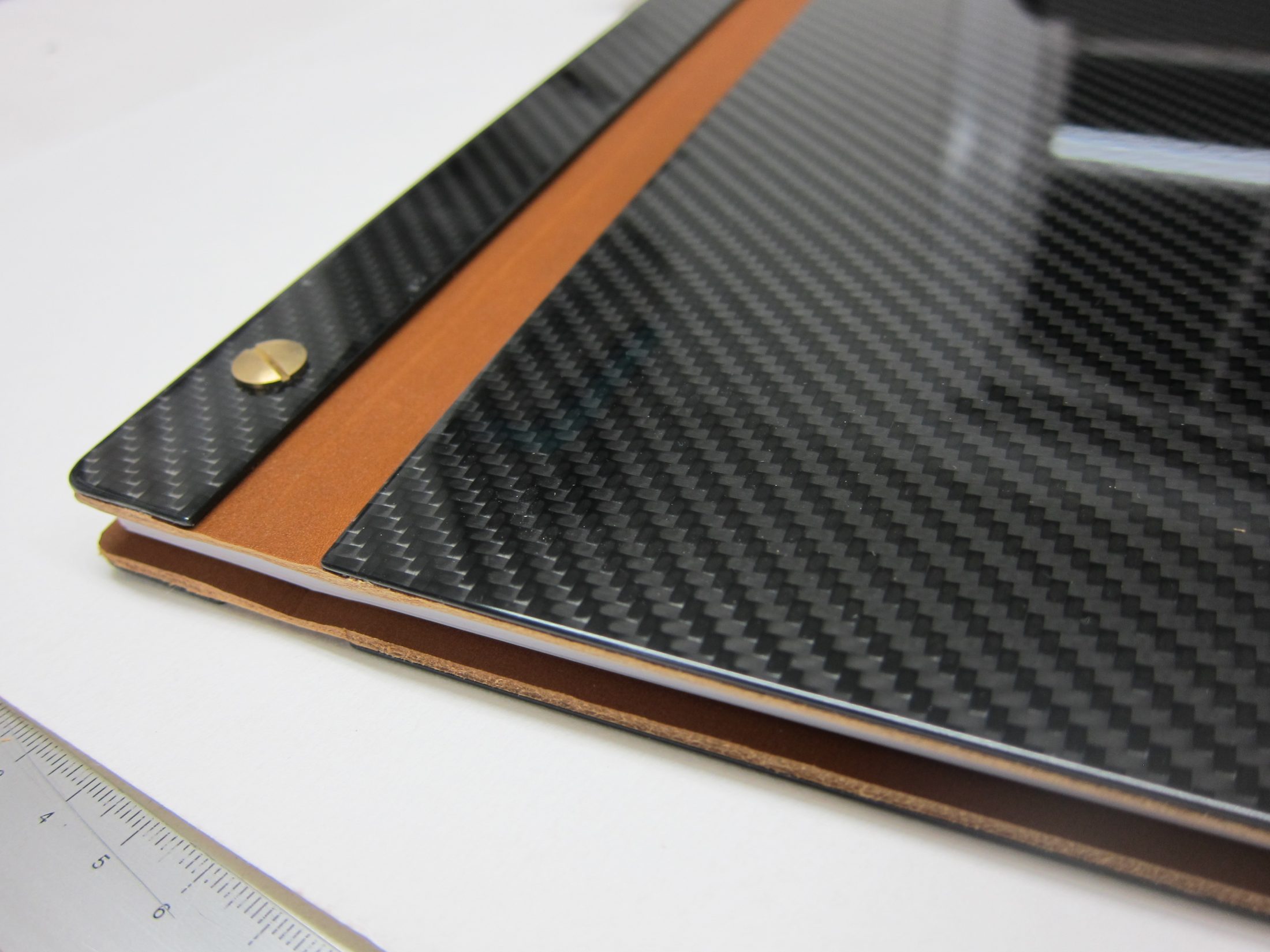Post bound presentation book made using carbon fibre covers that are lined and finished with leather. The book is housed in a leather pouch with a blind debossed logo.
