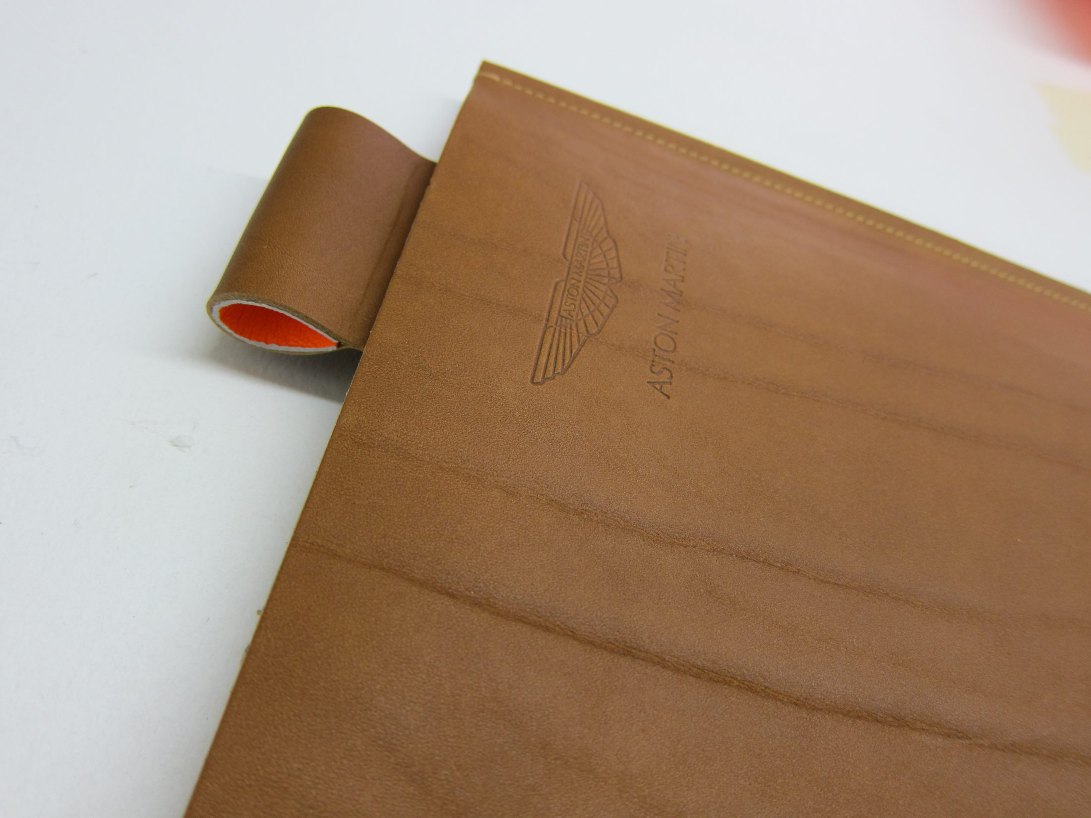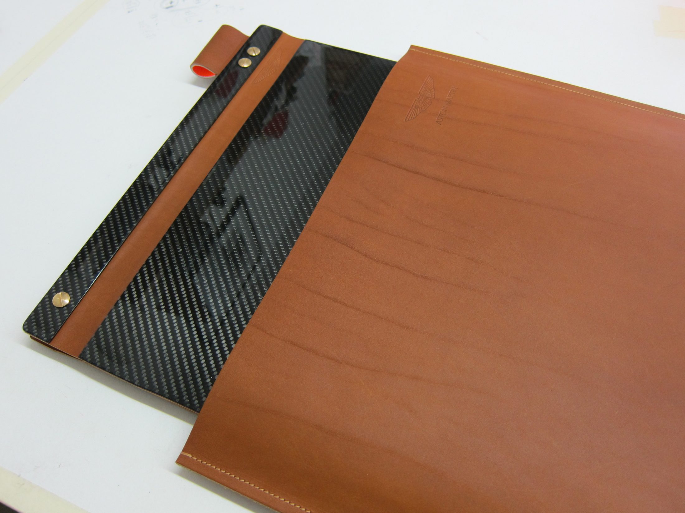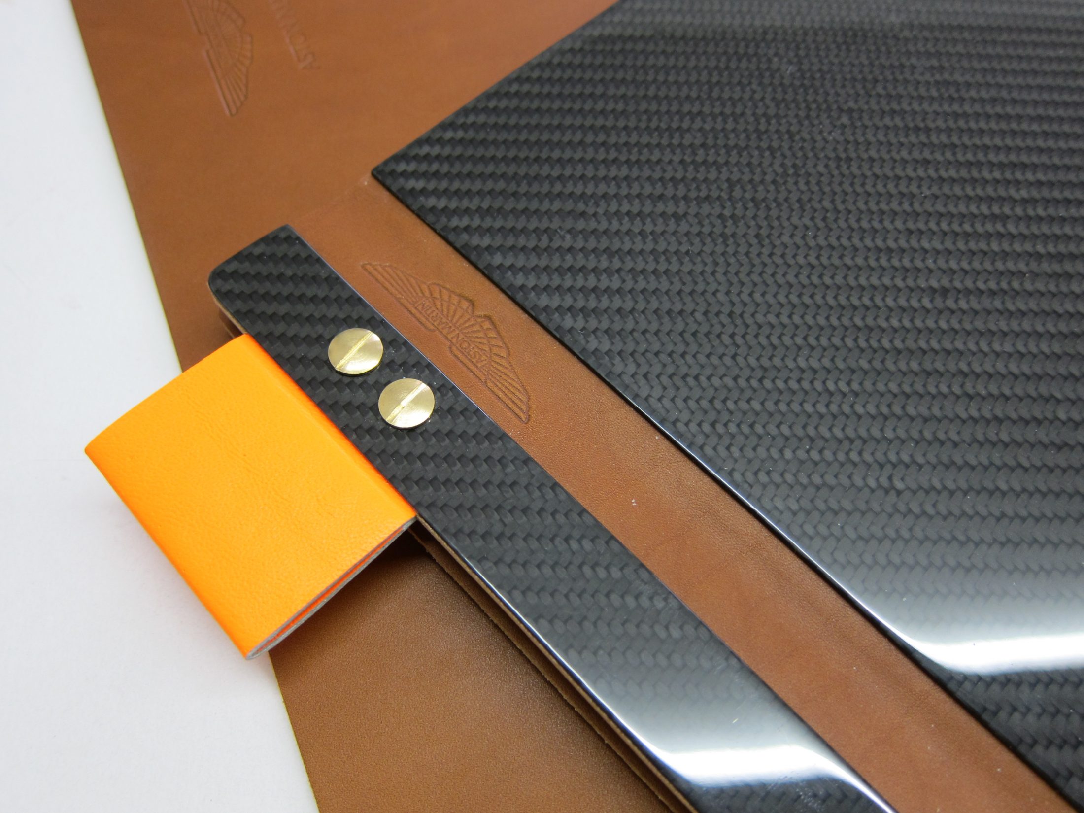 Post bound presentation book made using carbon fibre covers that are lined and finished with leather. The book is housed in a leather pouch with a blind debossed logo.