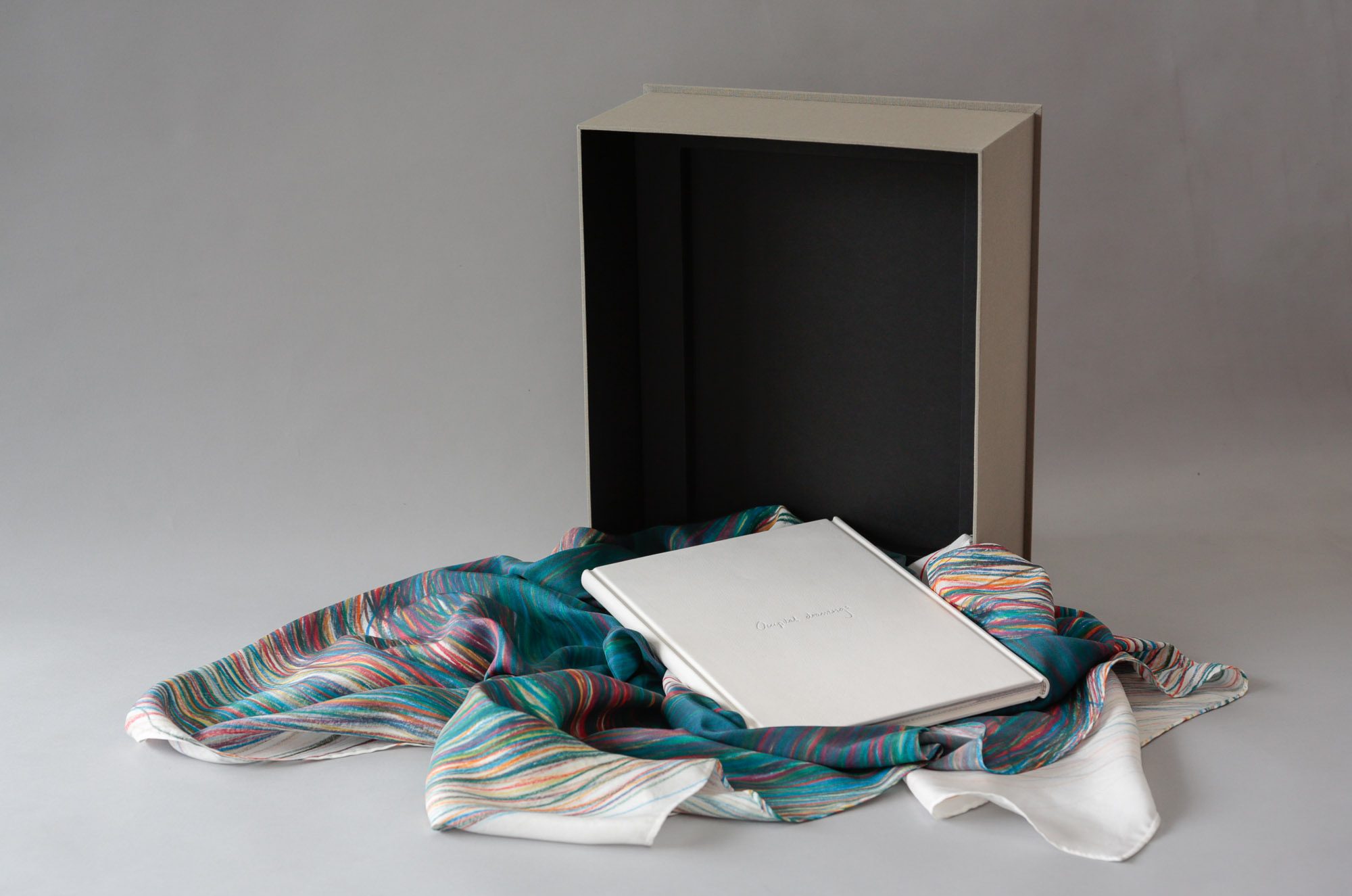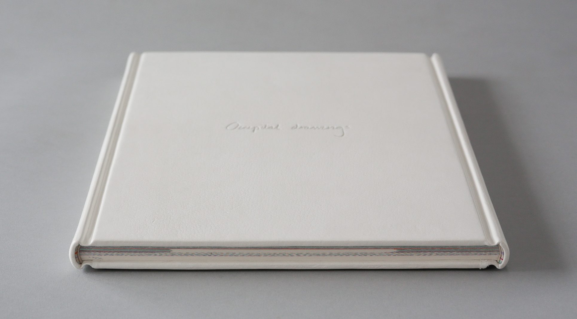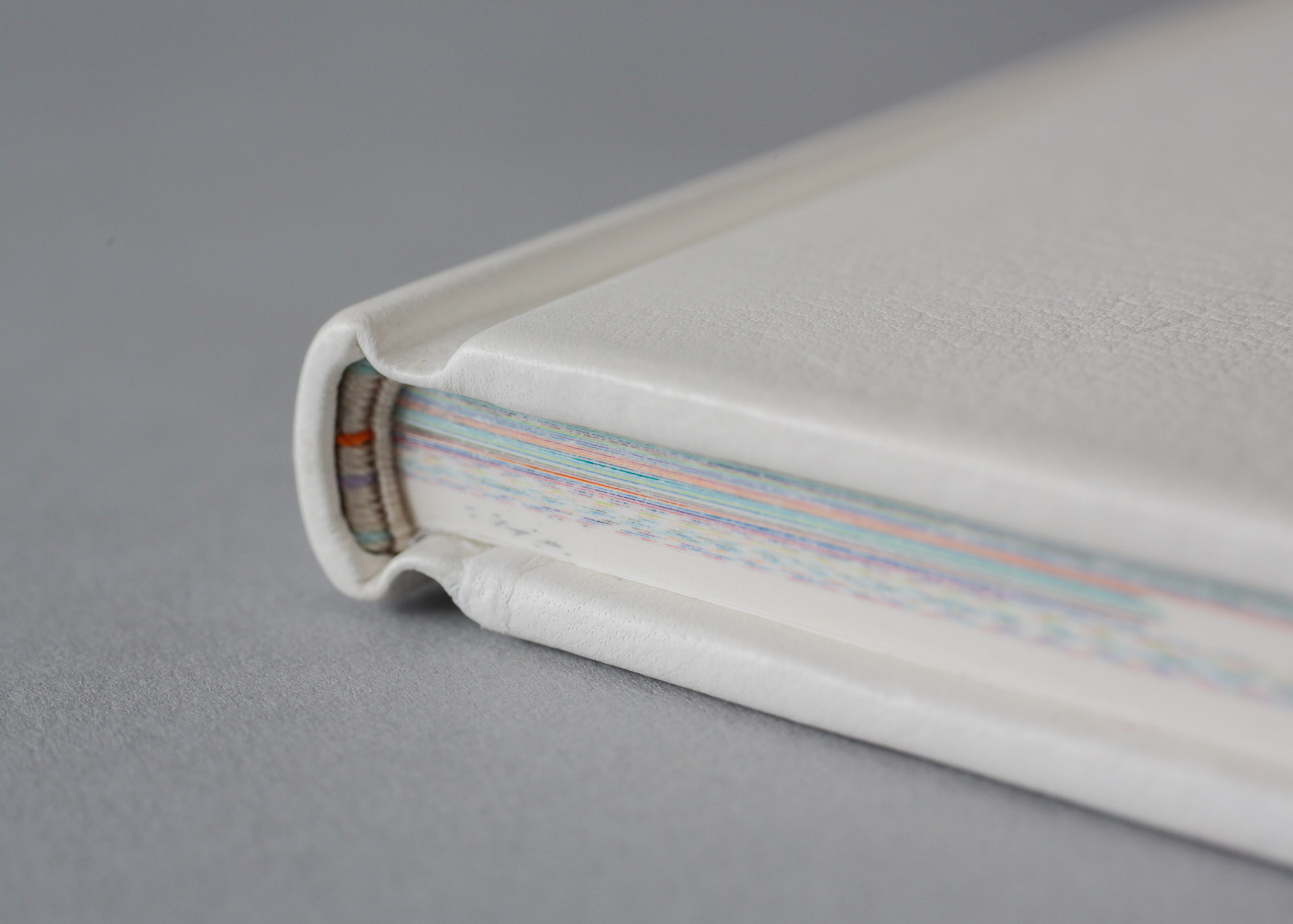Two books bound as one with two separate spines, containing text and drawings never to be seen. Bound in alum tawed goatskin with an invisible join, and hand embroidered silk headbands. Housed in a cloth covered case.