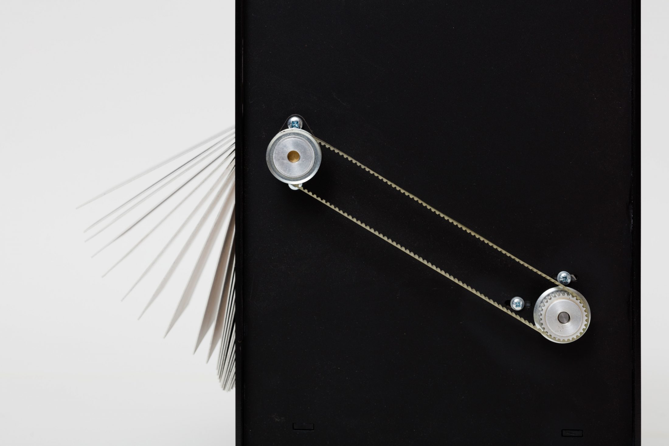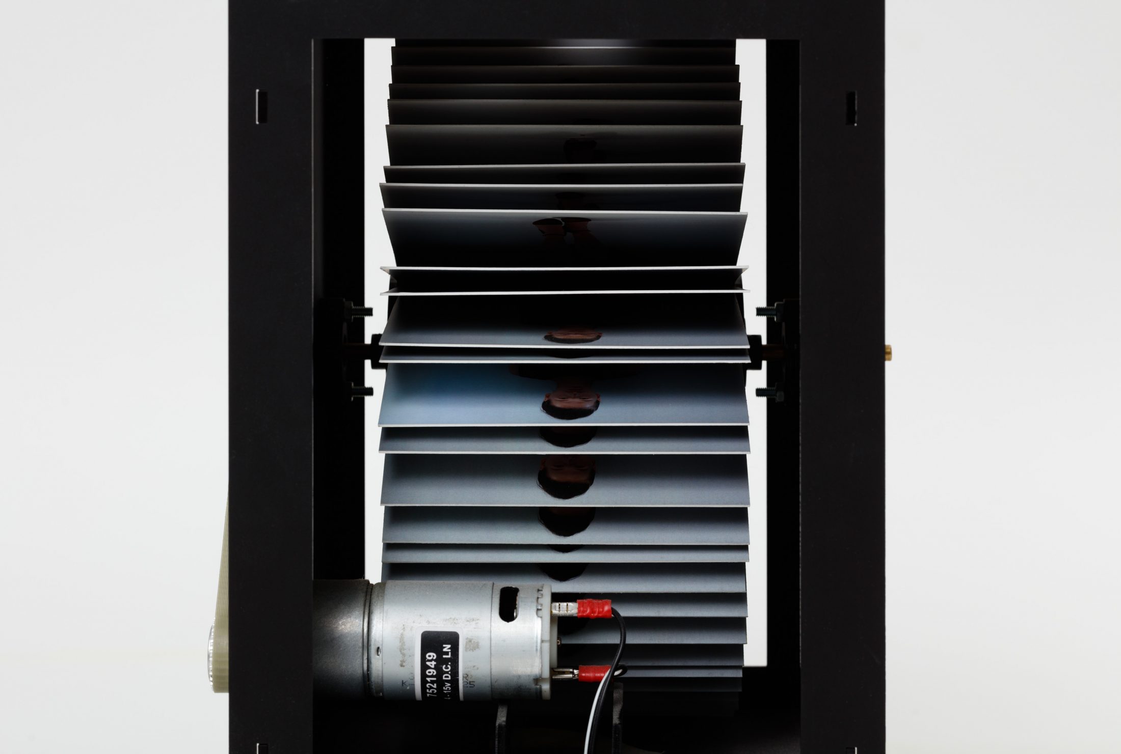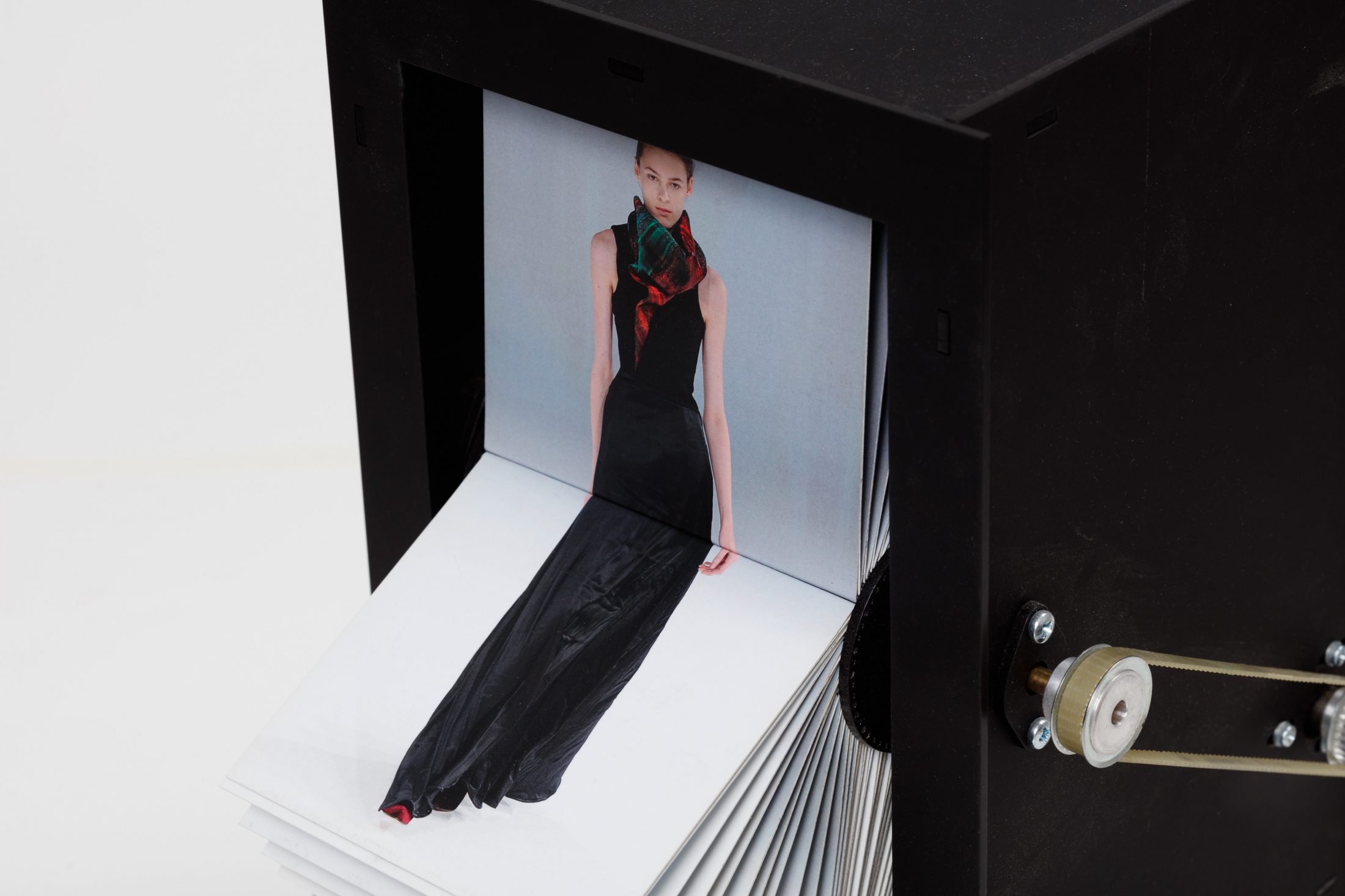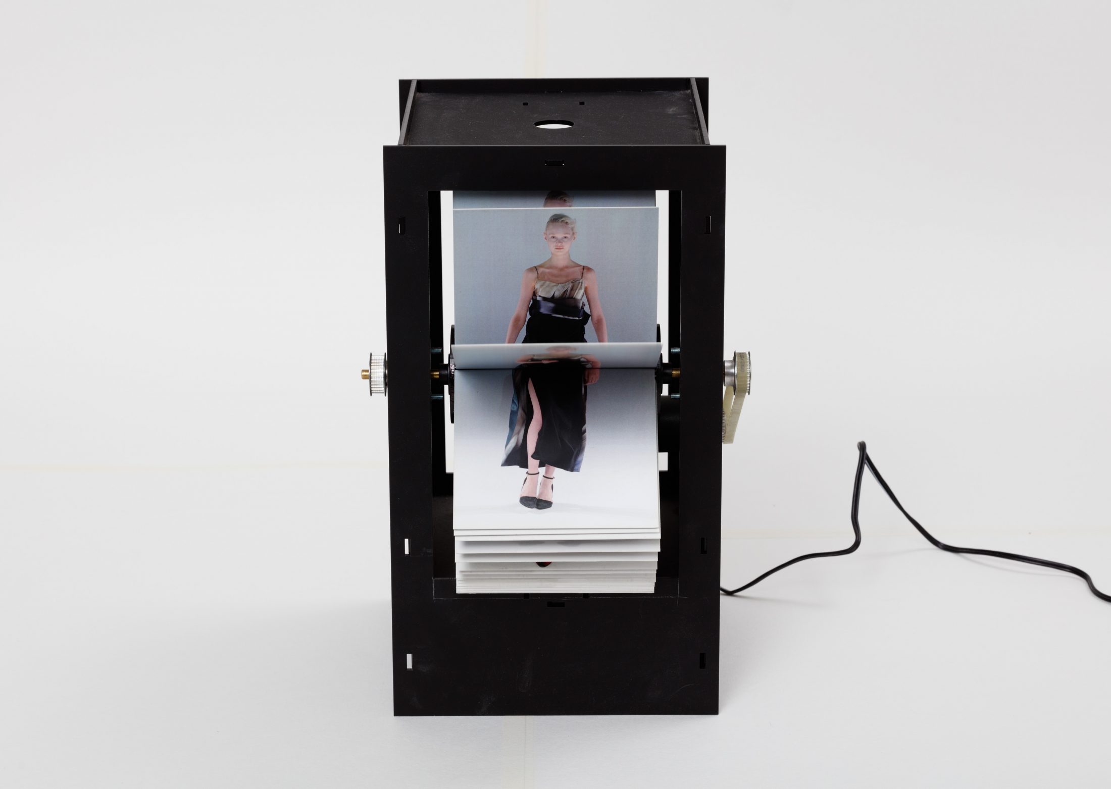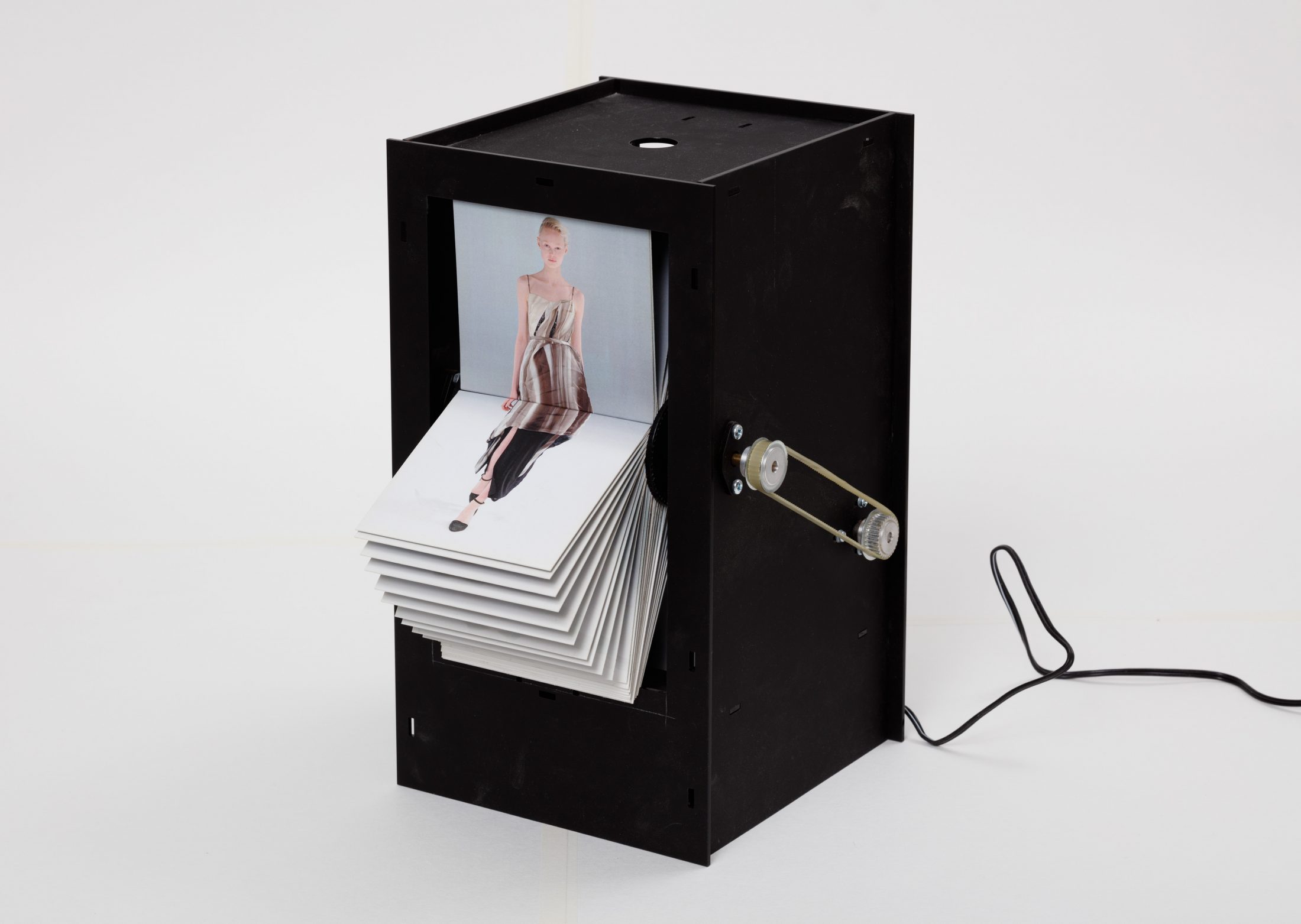 Automated flick book displaying a catwalk show by the designer. The pages contained on the loop turn automatically with an adjustable speed control. The outer casing shows the working structure but this would normally be housed in an outer covering.