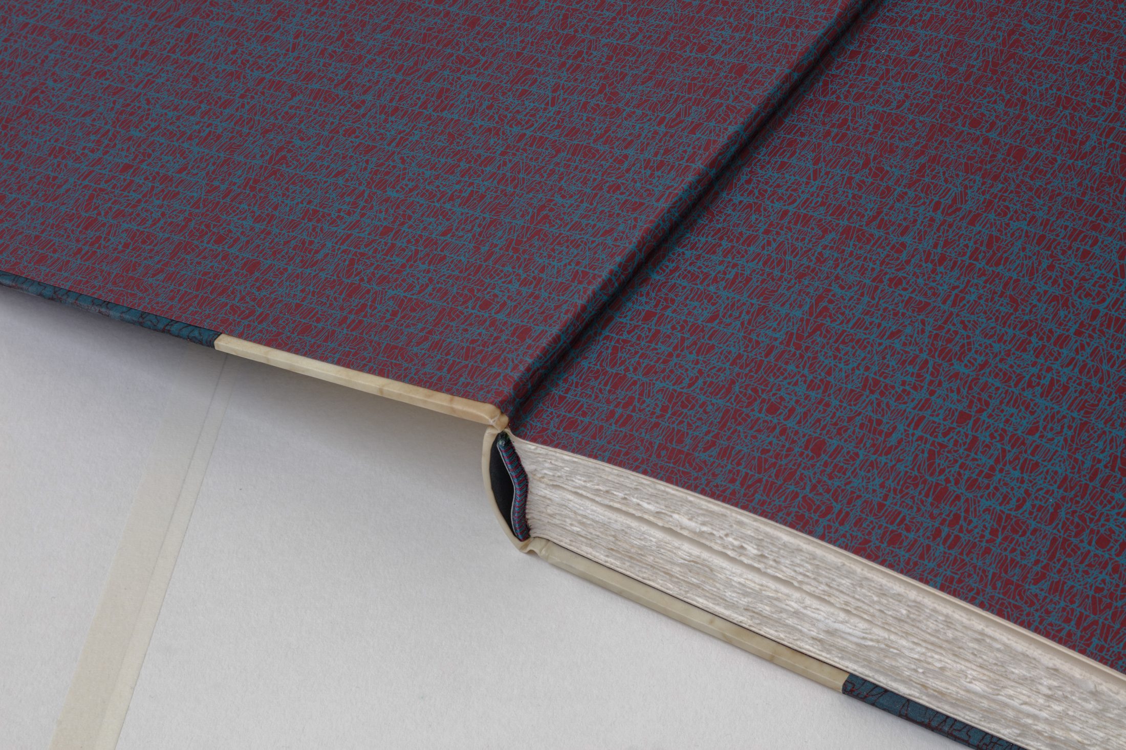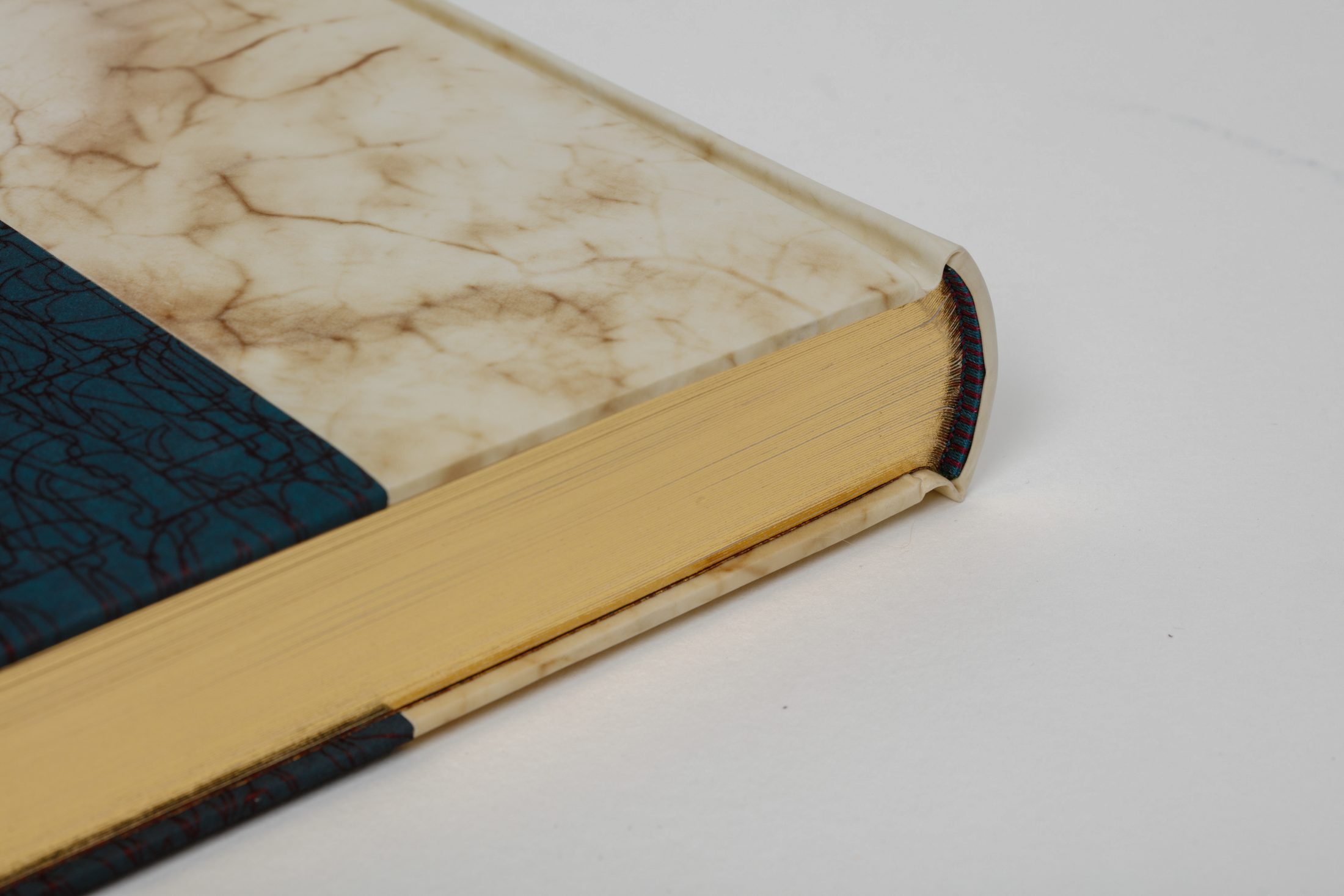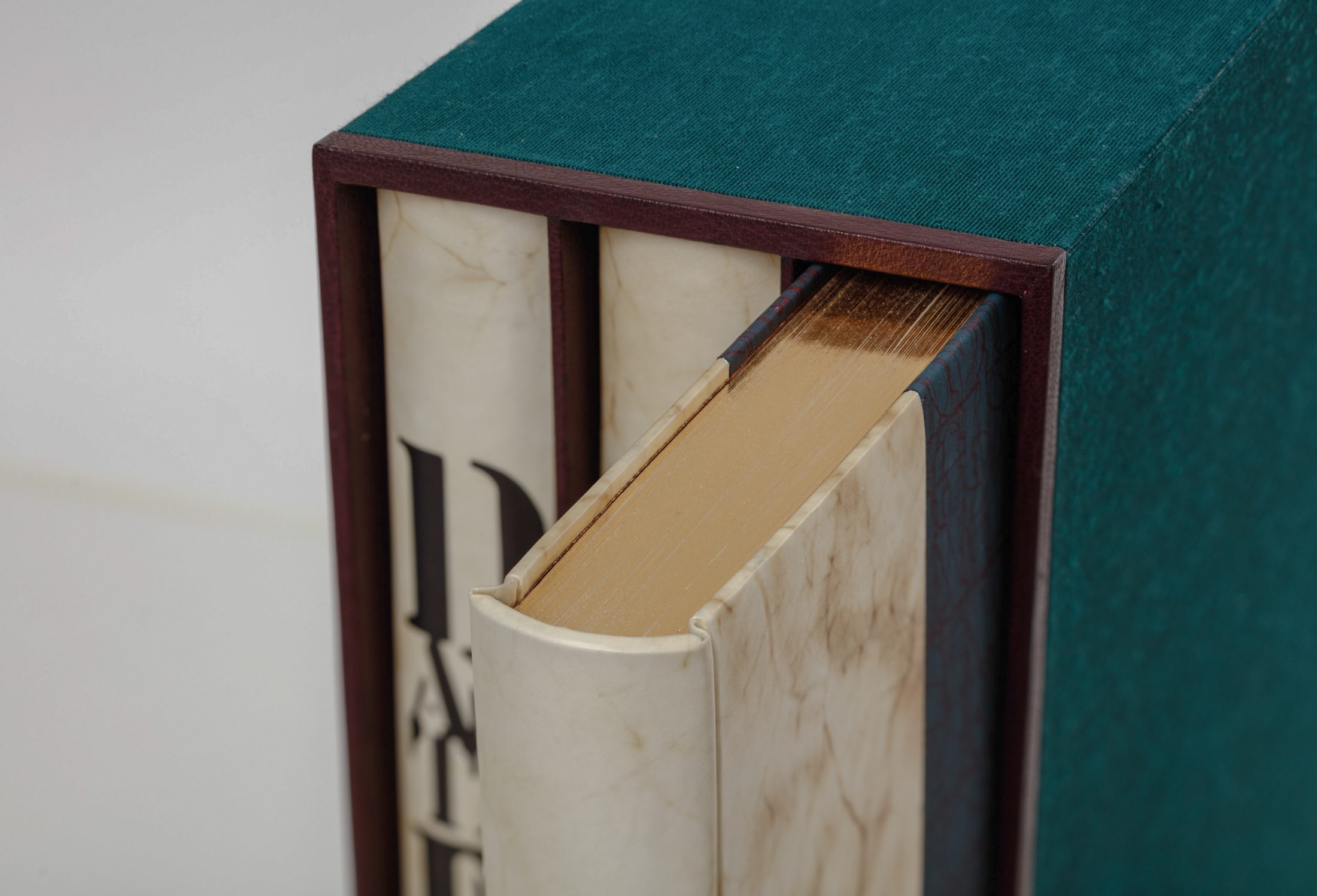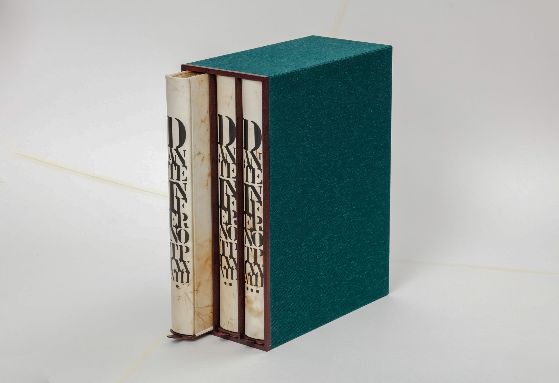 This version of the three volume set was bound in vellum with printed silk sides designed by the artist. The books have embroidered headbands, gilded top edges, and the spine lettering is hand painted in Indian ink. The set is presented in a cloth covered, three compartment slipcase with a leather covered open edge. The books are placed on sliders for easy removal from the case.