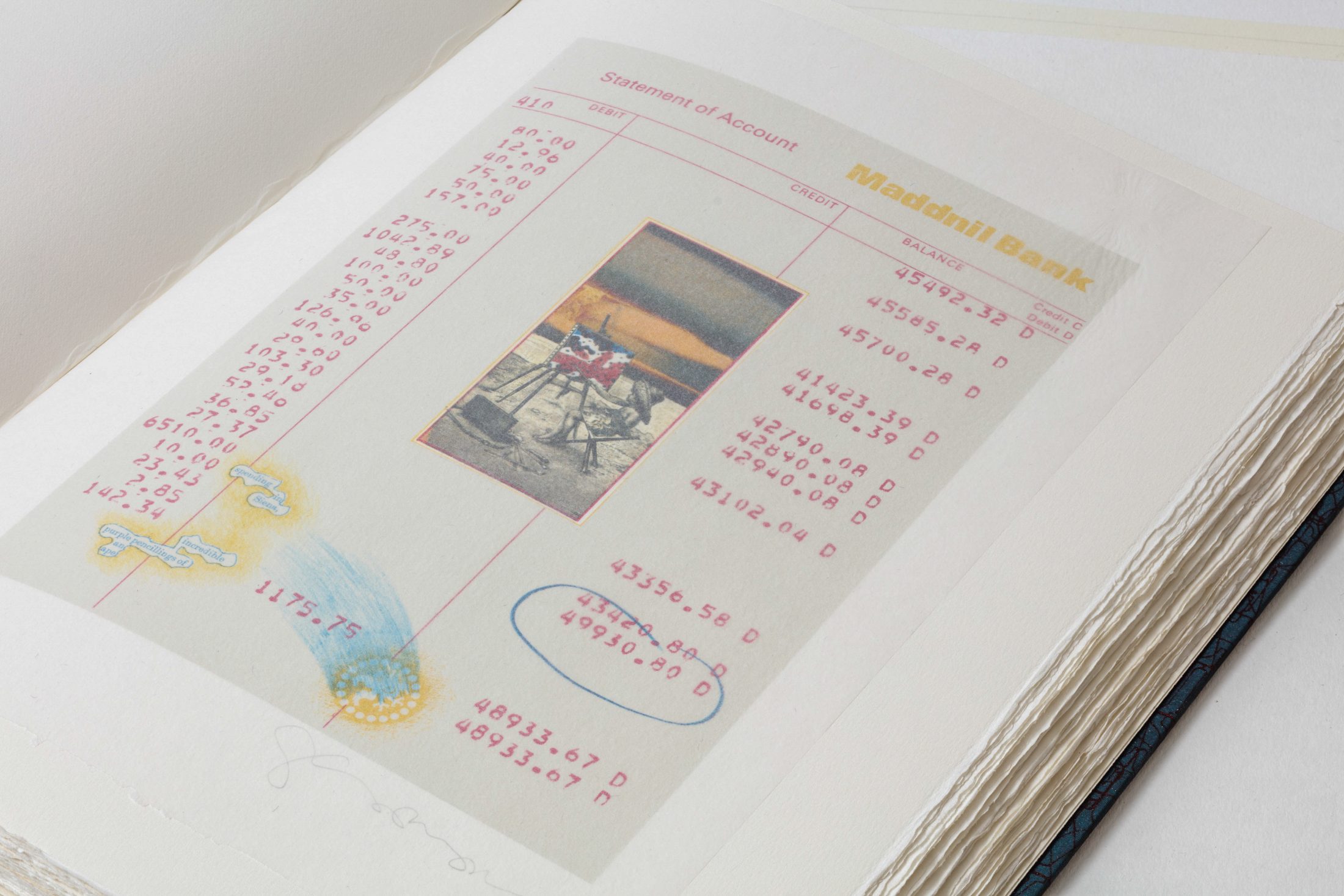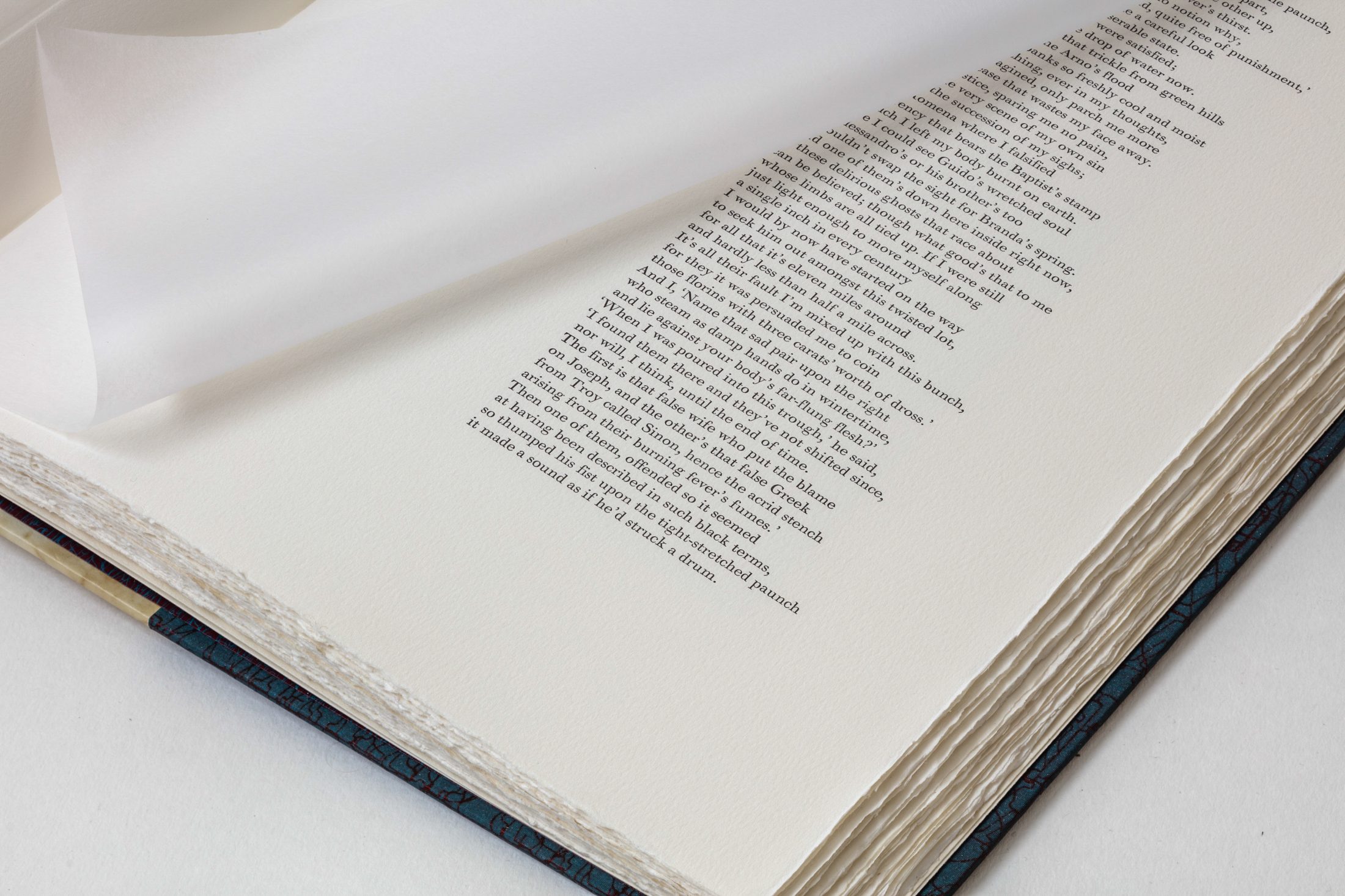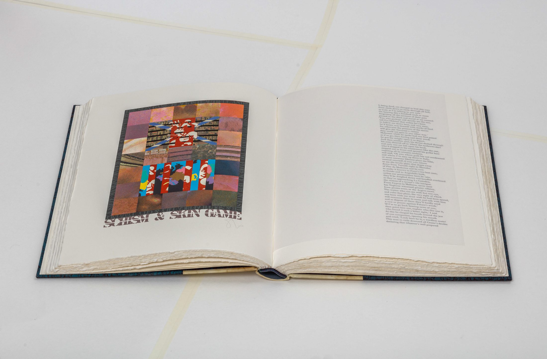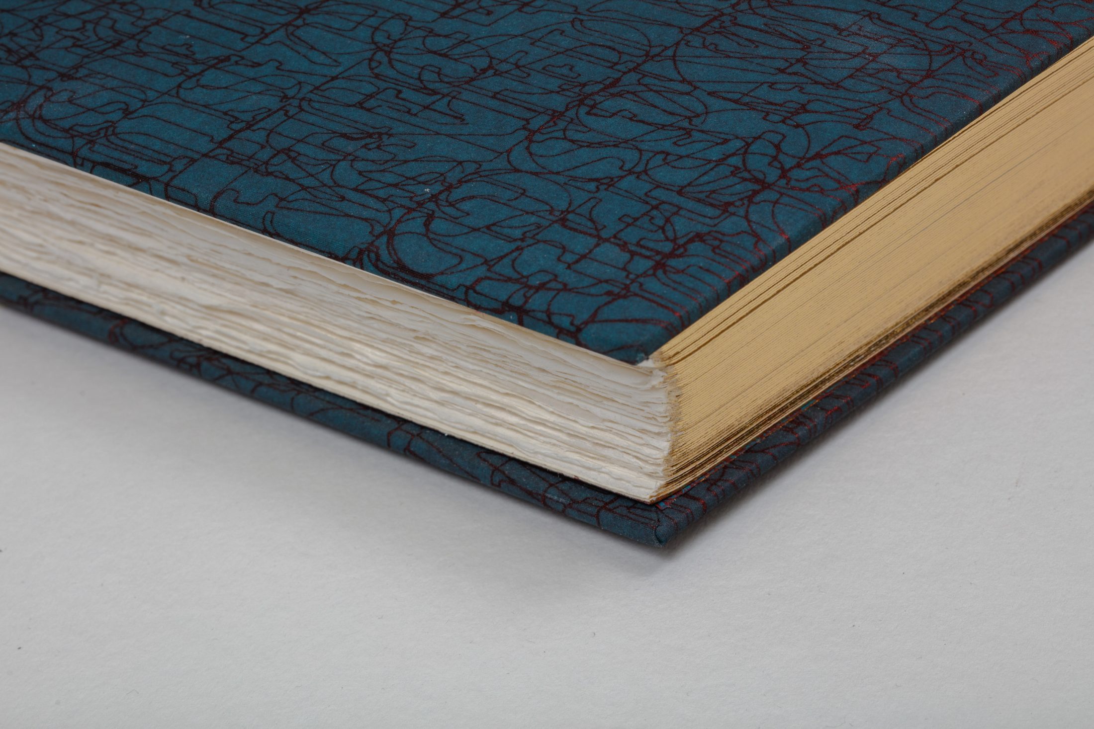 This version of the three volume set was bound in vellum with printed silk sides designed by the artist. The books have embroidered headbands, gilded top edges, and the spine lettering is hand painted in Indian ink. The set is presented in a cloth covered, three compartment slipcase with a leather covered open edge. The books are placed on sliders for easy removal from the case.