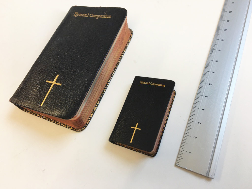 A miniature facsimile Bible created as a film prop at a quarter of the size of the larger original on the left hand side in the photograph. Certain pages were reproduced inside the book, and the edges of the pages were coloured, gilded and distressed to perfectly replicate the original.