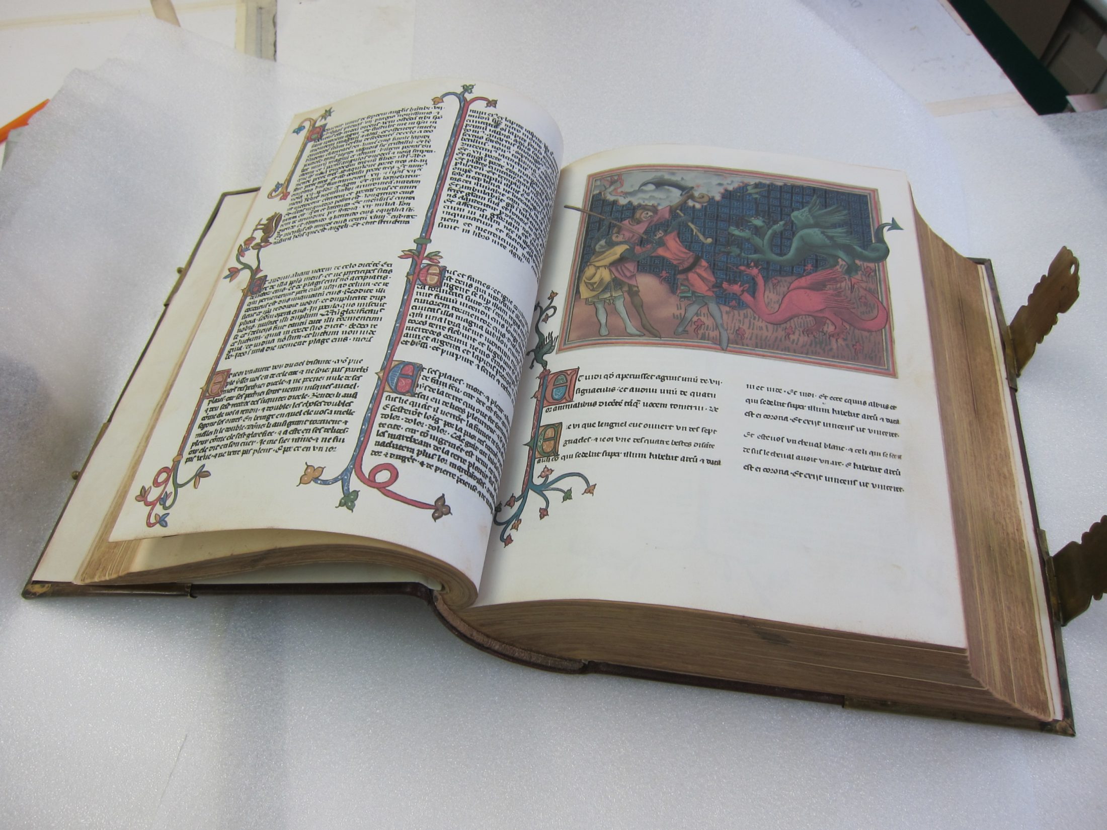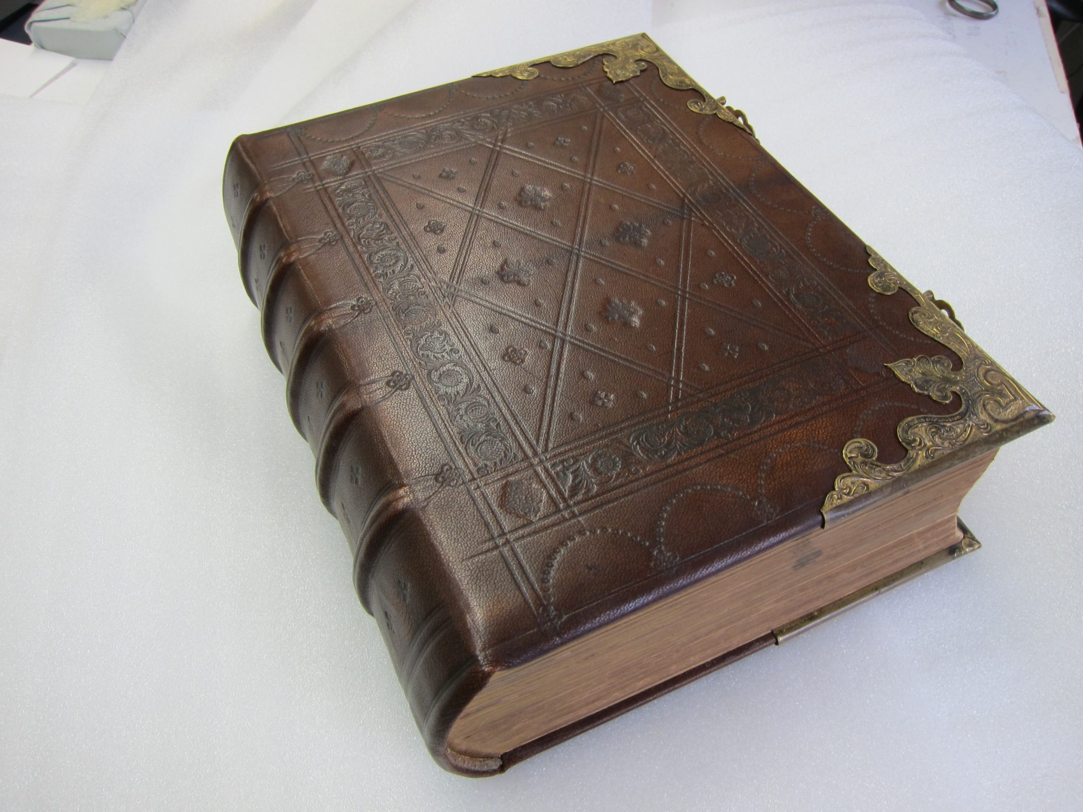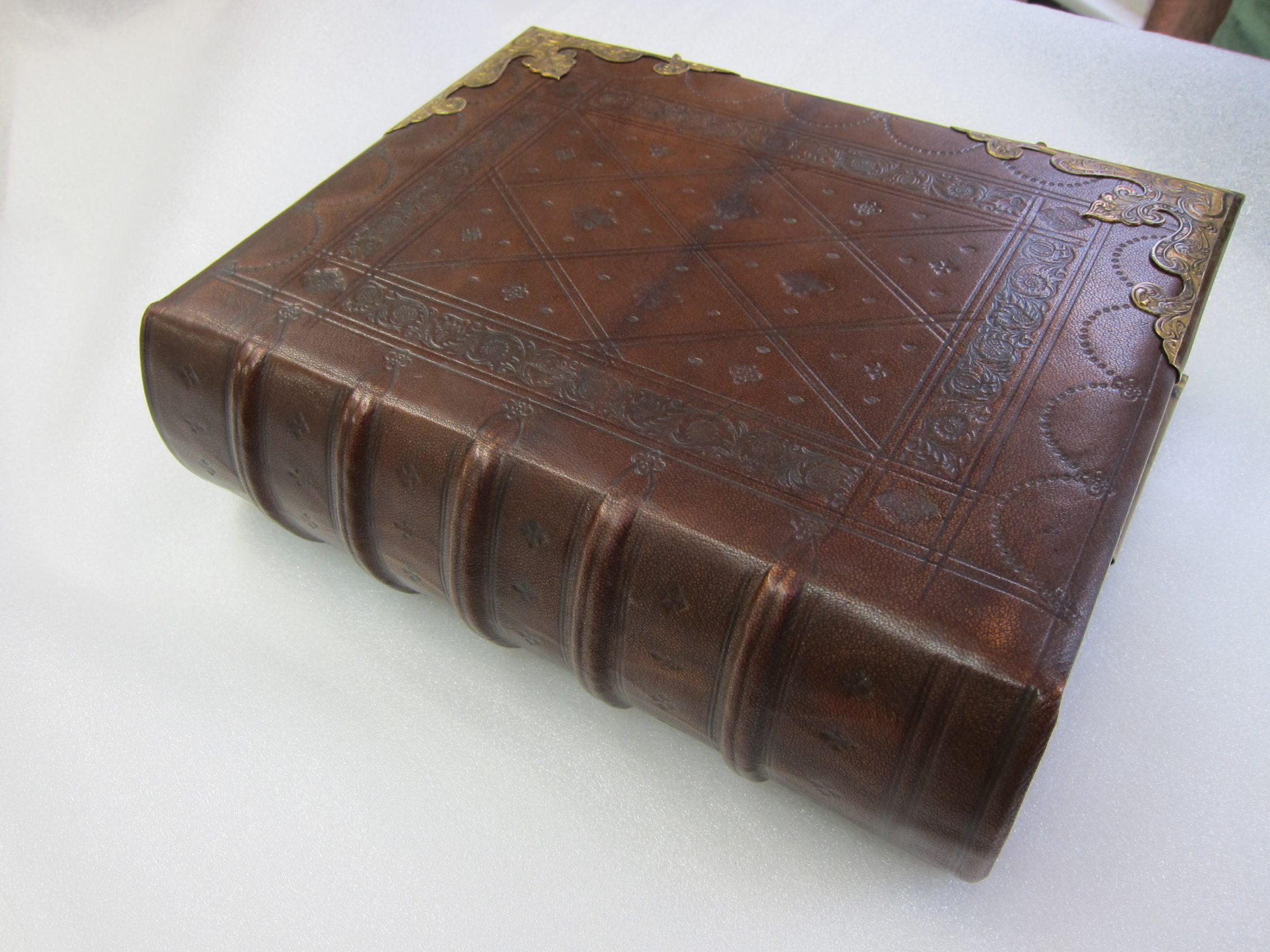 A dyed sheepskin bound book with decorative metal corners and foredge clasp created as a film prop. Hand tooled covers and spine replicating the original style. A selection of printed pages are included inside the book, and the edges are aged with pigment.