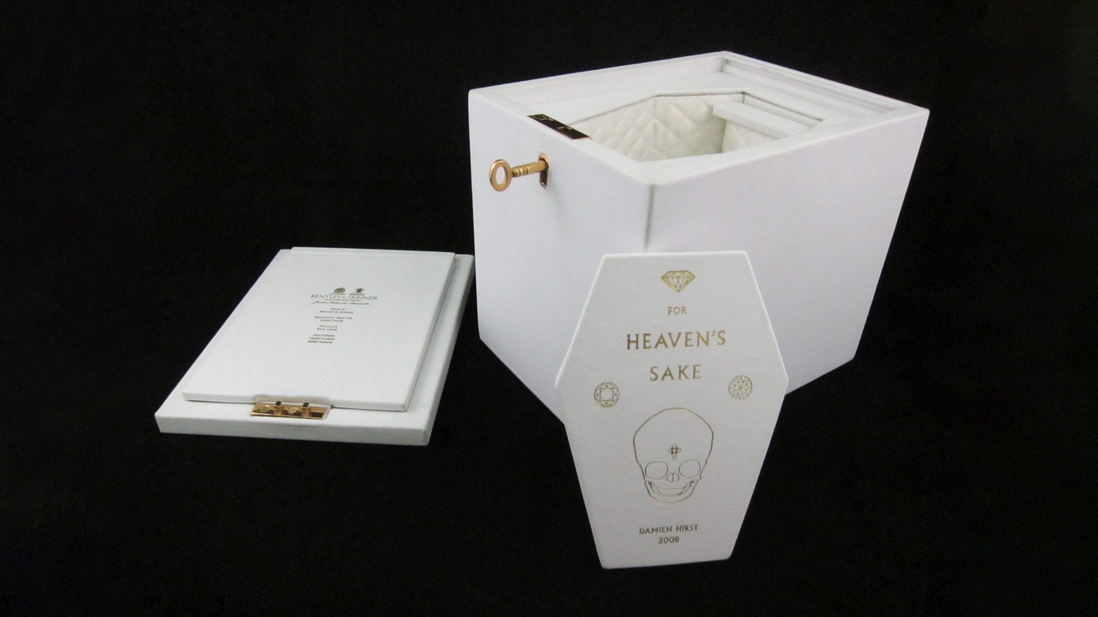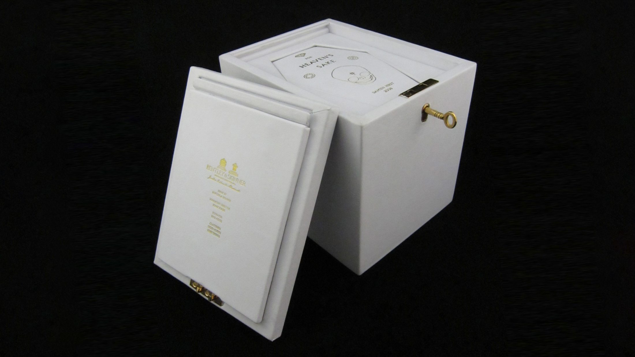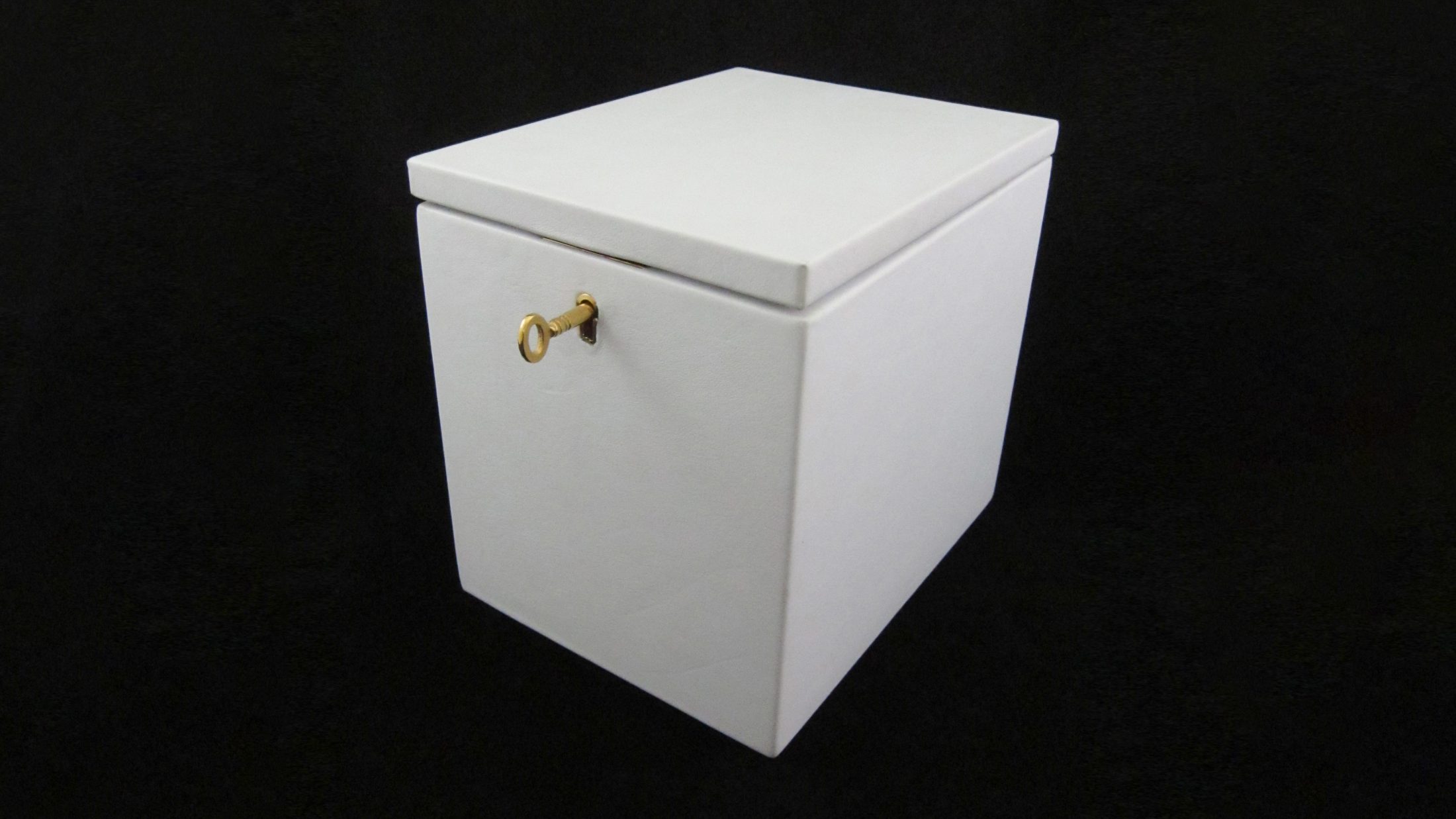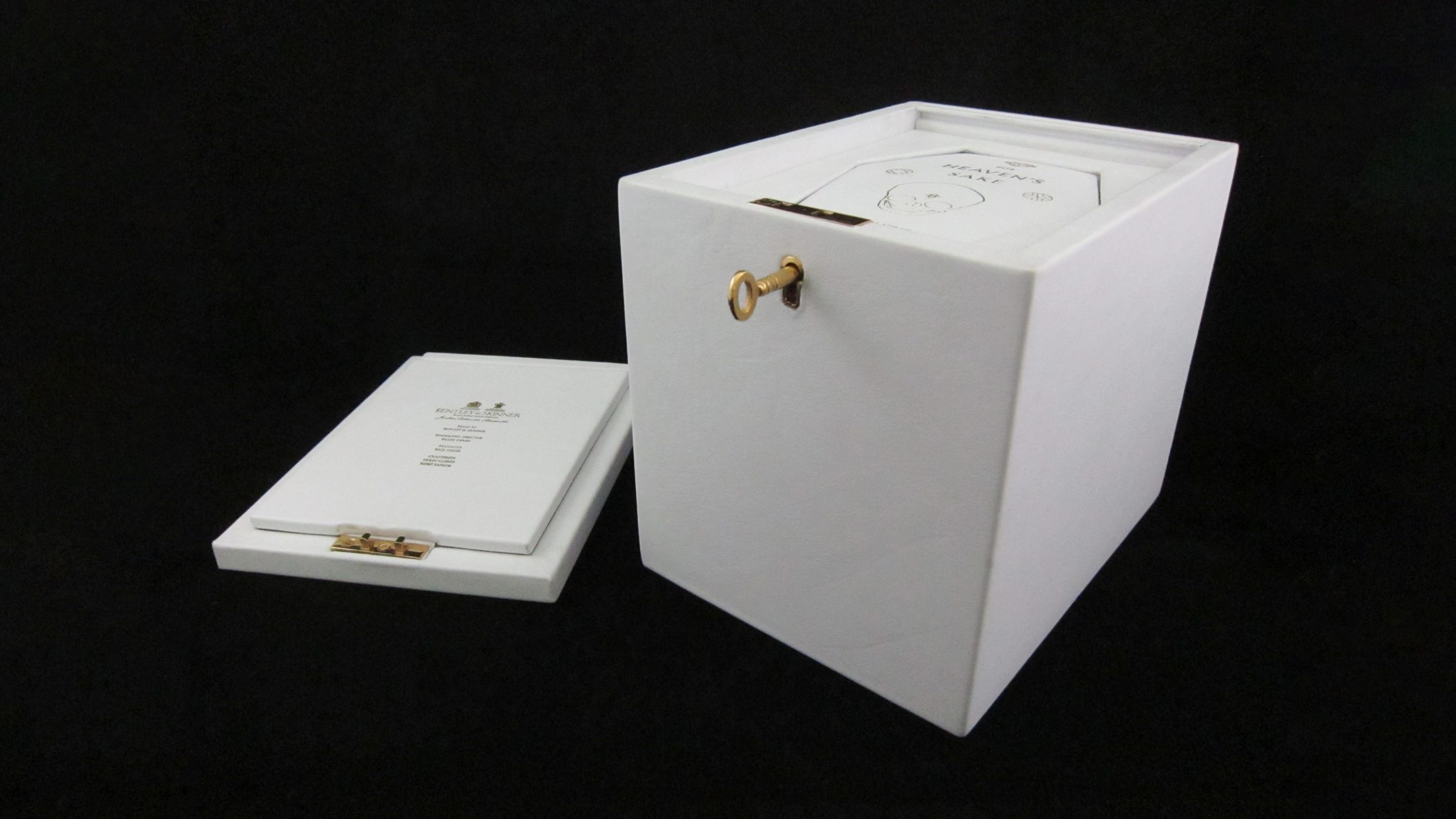 A white leather covered box over a solid wooden core with separate locking lid. The skull itself sits on the leather and quilted silk cradle for easy removal from the box. The walls are lined with quilted silk padding and the interior features gold foil blocked leather panels.