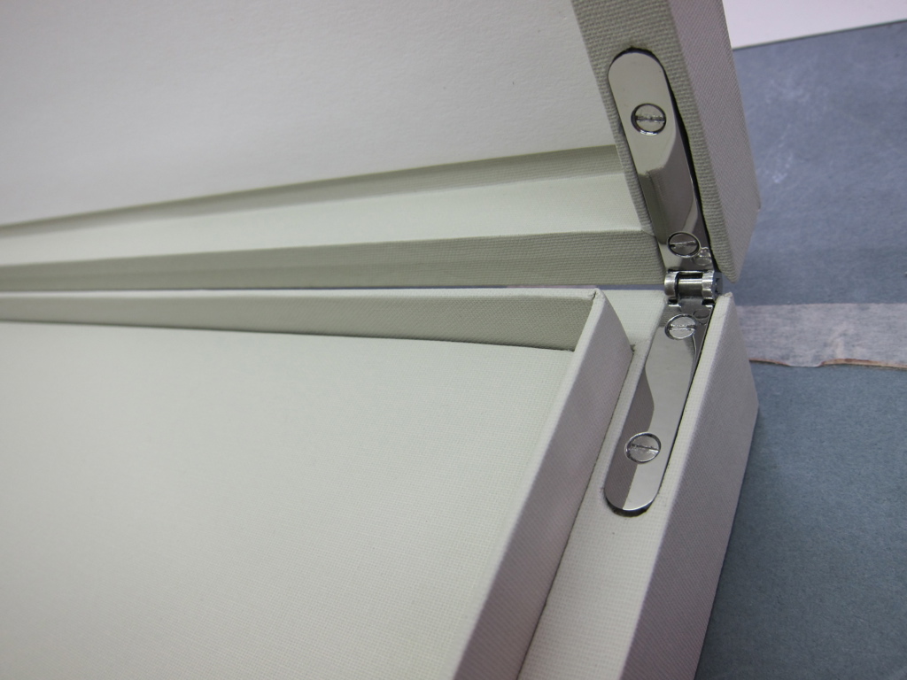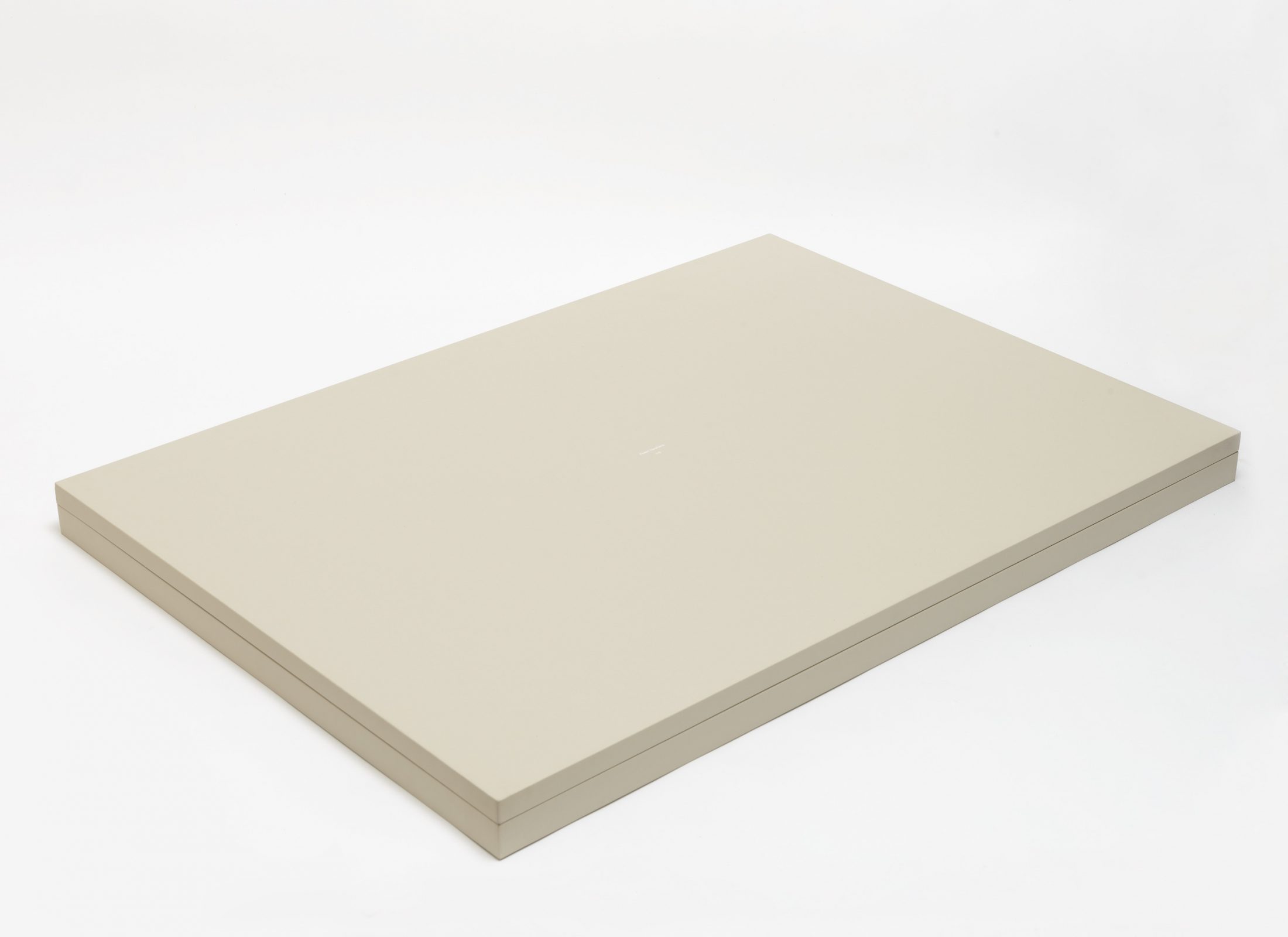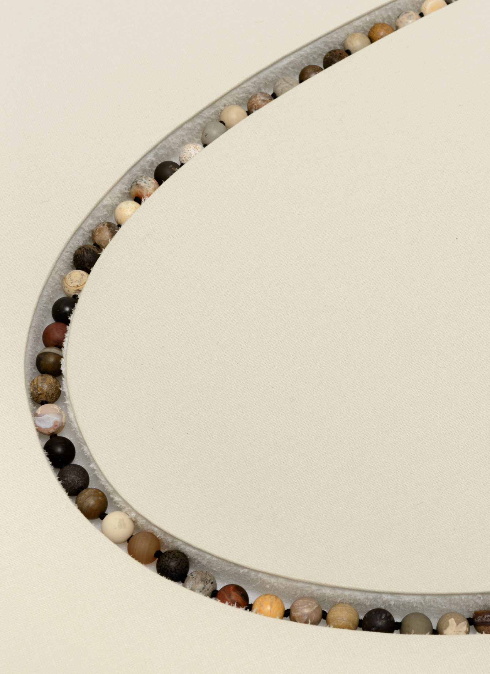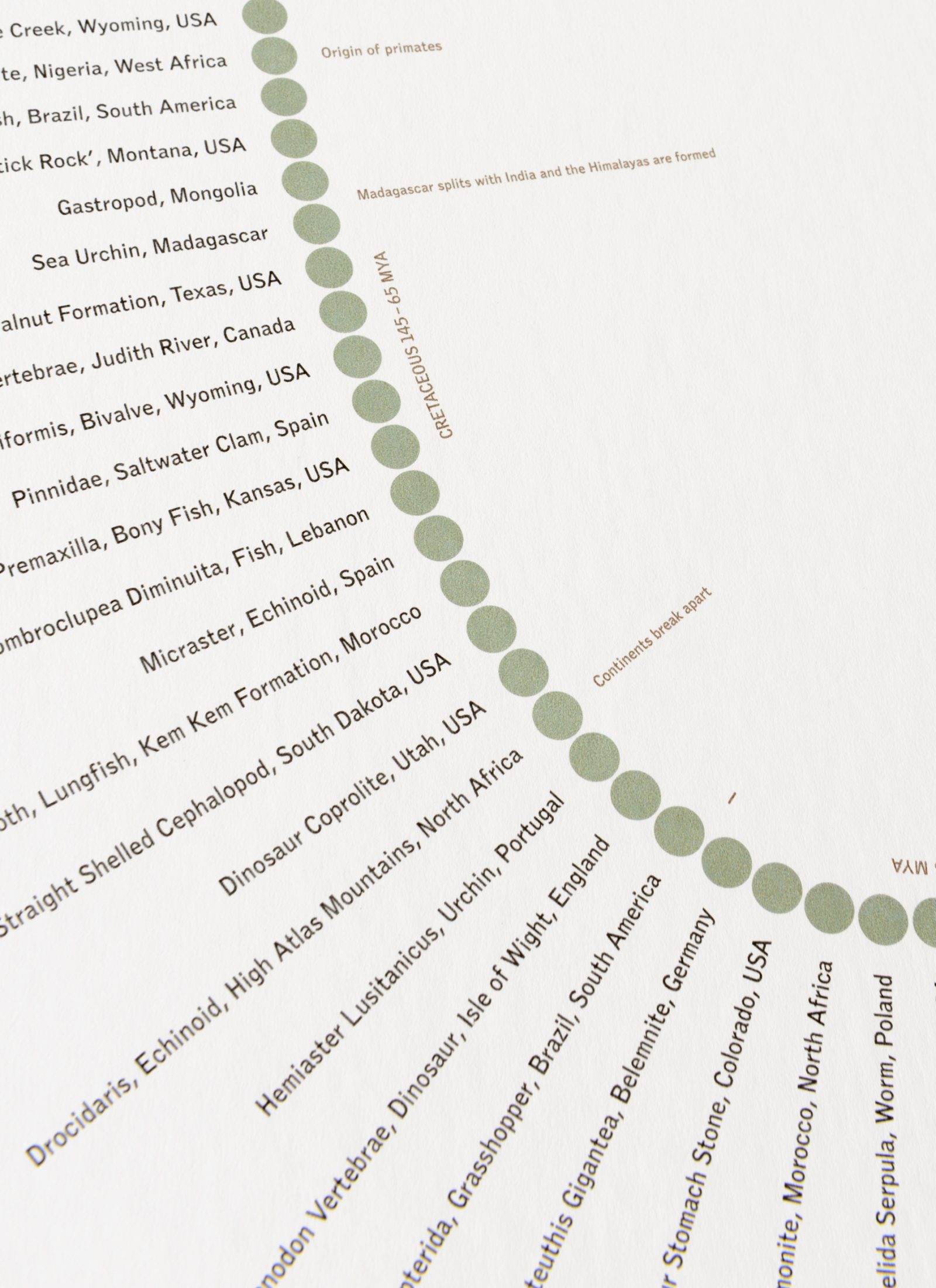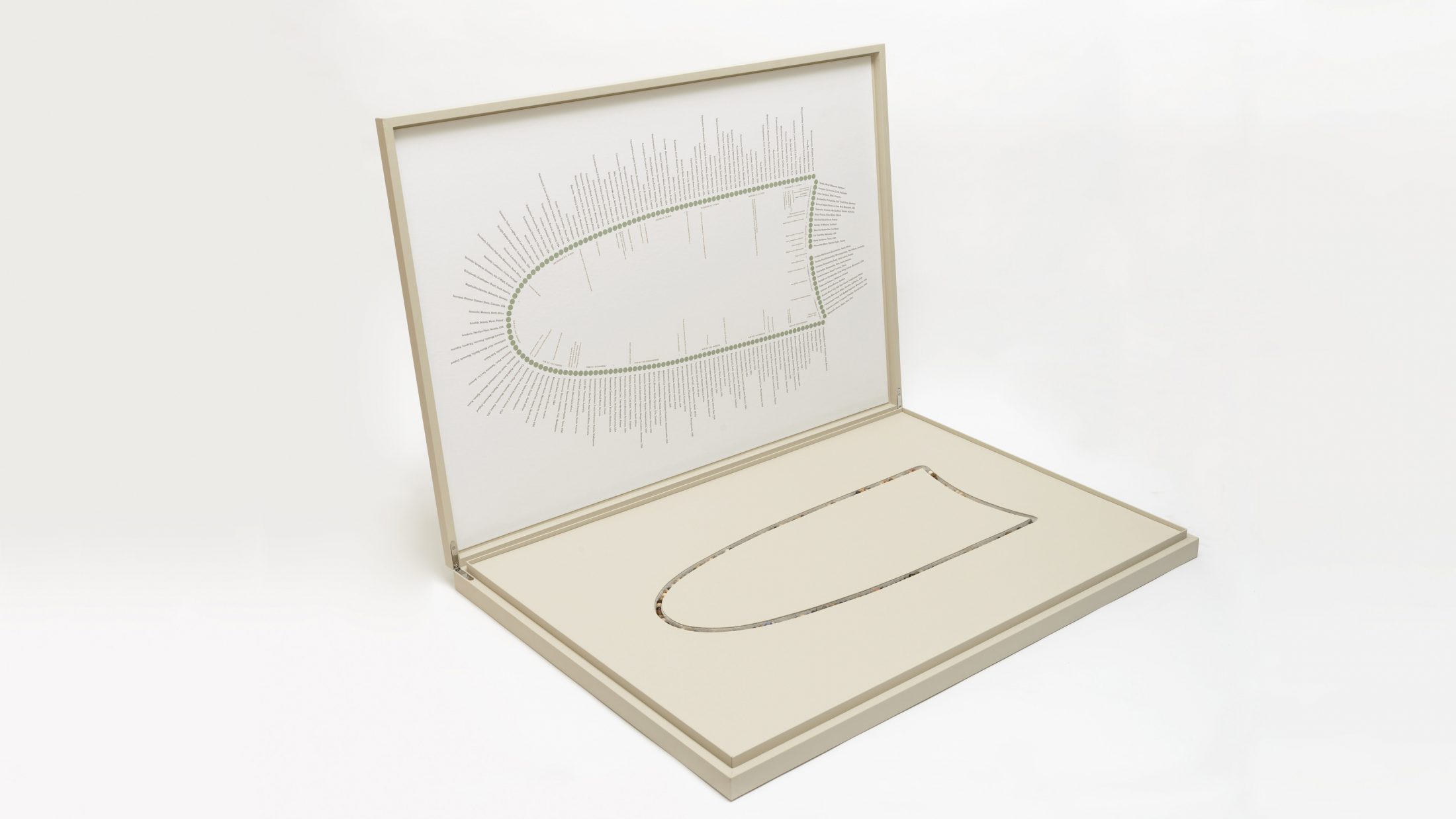 A large cloth covered box containing a limited edition necklace created by the artist. Each of the stone beads on the necklace is annotated on the printed guide on the inside lid and states its’ origin and date, and represents a significant event in the evolution of life on Earth. The lid is fitted with retaining hinges to hold the lid in an open position.