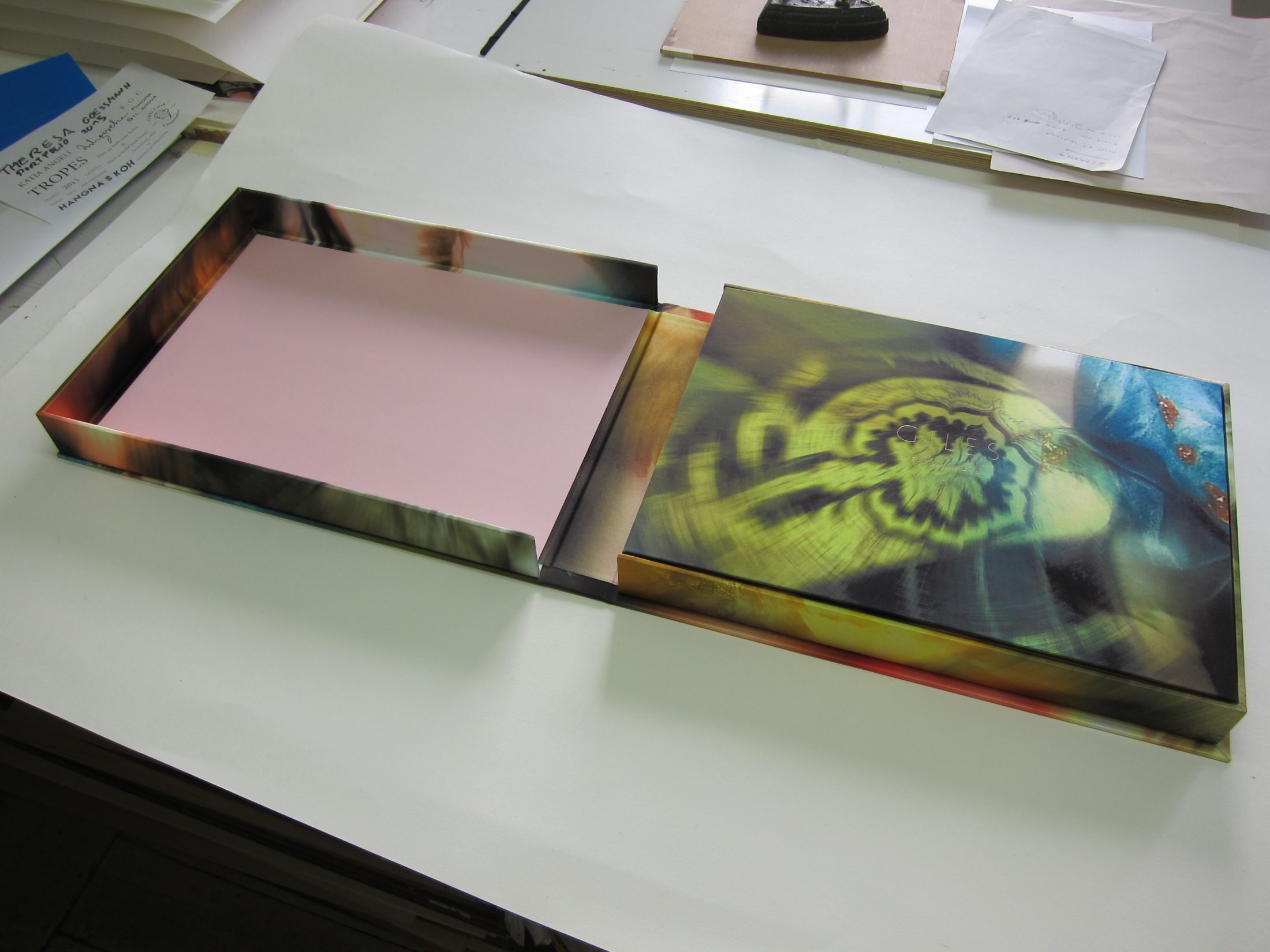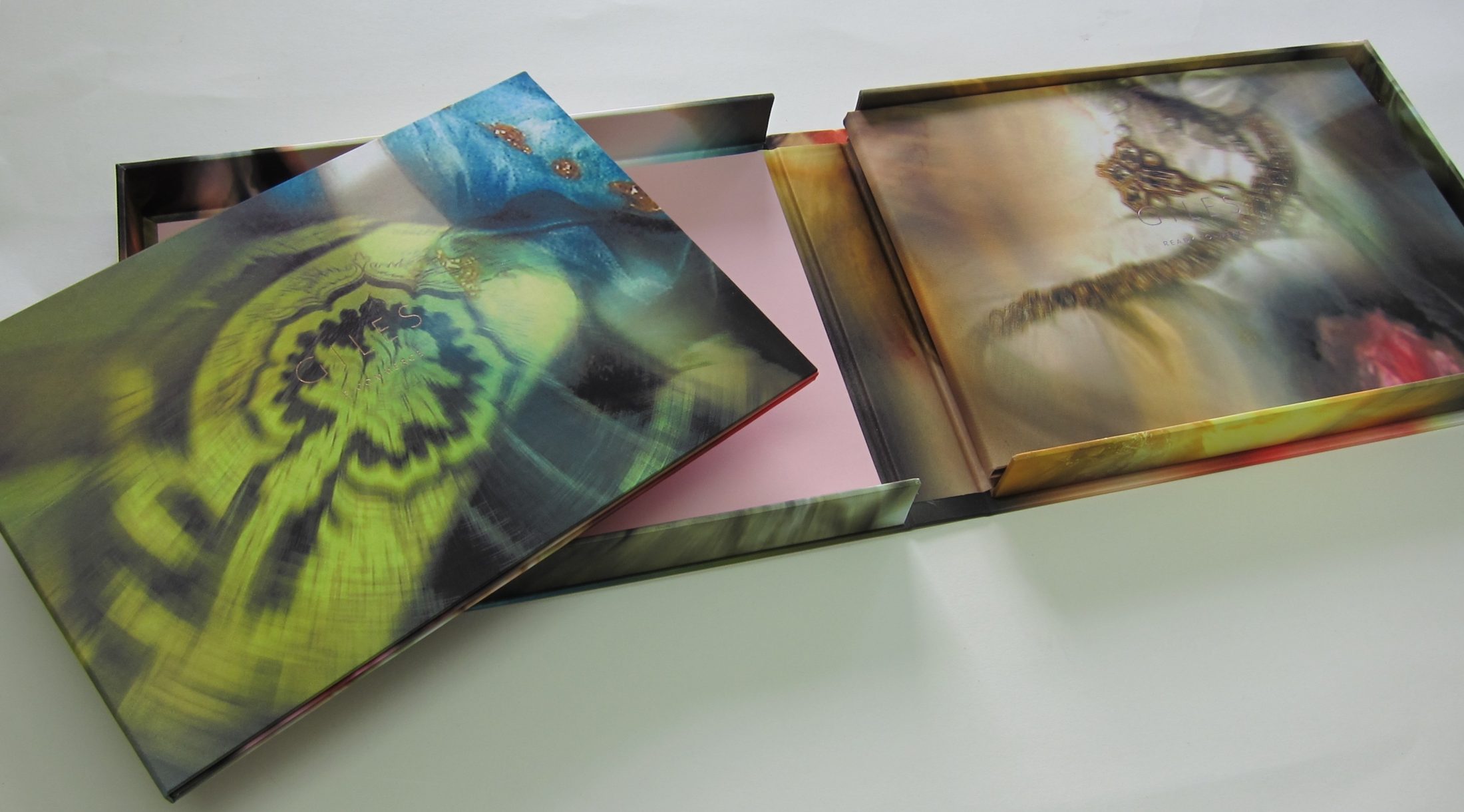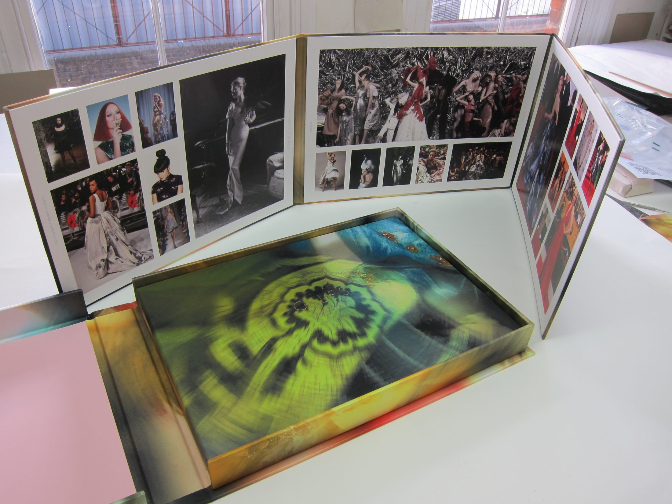 A solander box covered in the fashion designer’s own design of fabric, and containing printed casebound books and gatefold panels of the work.