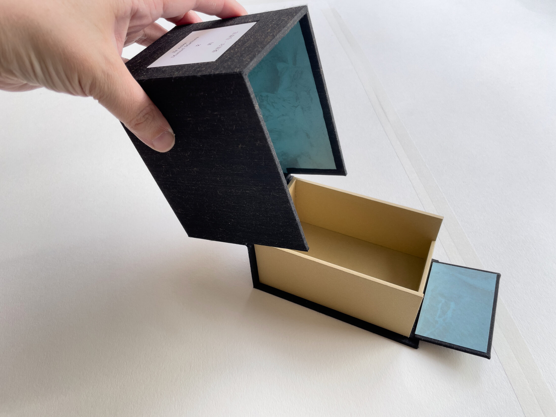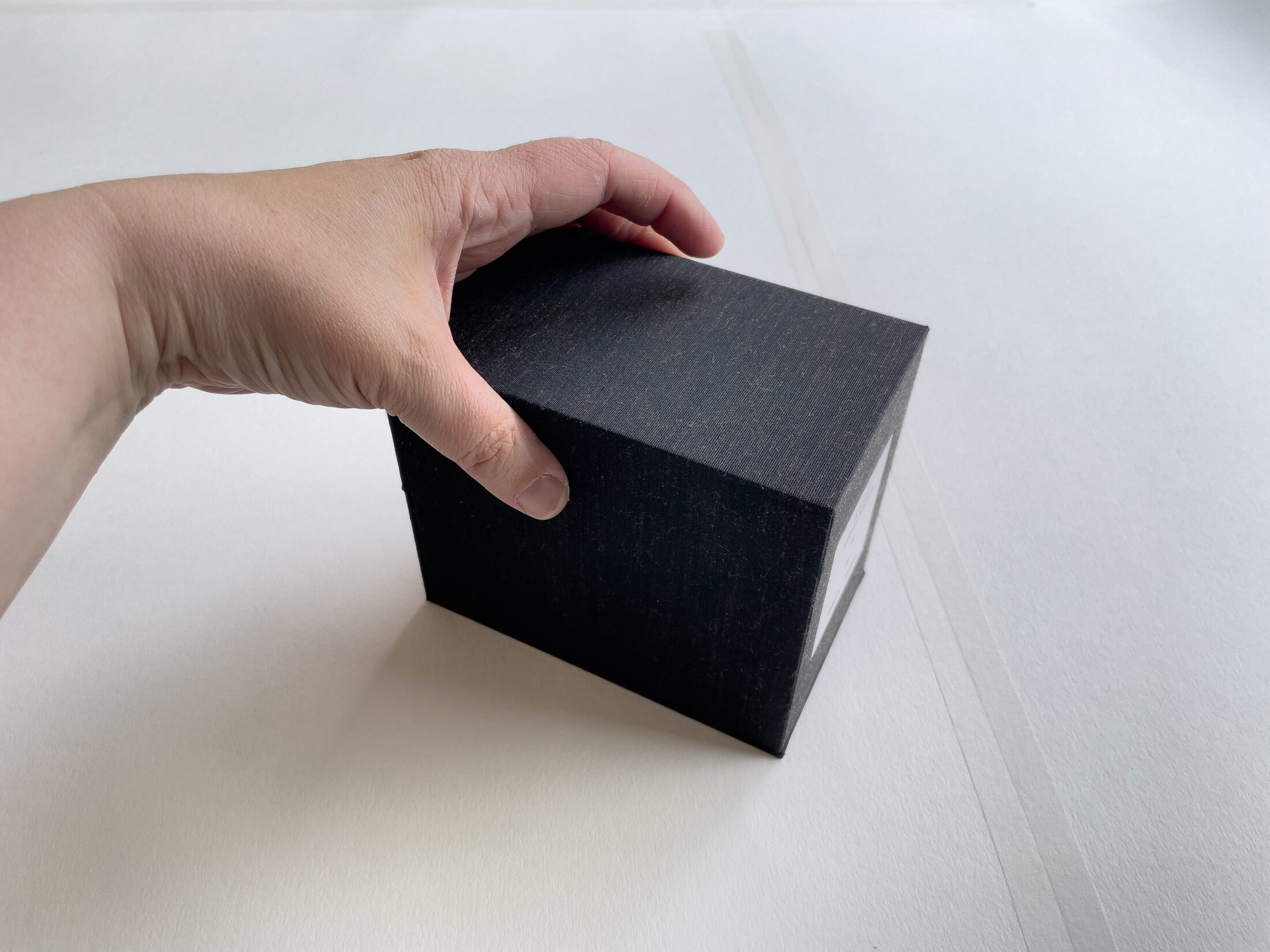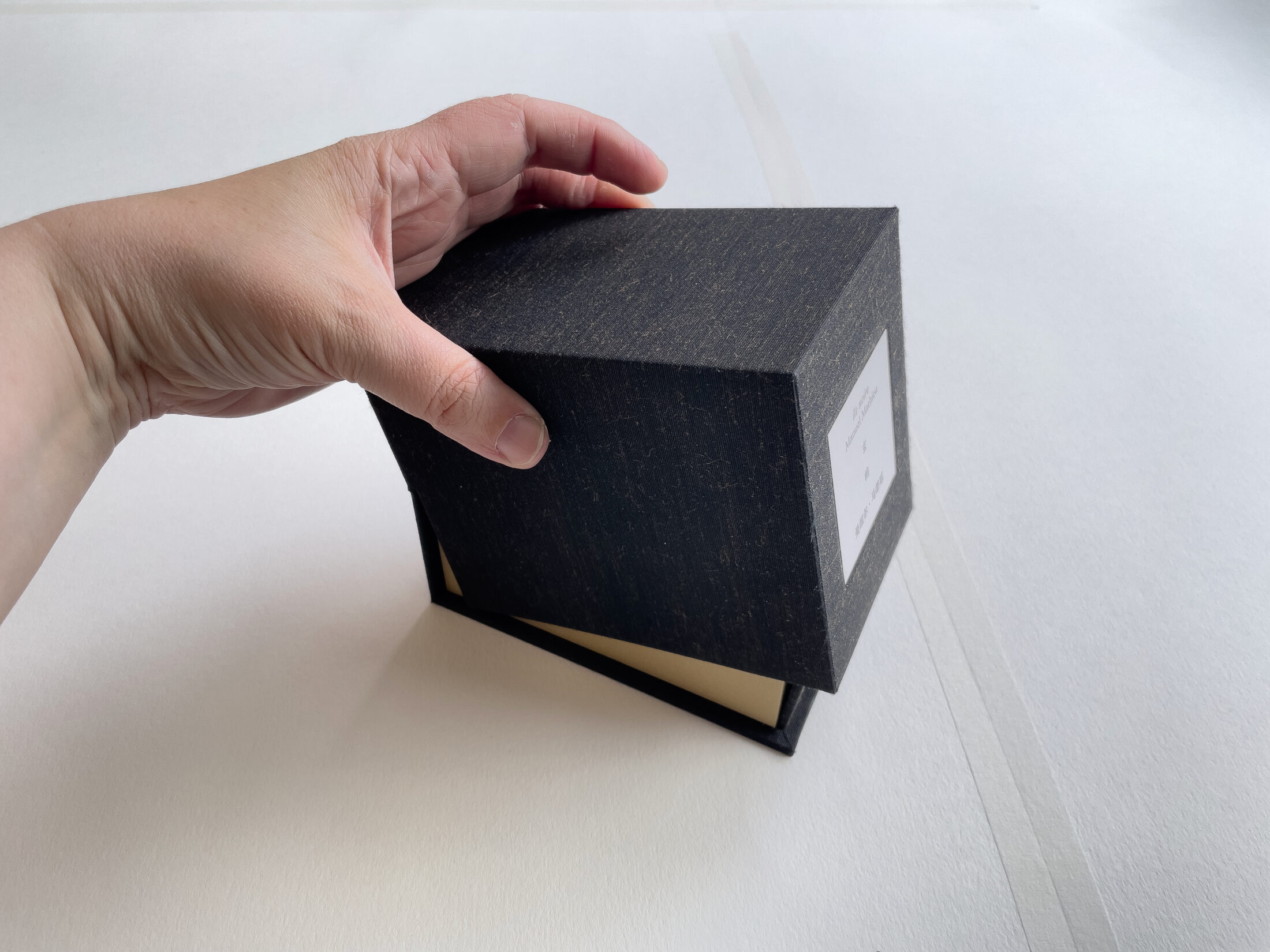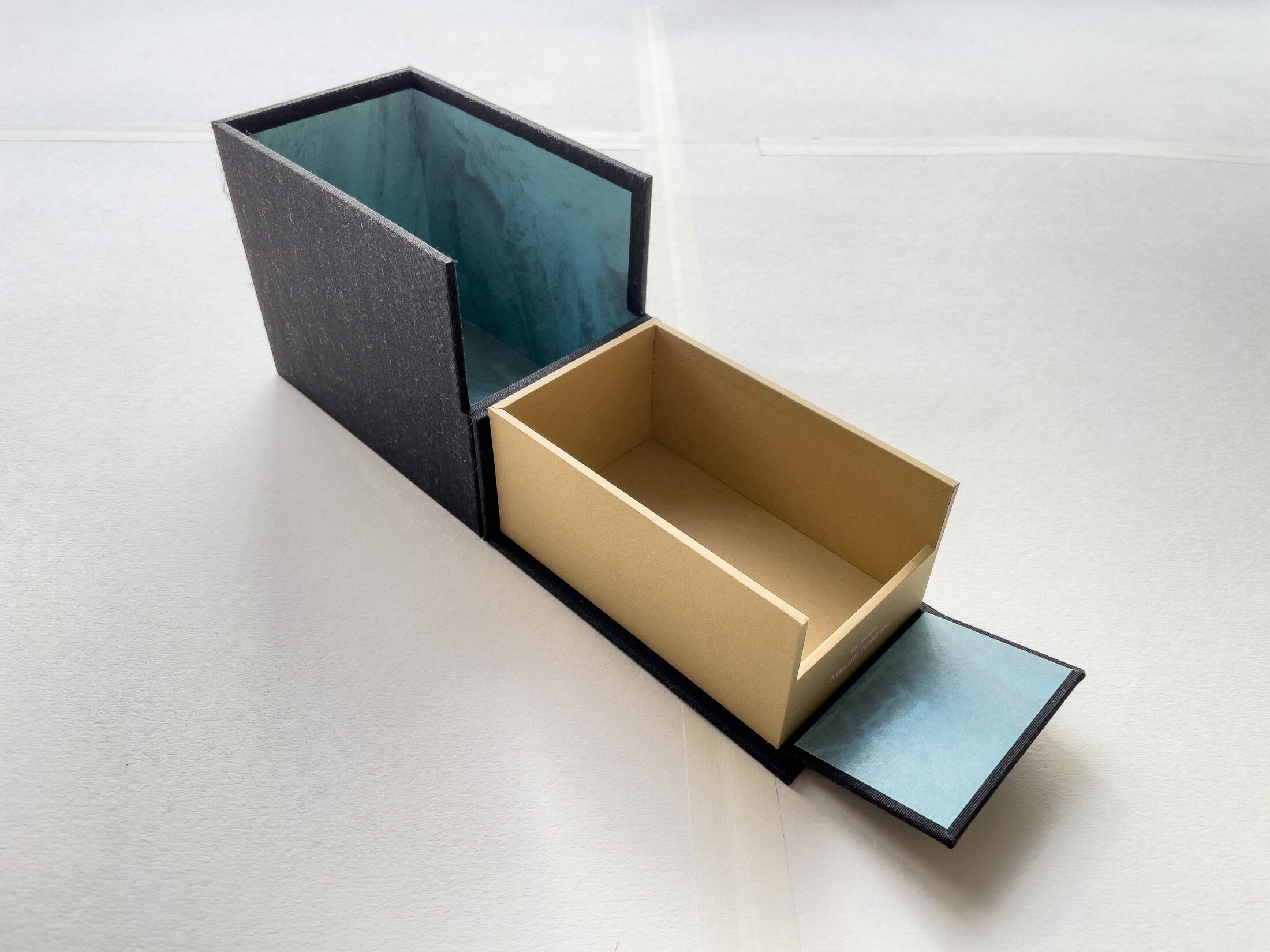 Prototype boxes created for a new range of perfume created by the artist. The design of the boxes was by Twelve and consists of cloth and paper over board to create this folding box structure. The label with the name is recessed into the front.
