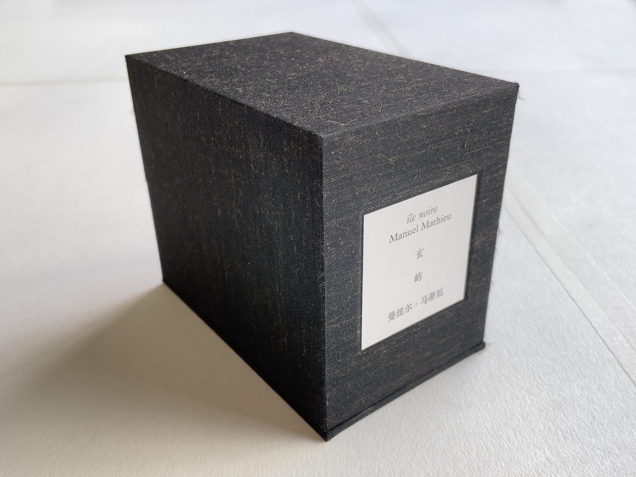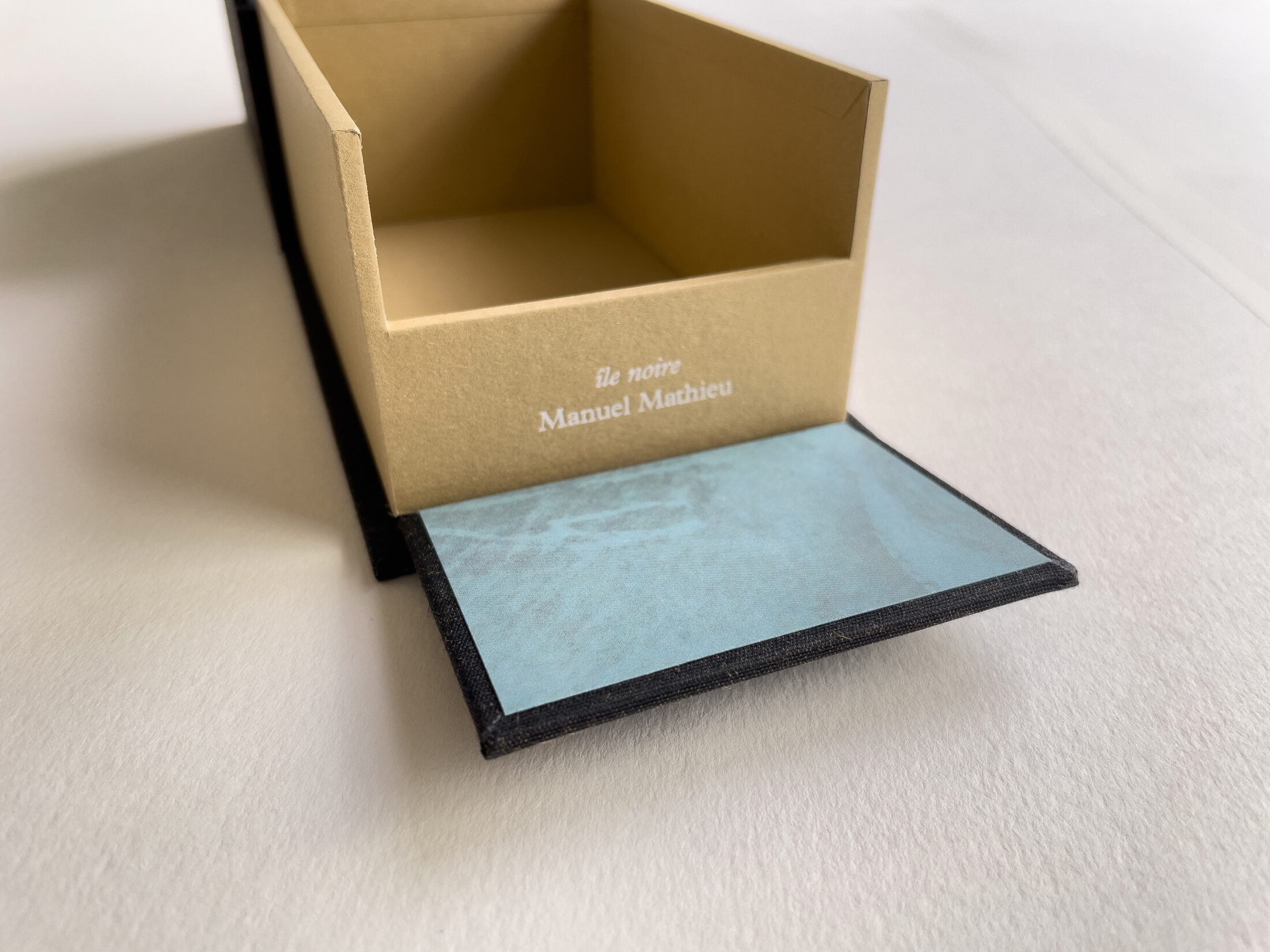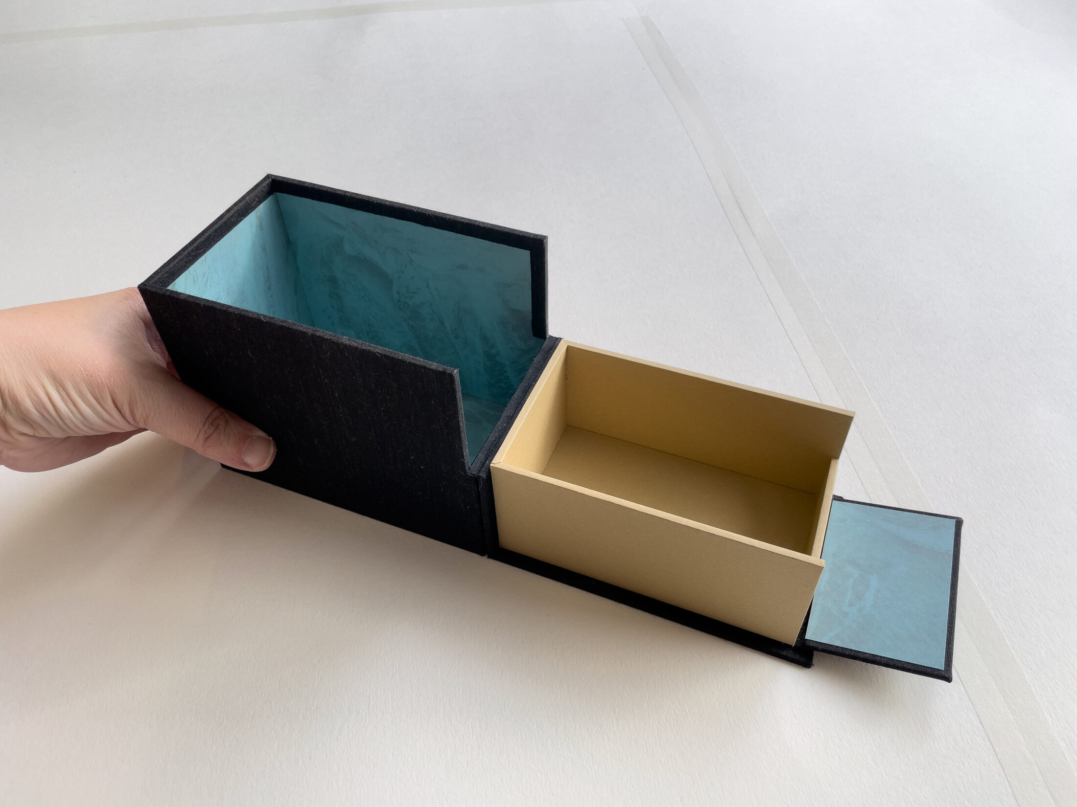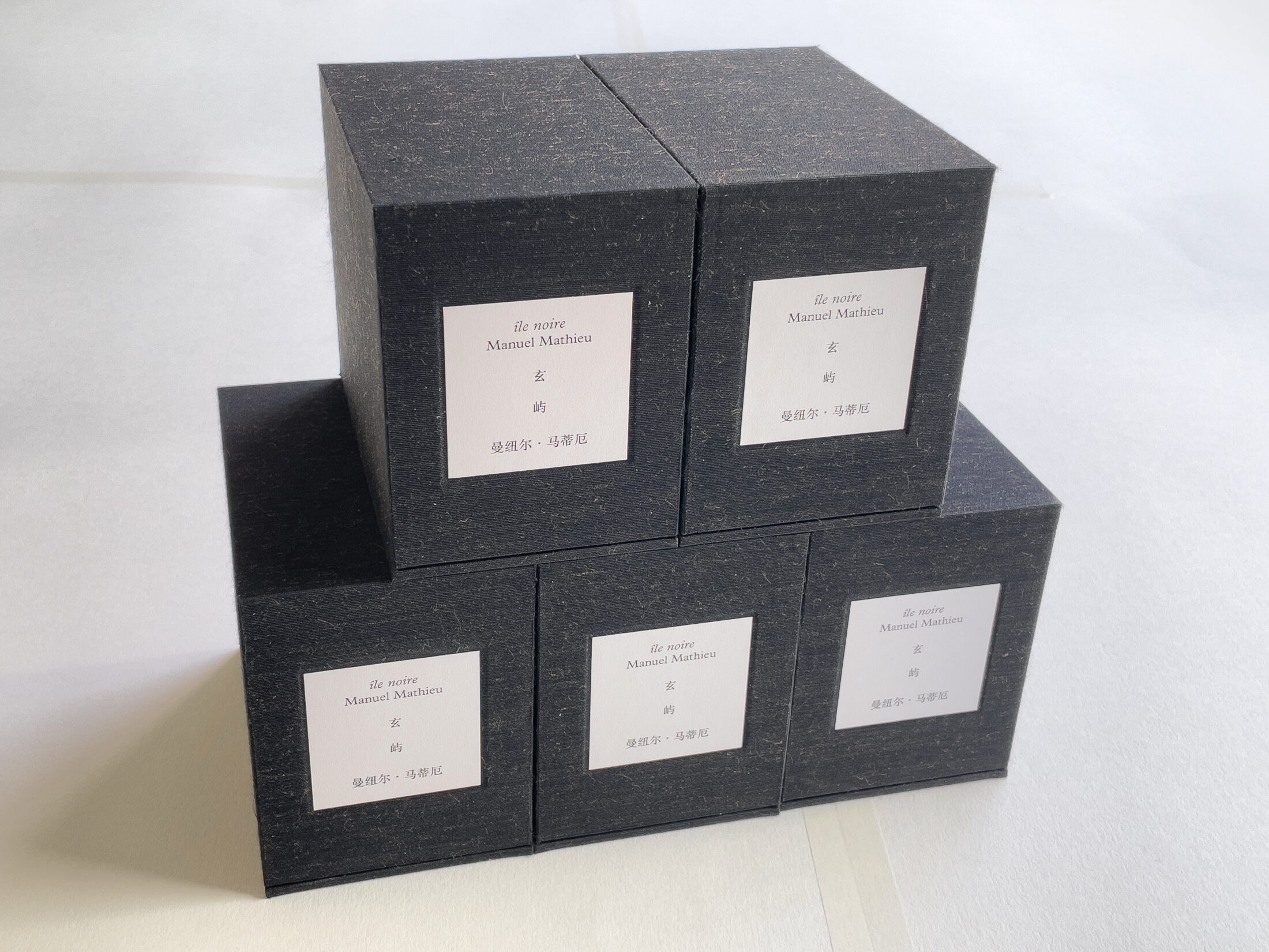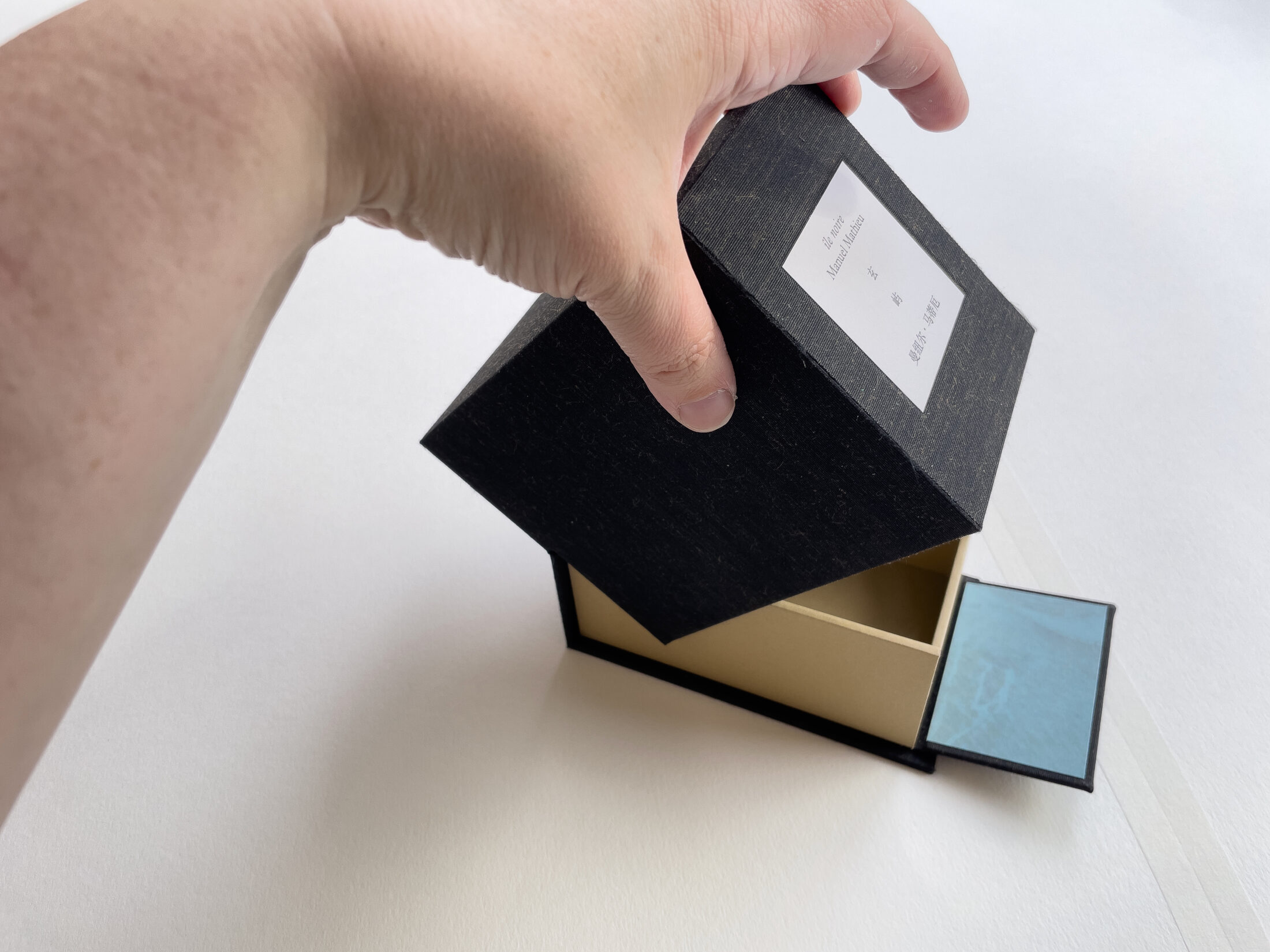 Prototype boxes created for a new range of perfume created by the artist. The design of the boxes was by Twelve and consists of cloth and paper over board to create this folding box structure. The label with the name is recessed into the front.
