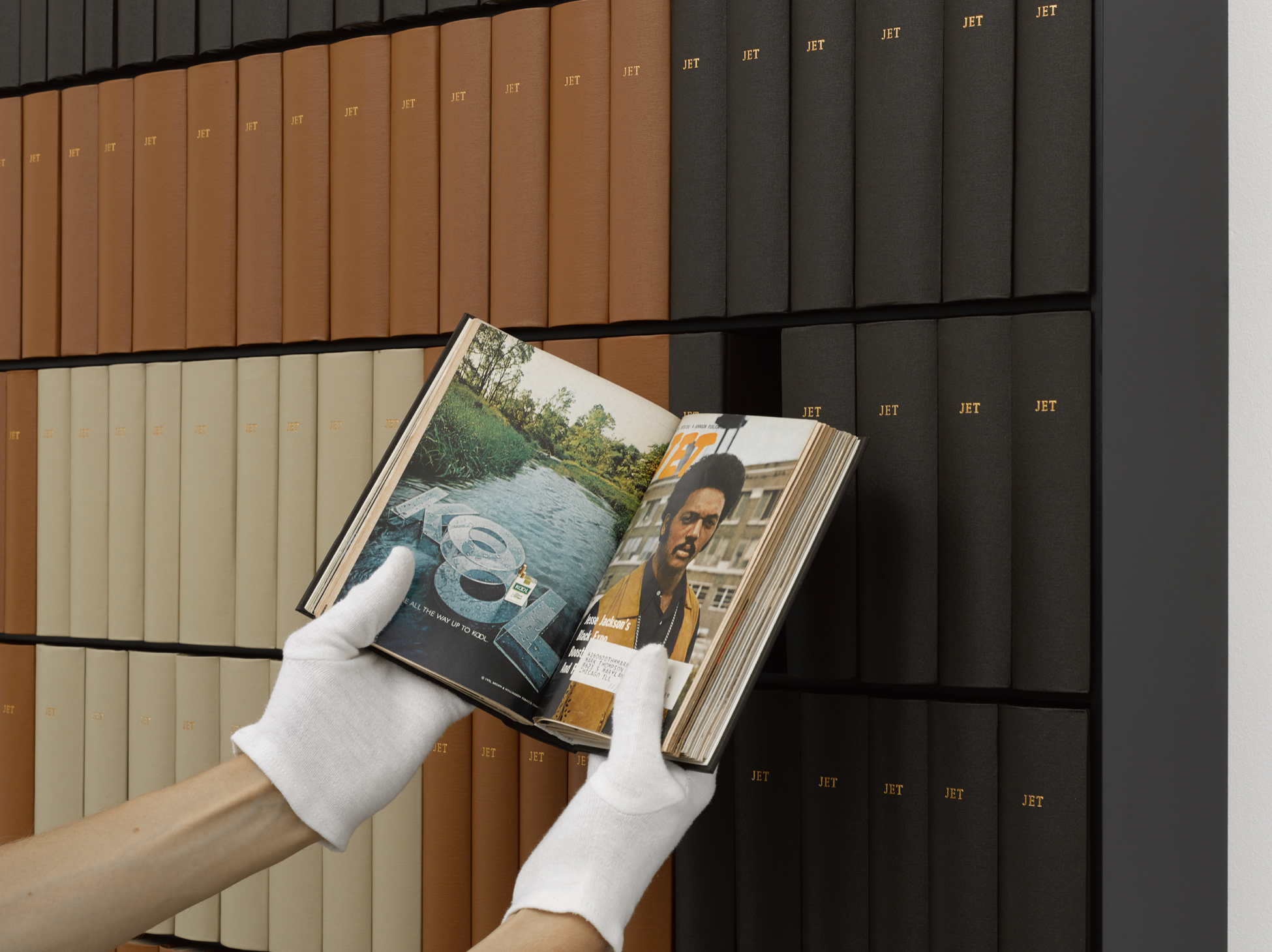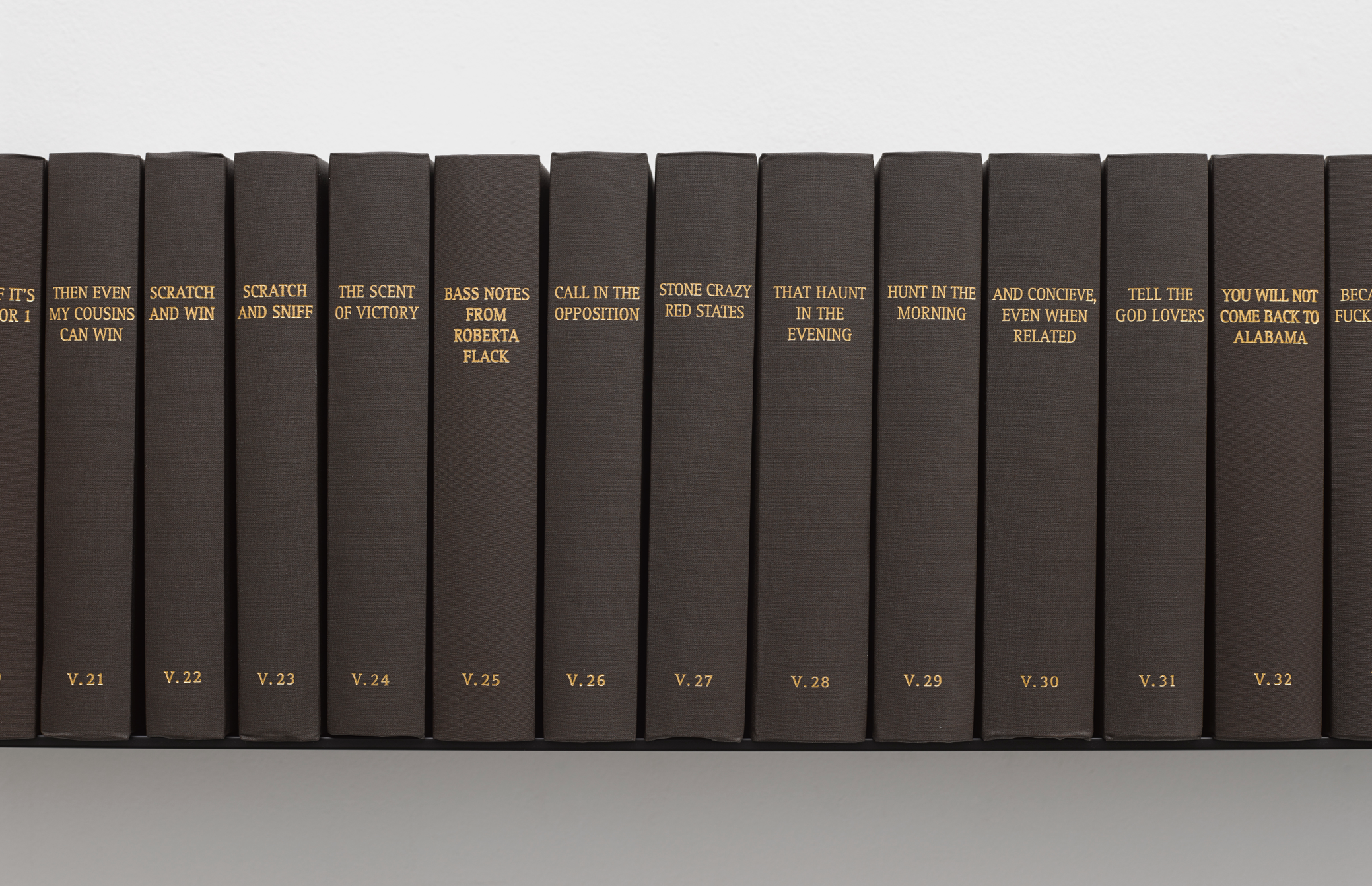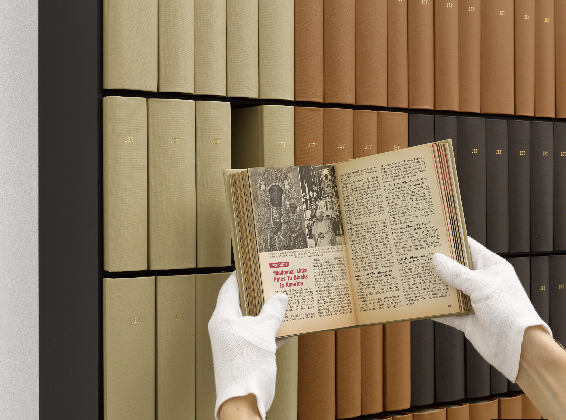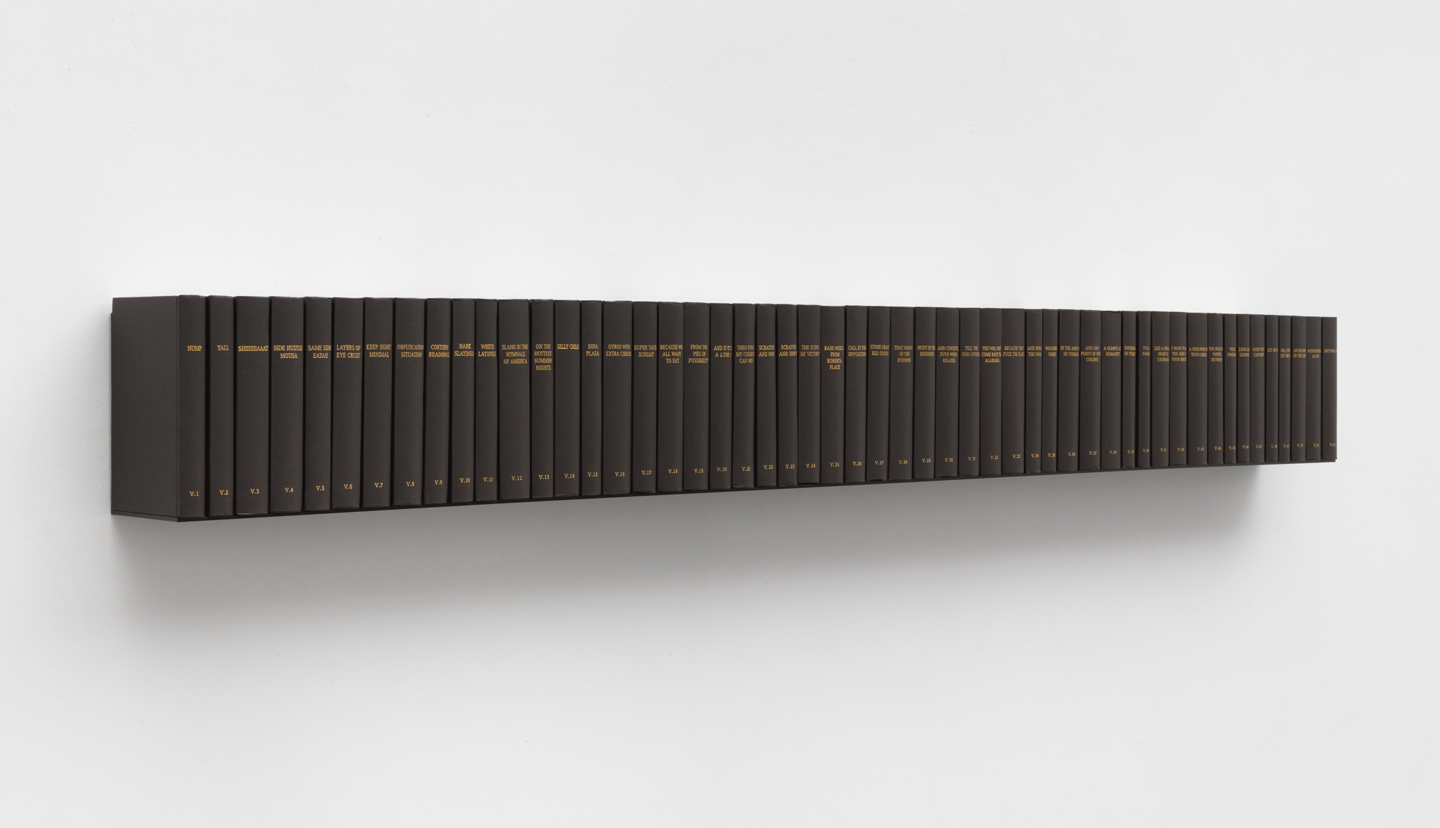 Various works for the artist created from existing copies of JET magazine referencing the role of black Americans in US history, and also referencing the work of Josef Albers. The single or double shelf works titled Nump, Holy Nation and Creature, Come Hither, were created from old copies of books about American history and featured the artists’ poetry on the spines of the books.