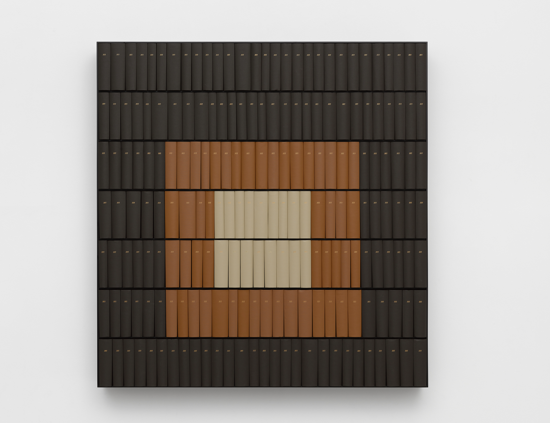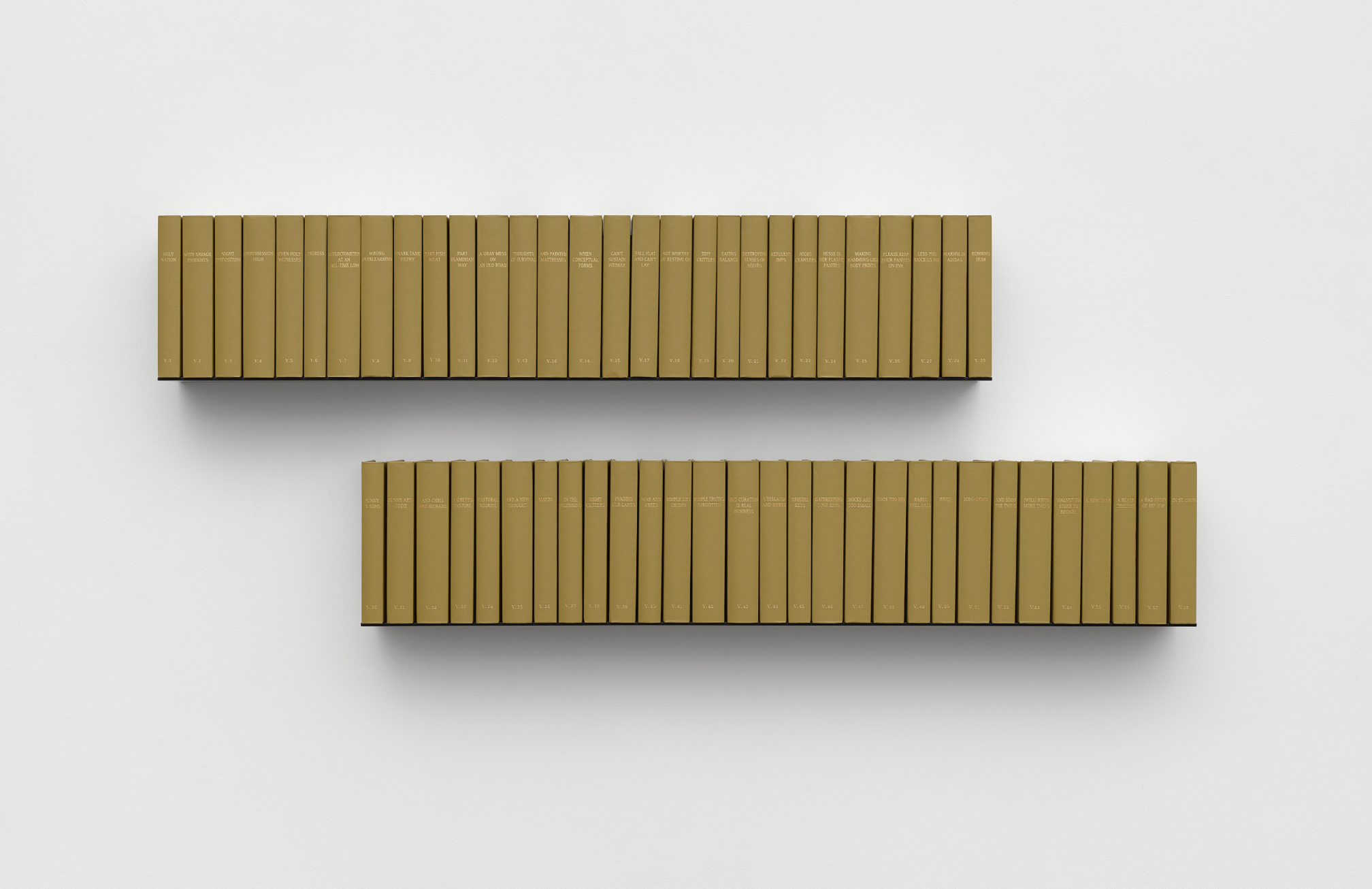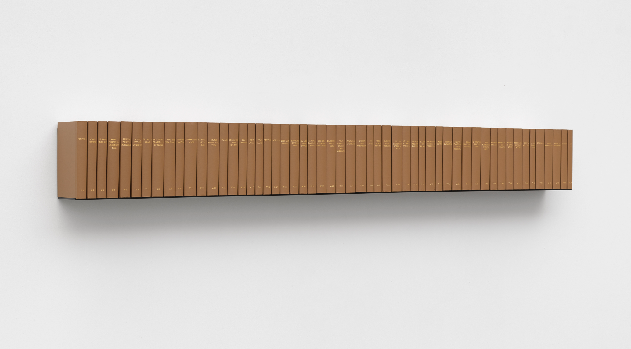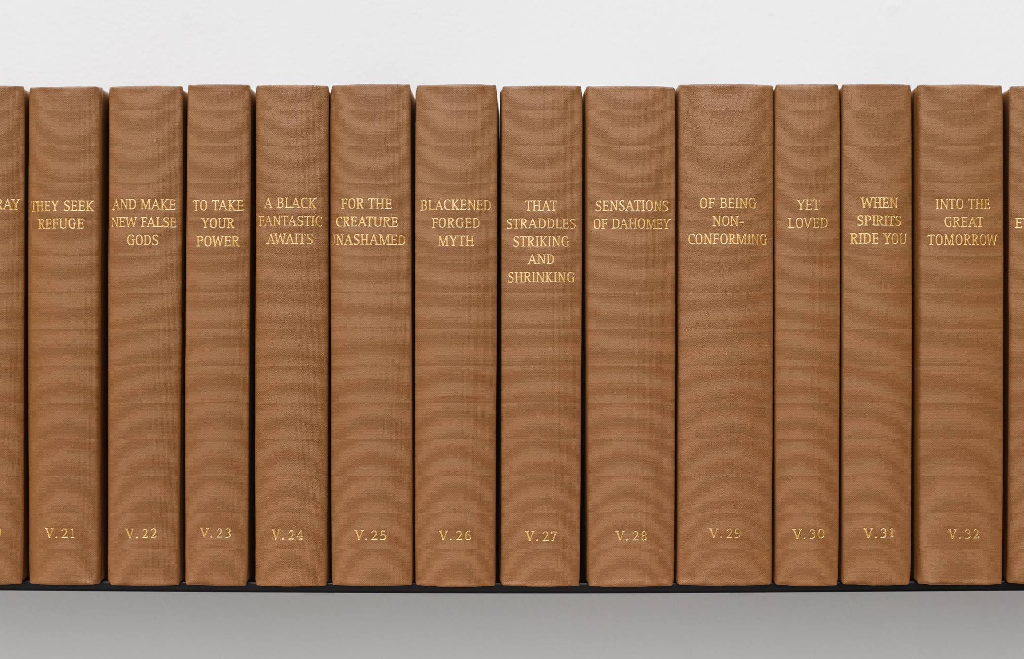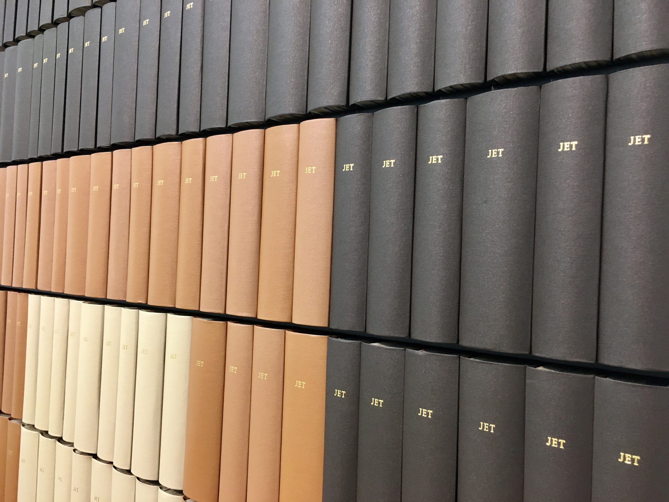 Various works for the artist created from existing copies of JET magazine referencing the role of black Americans in US history, and also referencing the work of Josef Albers. The single or double shelf works titled Nump, Holy Nation and Creature, Come Hither, were created from old copies of books about American history and featured the artists’ poetry on the spines of the books.