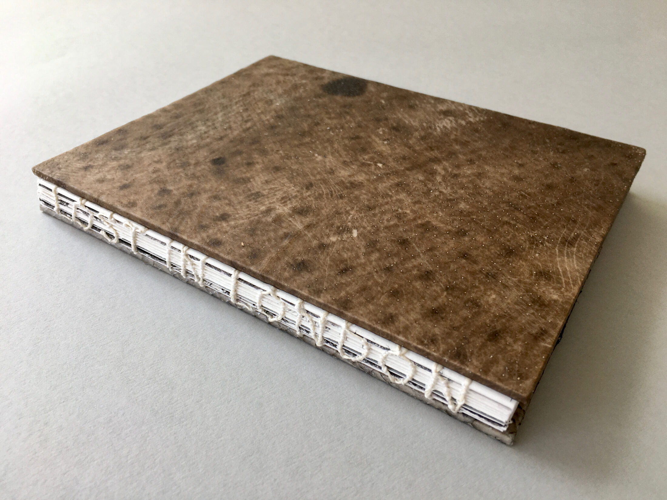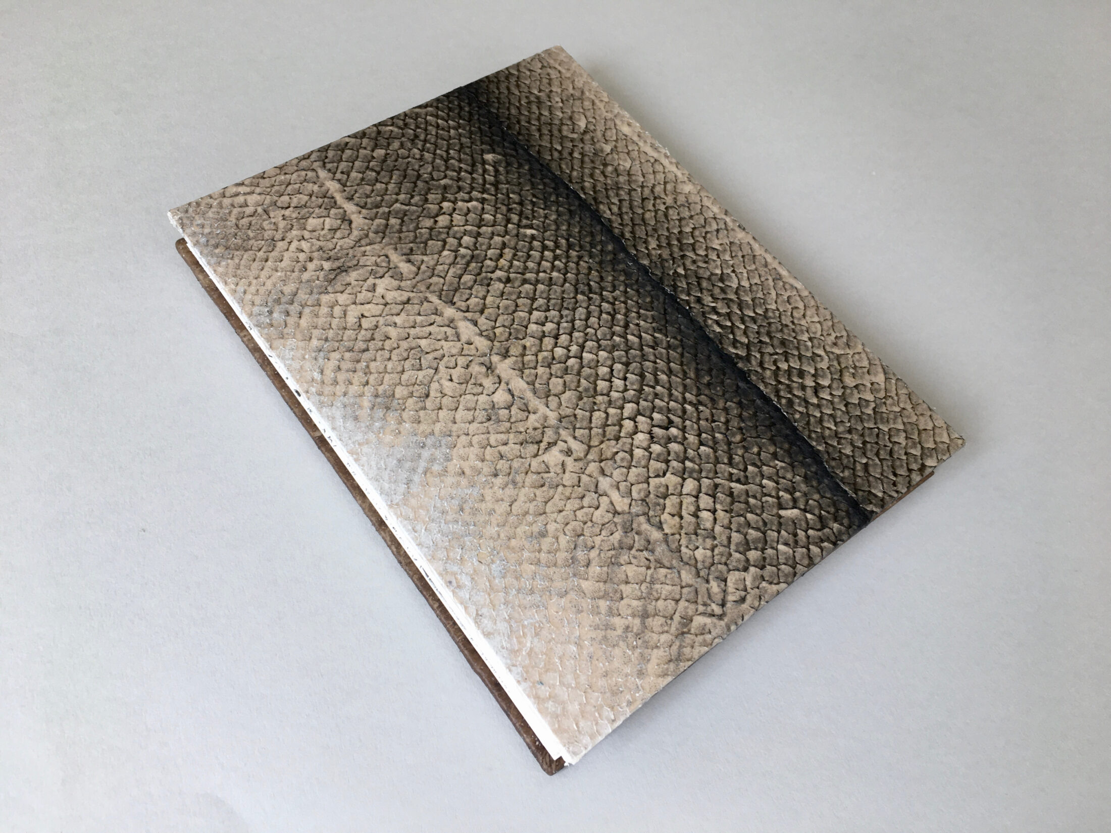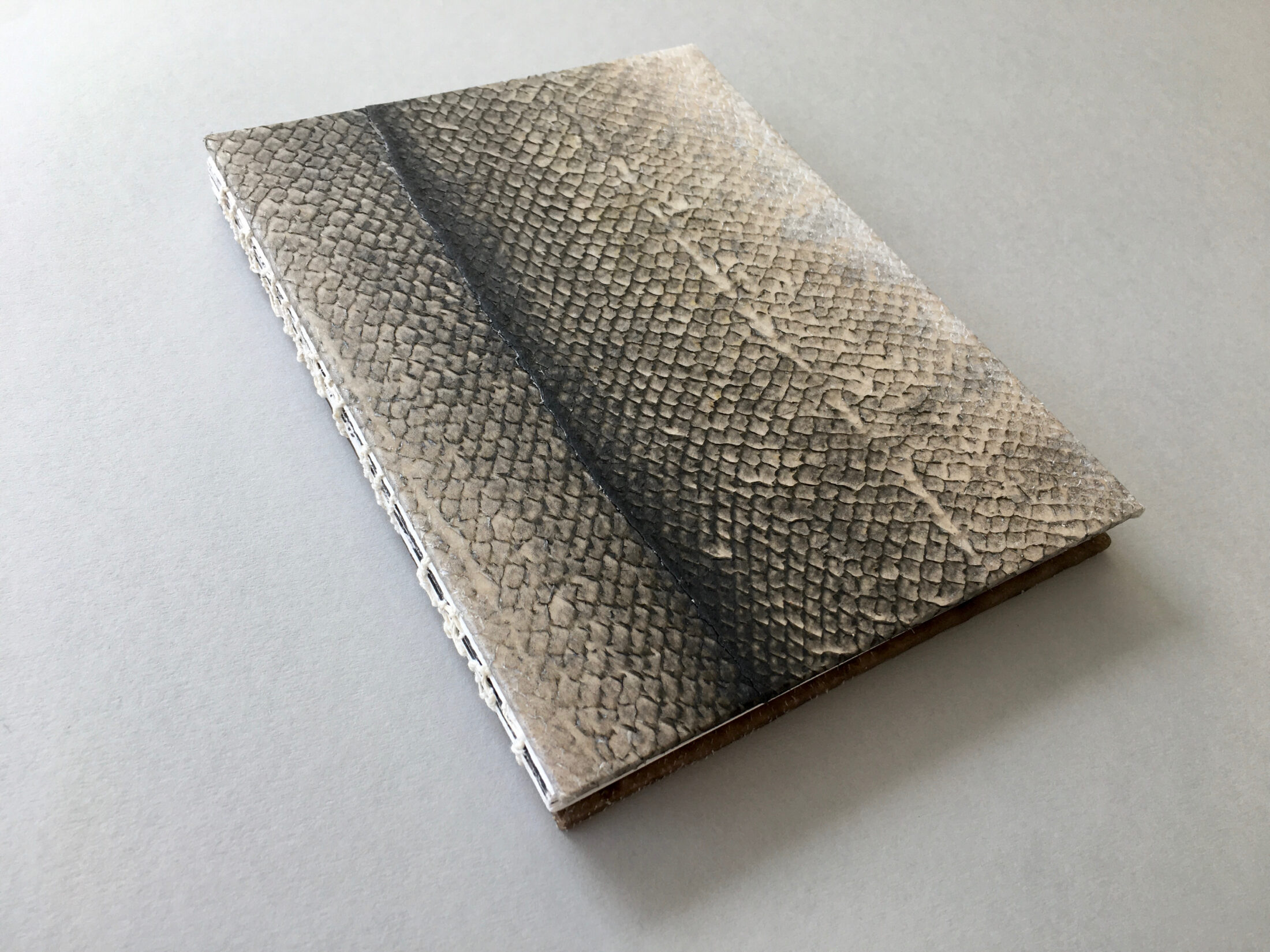 A unique book printed and bound for a student featuring her sequence of drawings. The binding uses dried halibut fish skin on the covers and the exposed spine is hand embroidered with the title of the work.