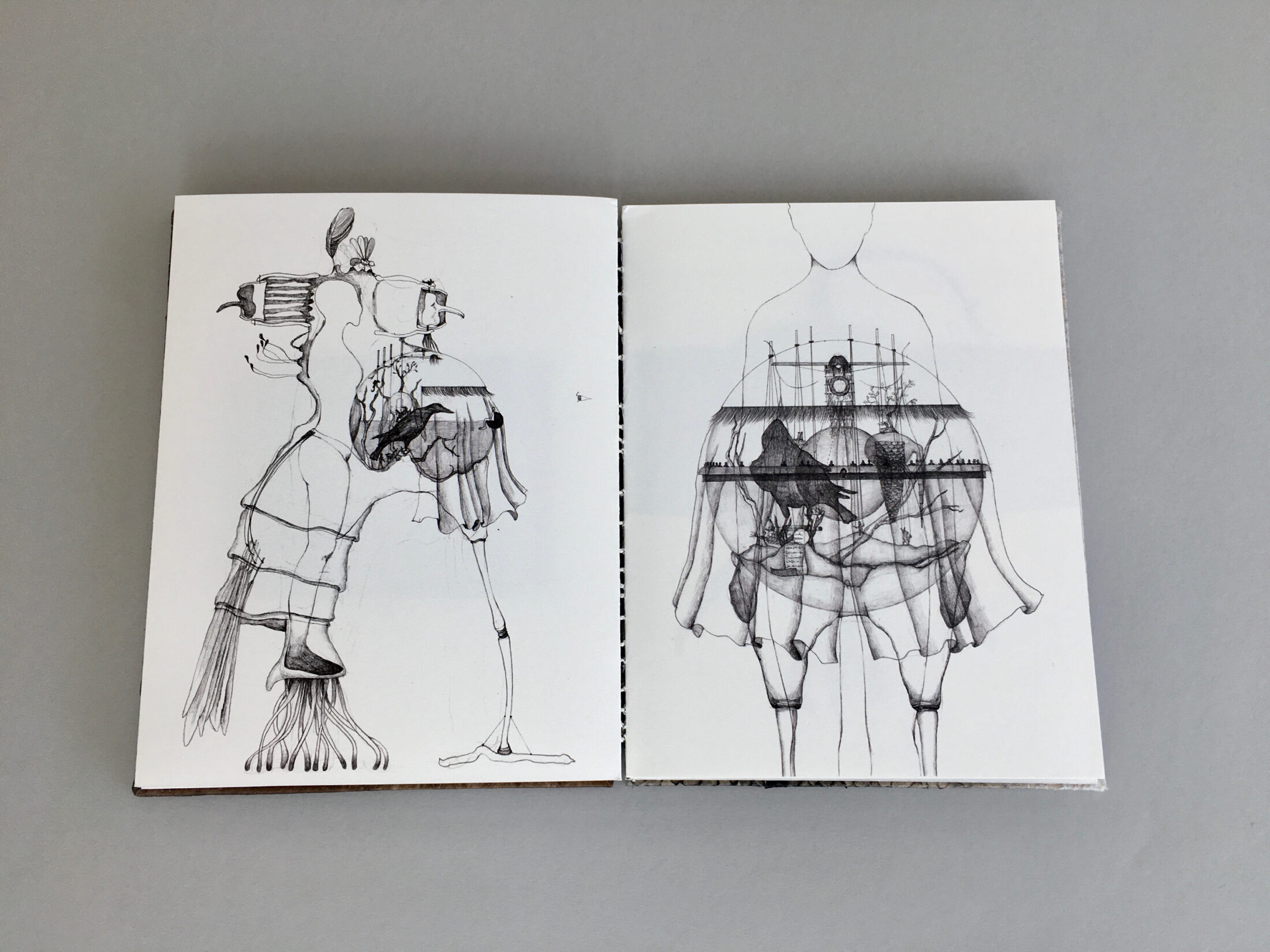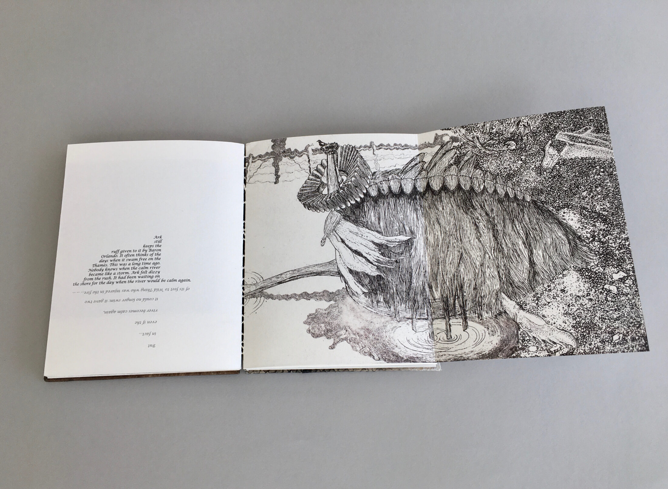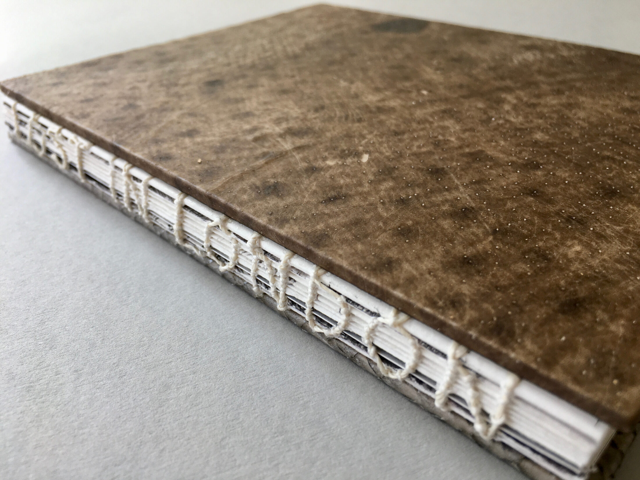 A unique book printed and bound for a student featuring her sequence of drawings. The binding uses dried halibut fish skin on the covers and the exposed spine is hand embroidered with the title of the work.