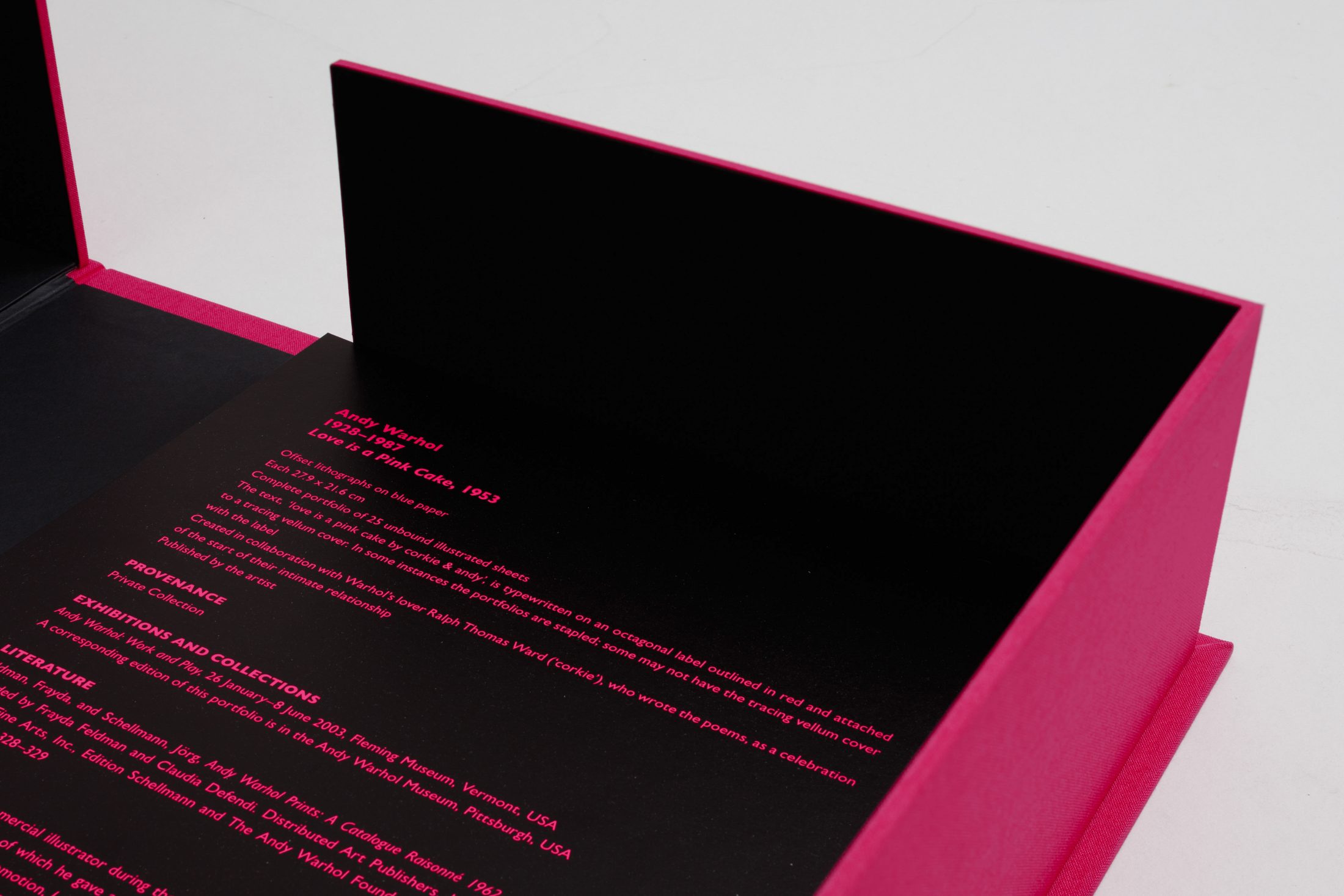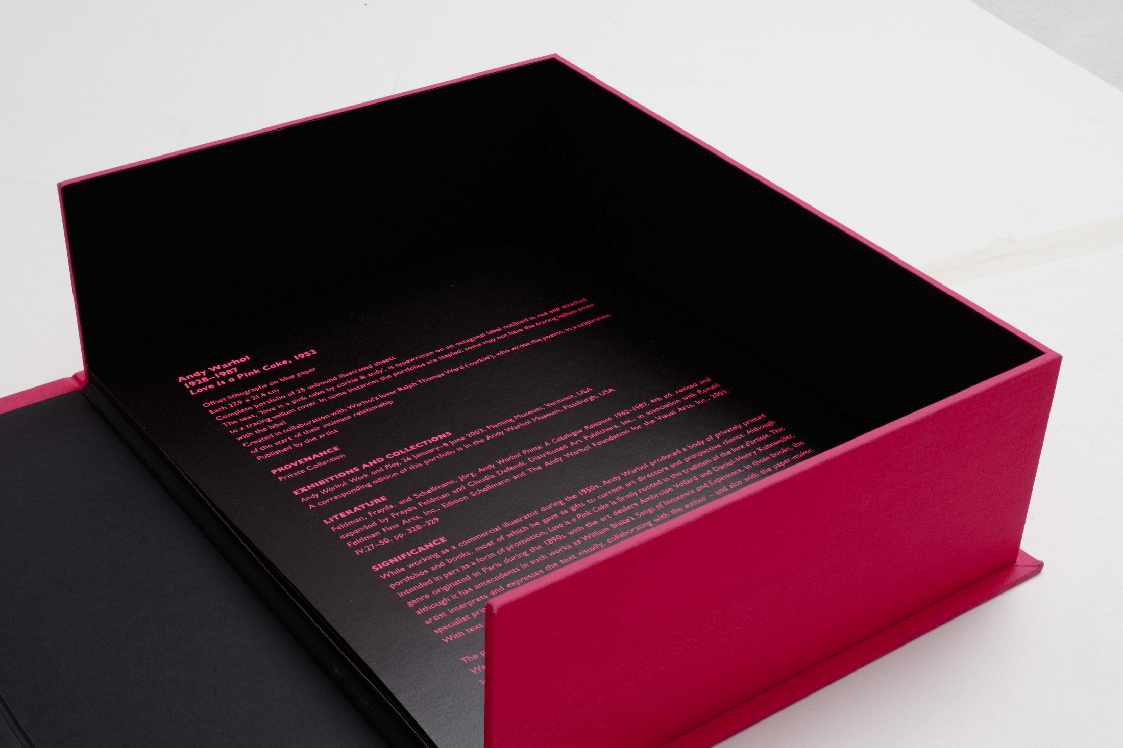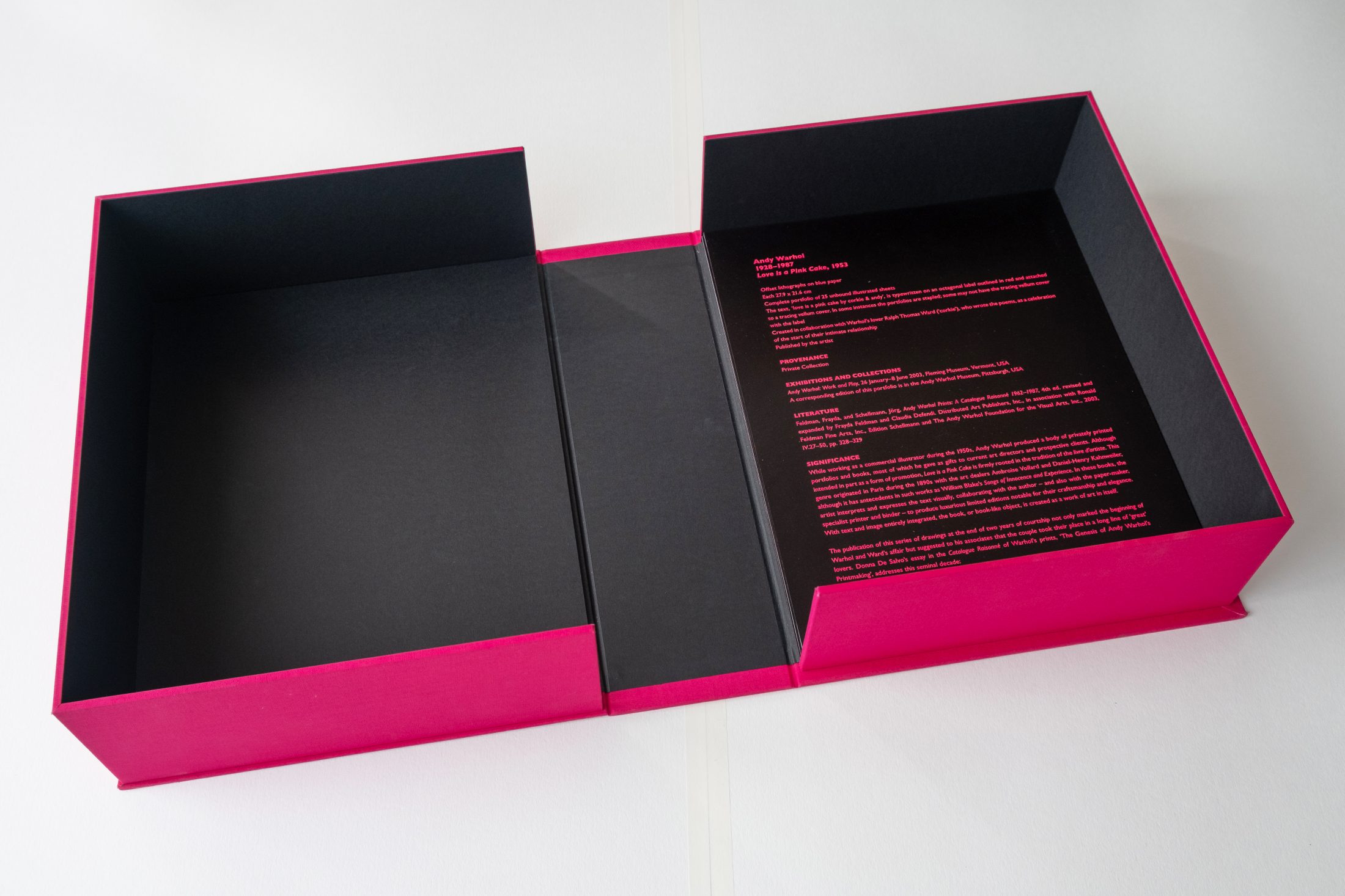 A series of solander boxes covered in bright pink bookcloth with a foil blocked drawing on the front cover, and title on the spine. The interior of the boxes are completely lined with black paper. Printed frontispiece.