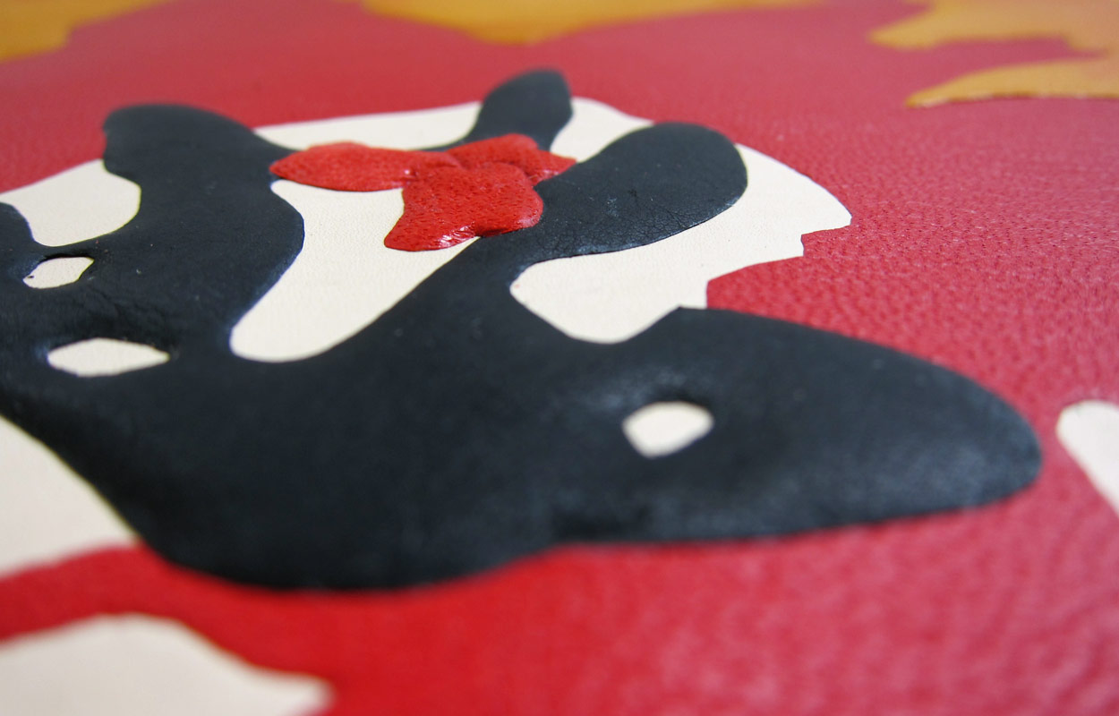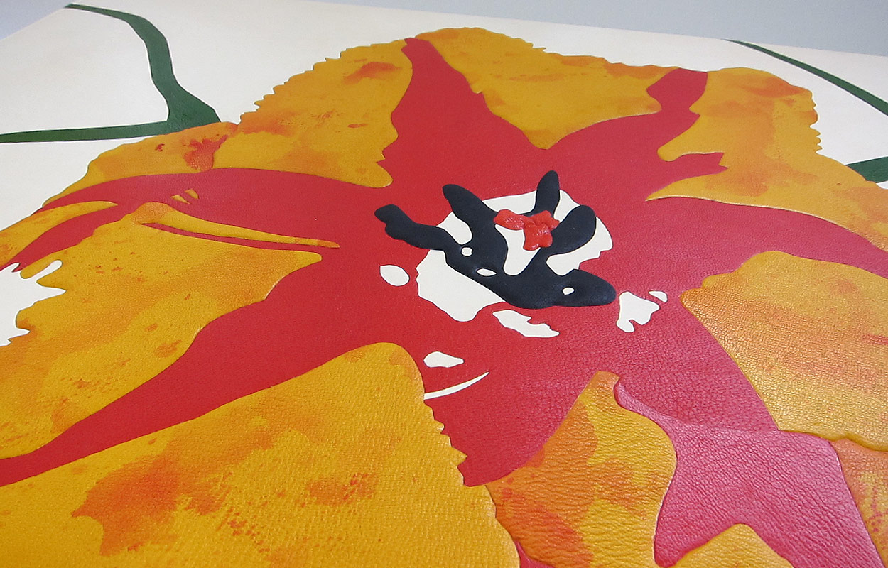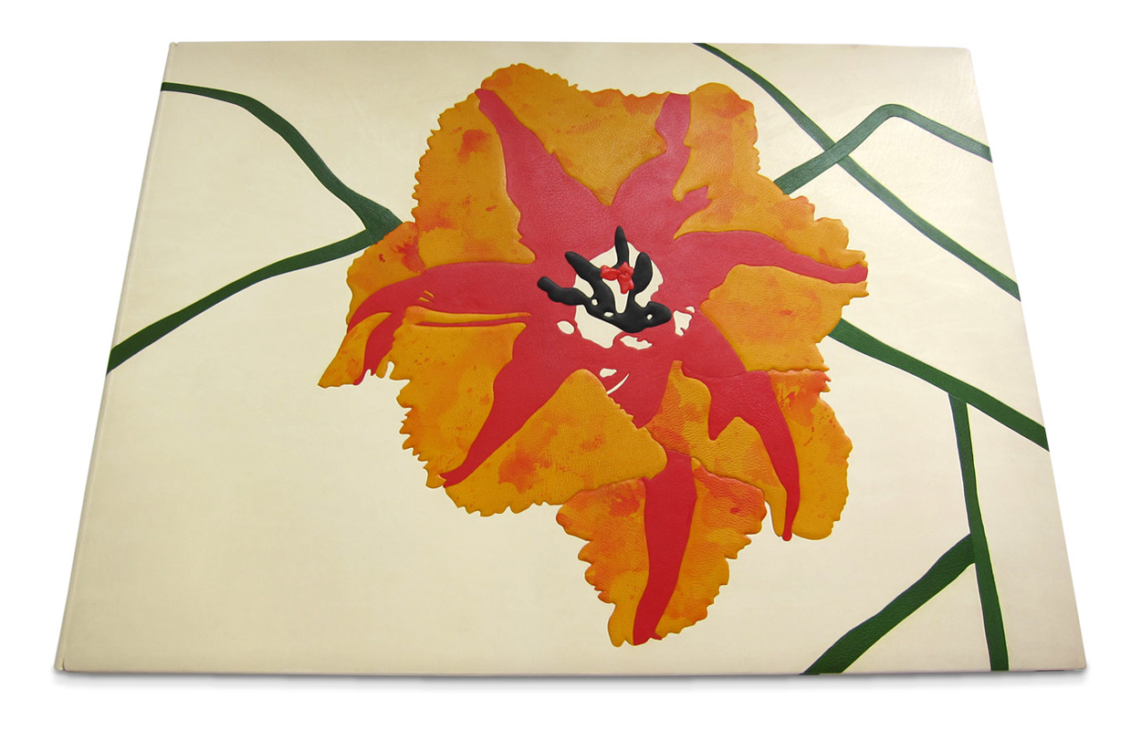 A series of six coloured etchings produced as a leather bound book bound with a letterpress printed title page. Each book is bound in calfskin with flush and raised onlays of hand coloured goatskin following a work created by the artist. The book has hand embroidered silk headbands and comes with a suede lined solander box.