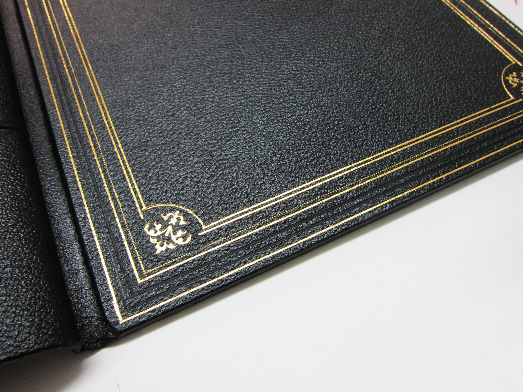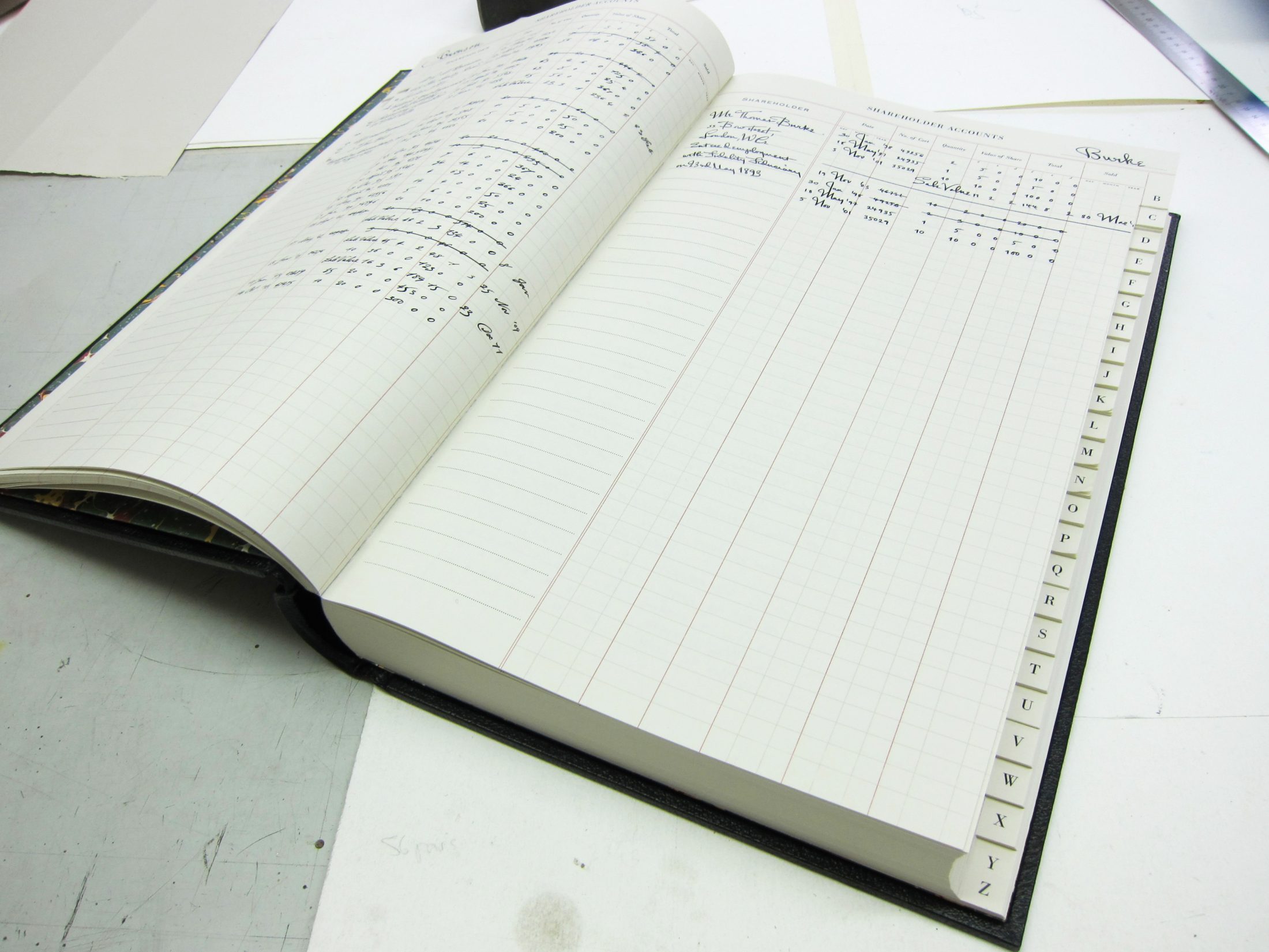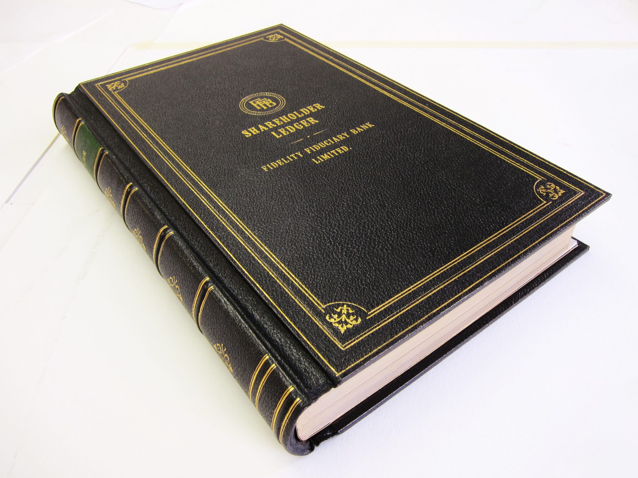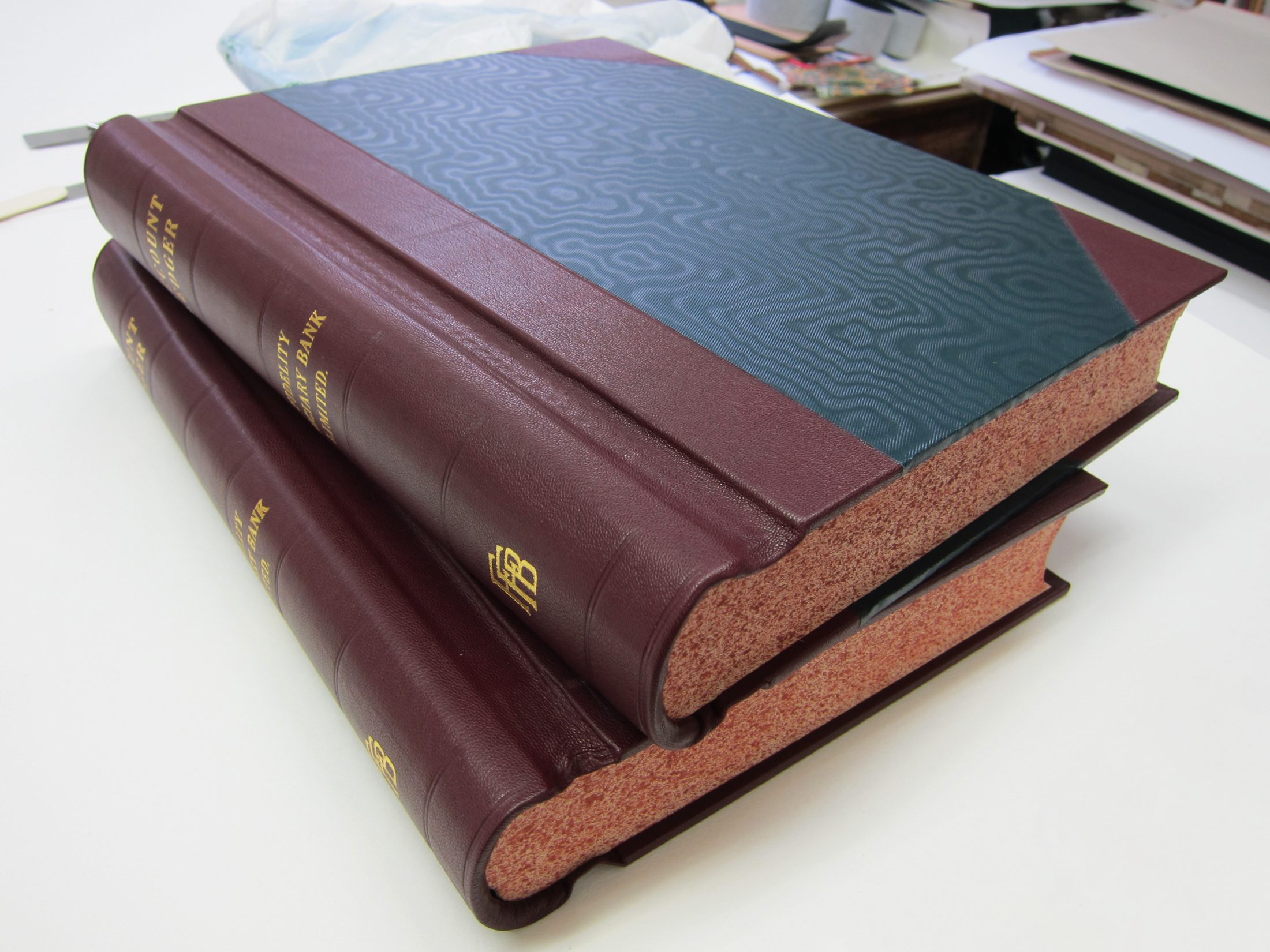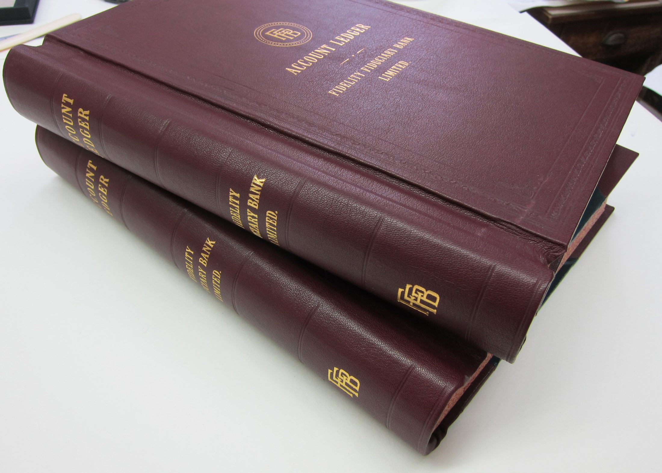 Various leather bound account books replicating old volumes produced for the film. The books are bound in the traditional spring-back account book style with indexed internal pages and edge colouring.