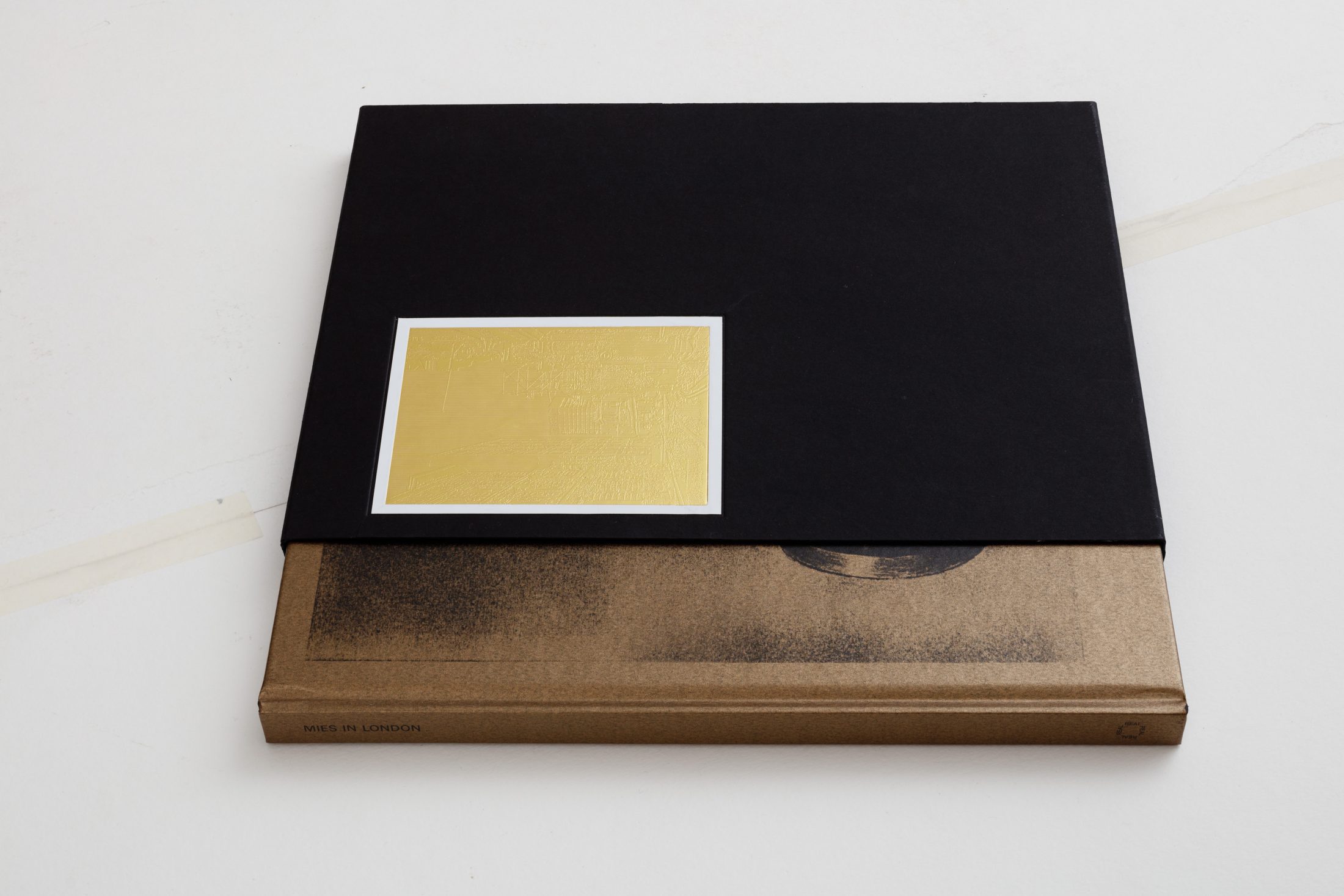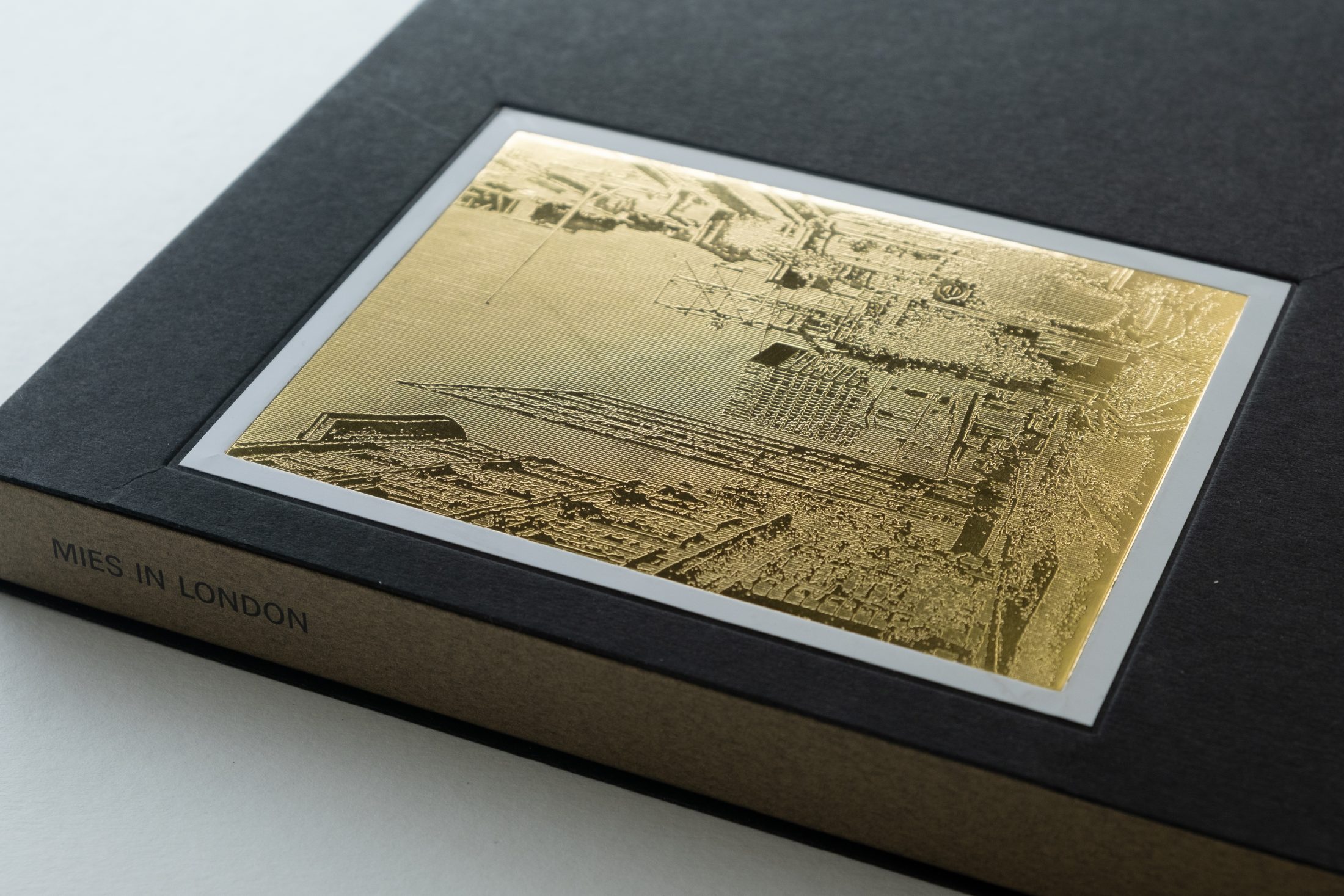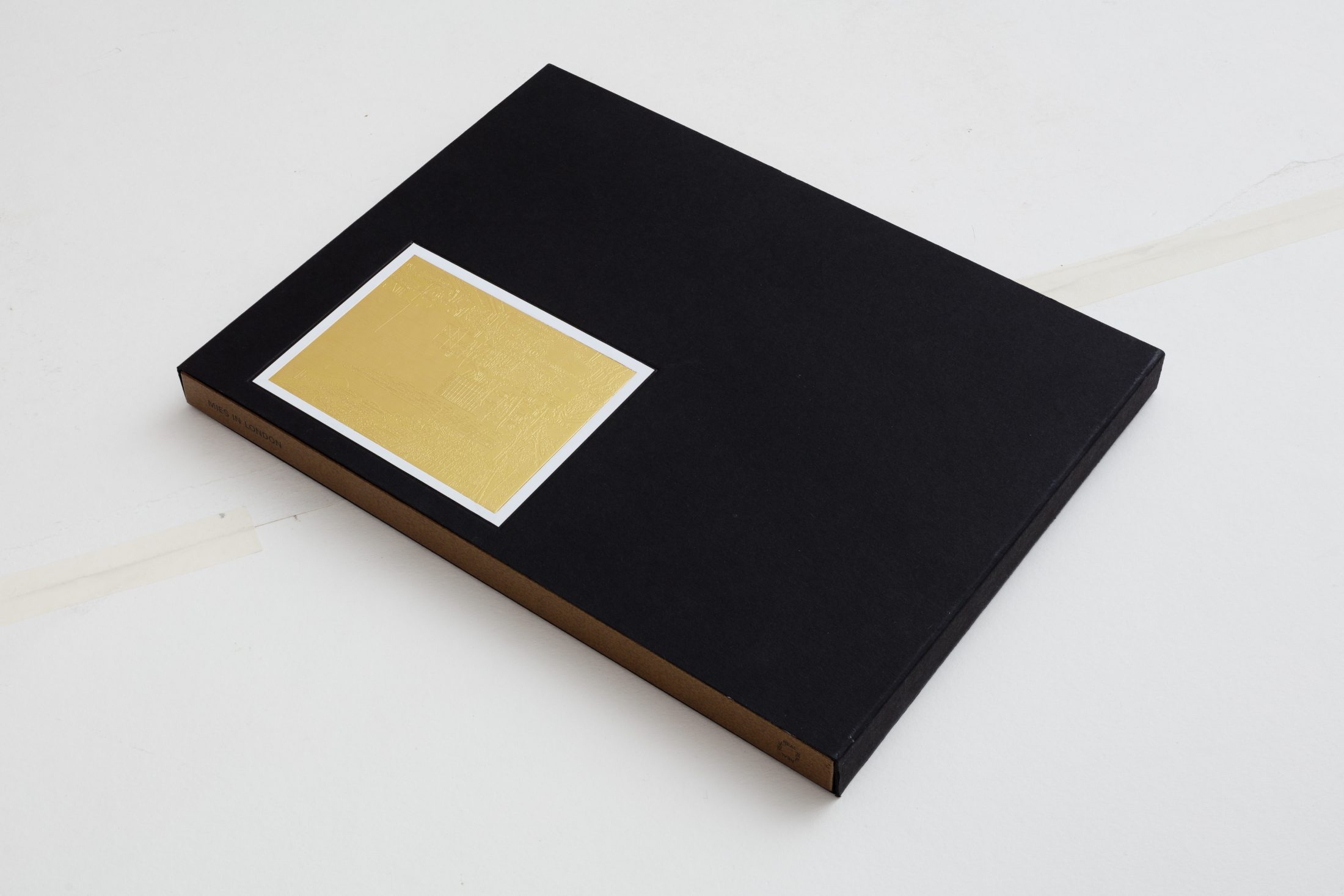 Printed paper covered book with paper covered board slipcase. The solid gold panel on the front of the slipcase is foil blocked with a multi-layered design and inlaid into a recess.