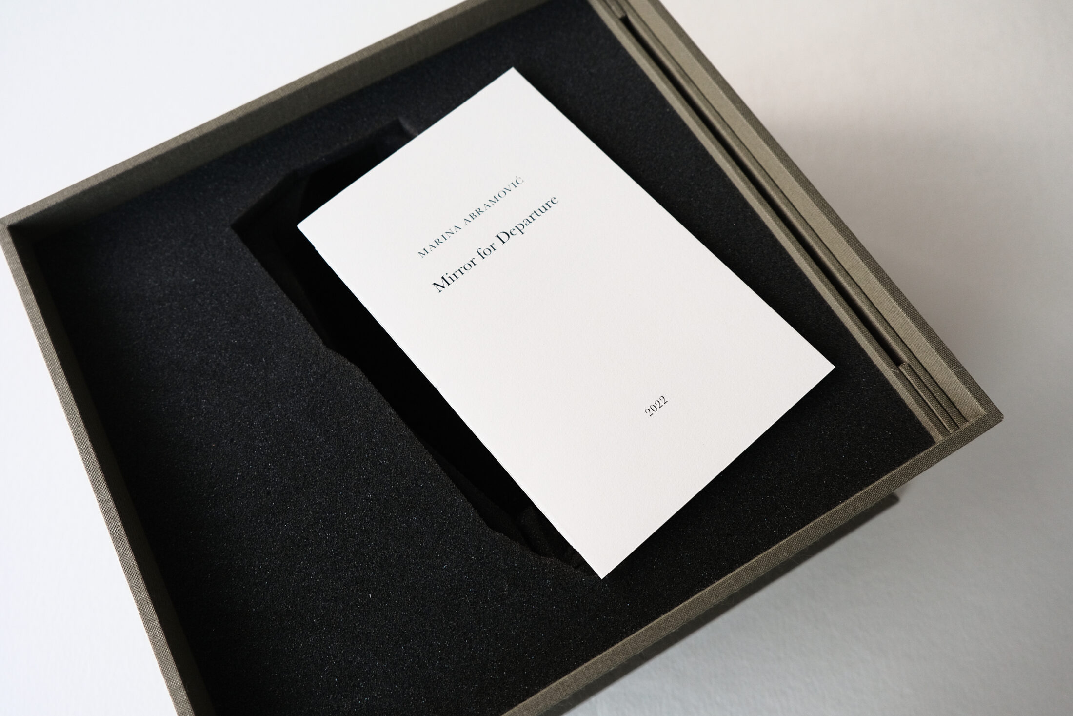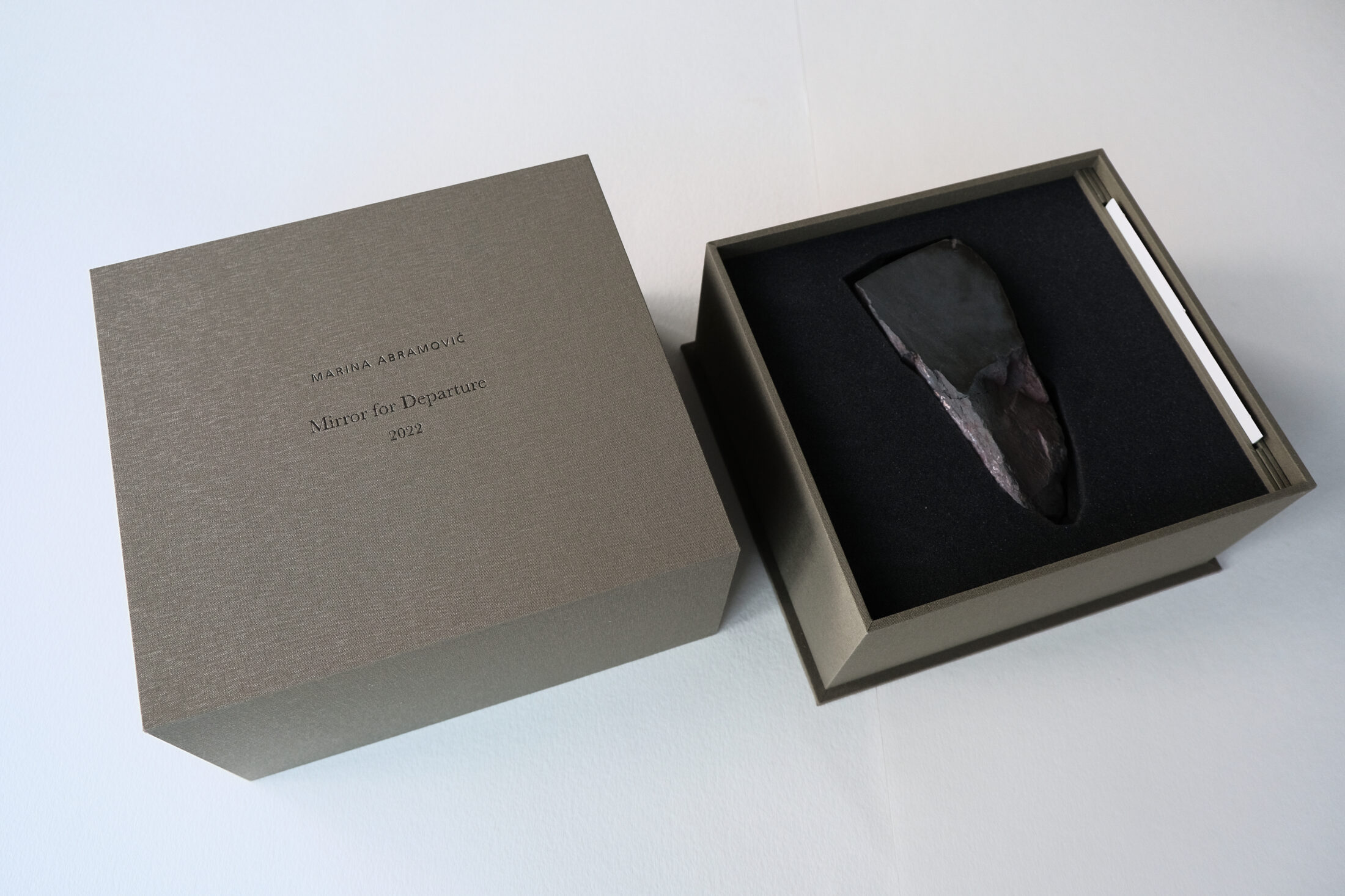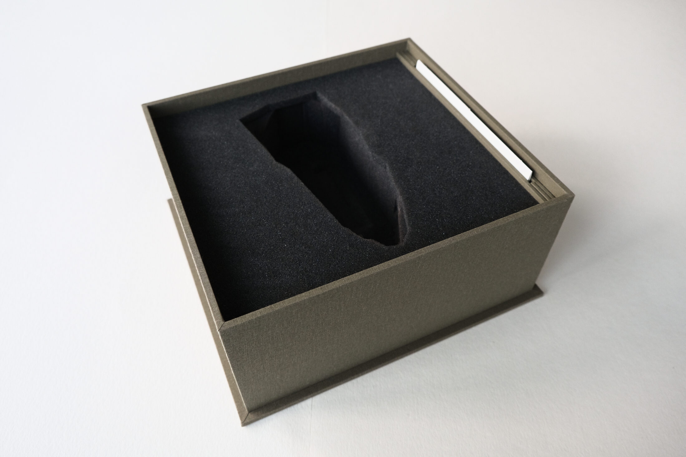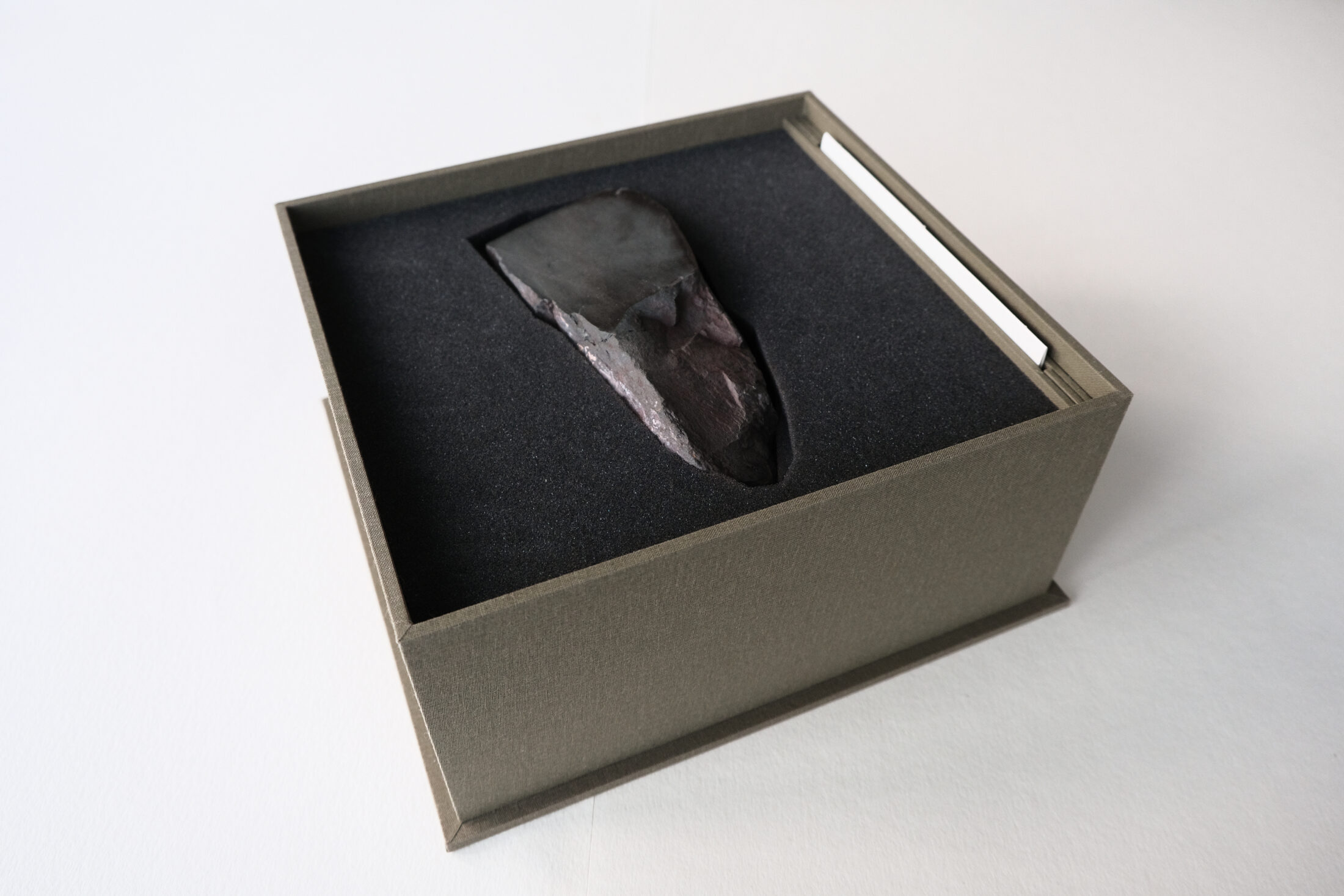 An edition of 25 specially made boxes to contain an artists’ multiple consisting of varying sizes and shapes of Haematite pieces. The interior of the box also contains a small booklet that slips into a pocket that describes the work.