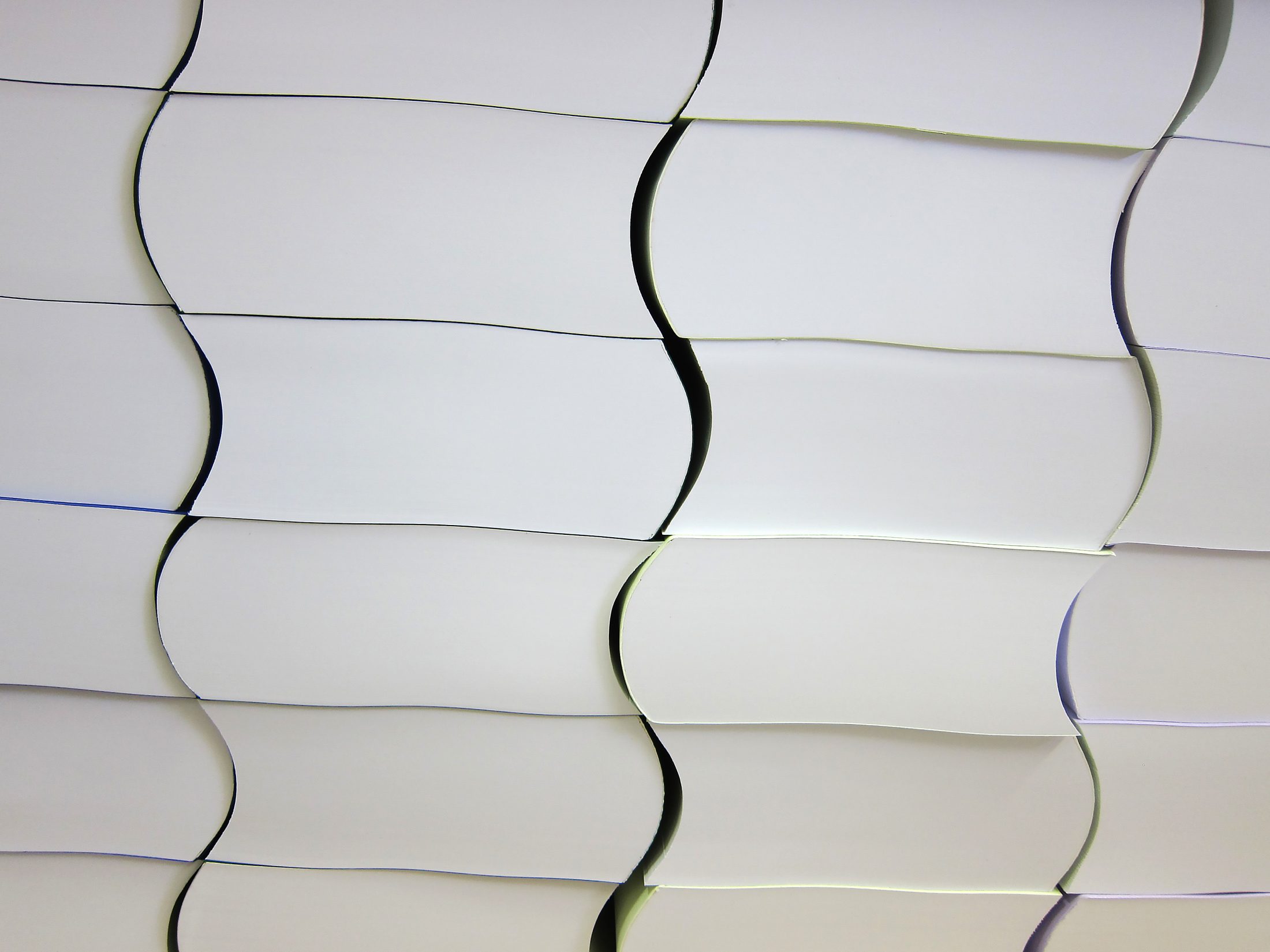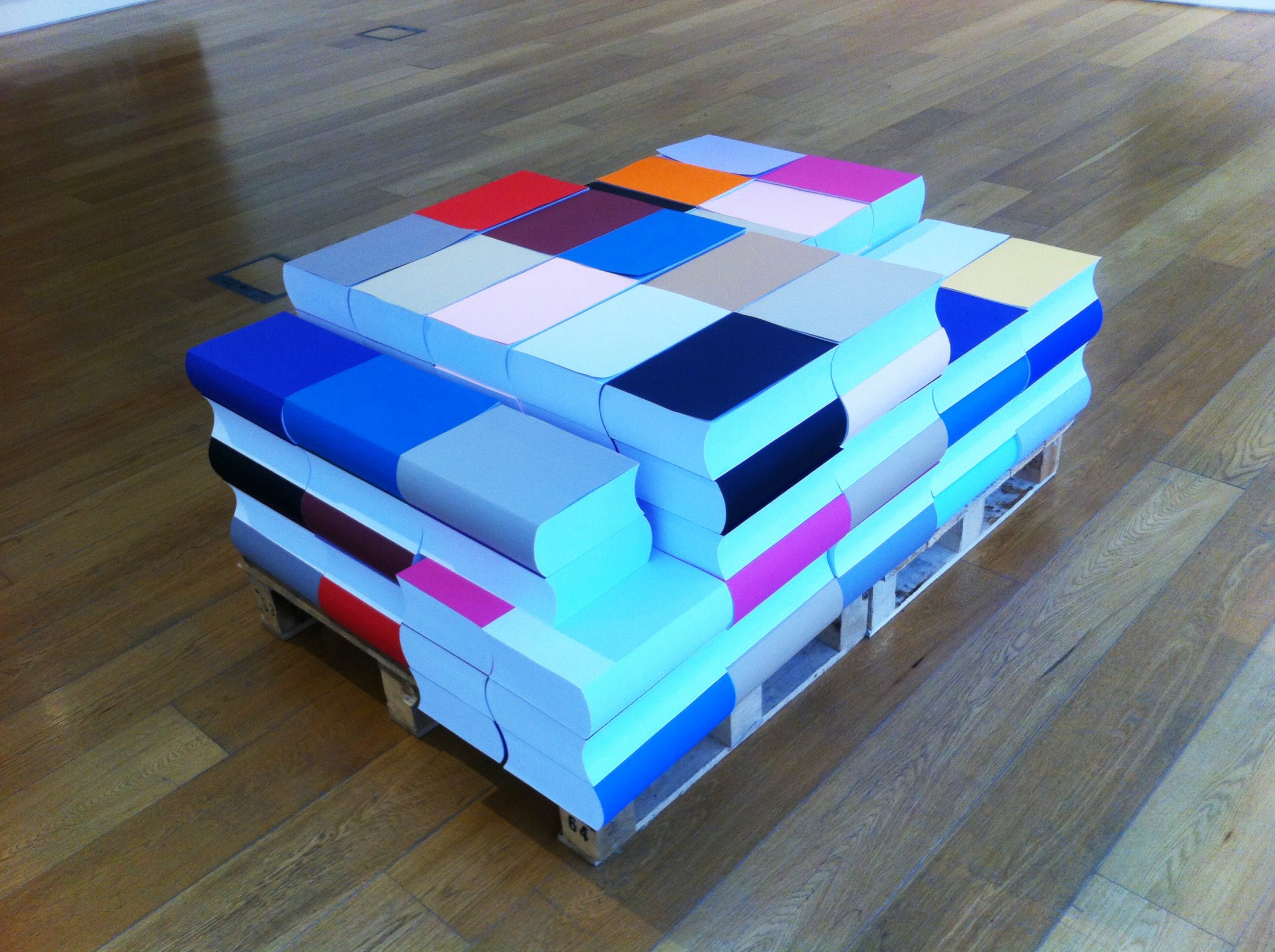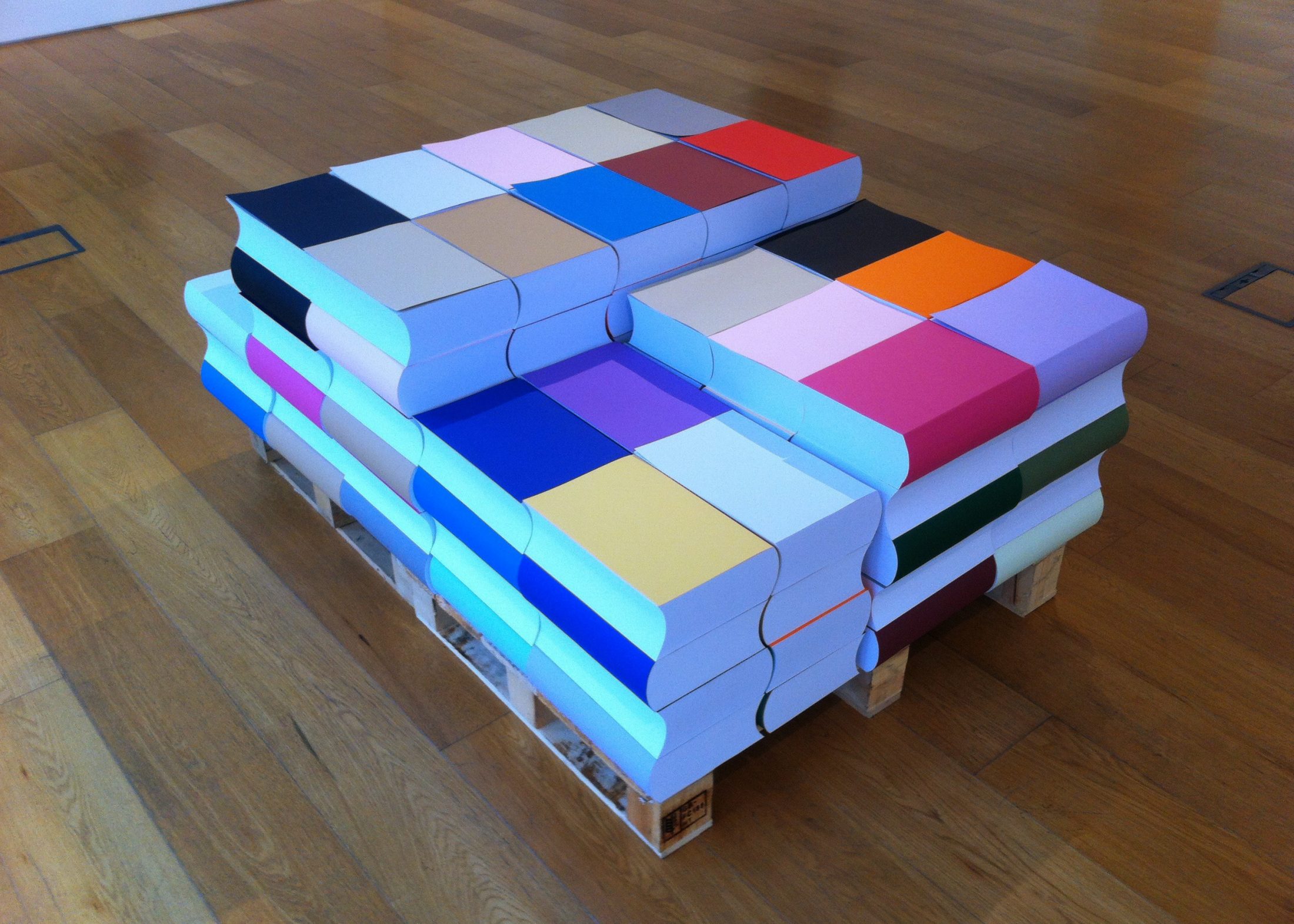 A book sculpture created as part of an installation with different coloured blank books with rounded spines.