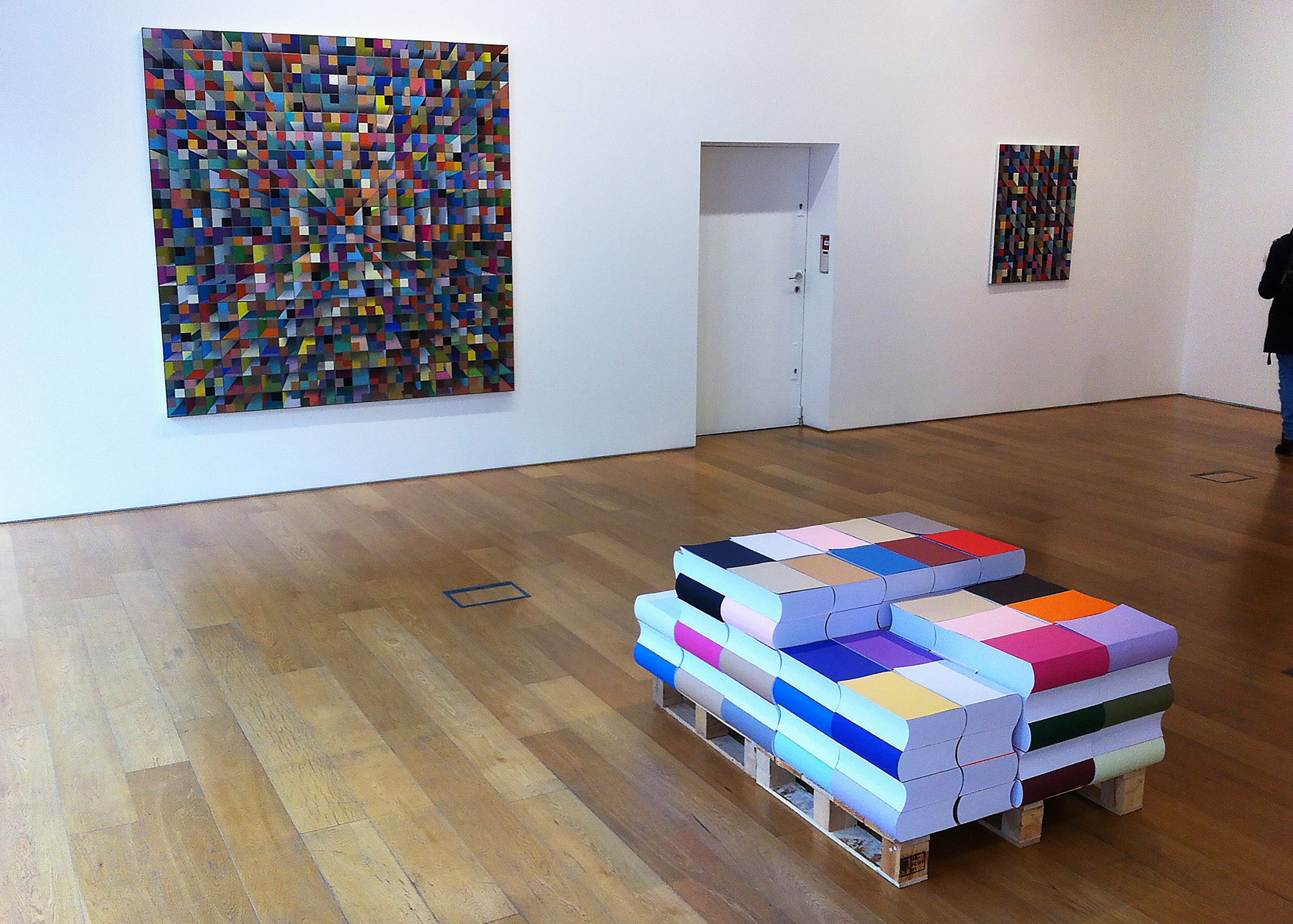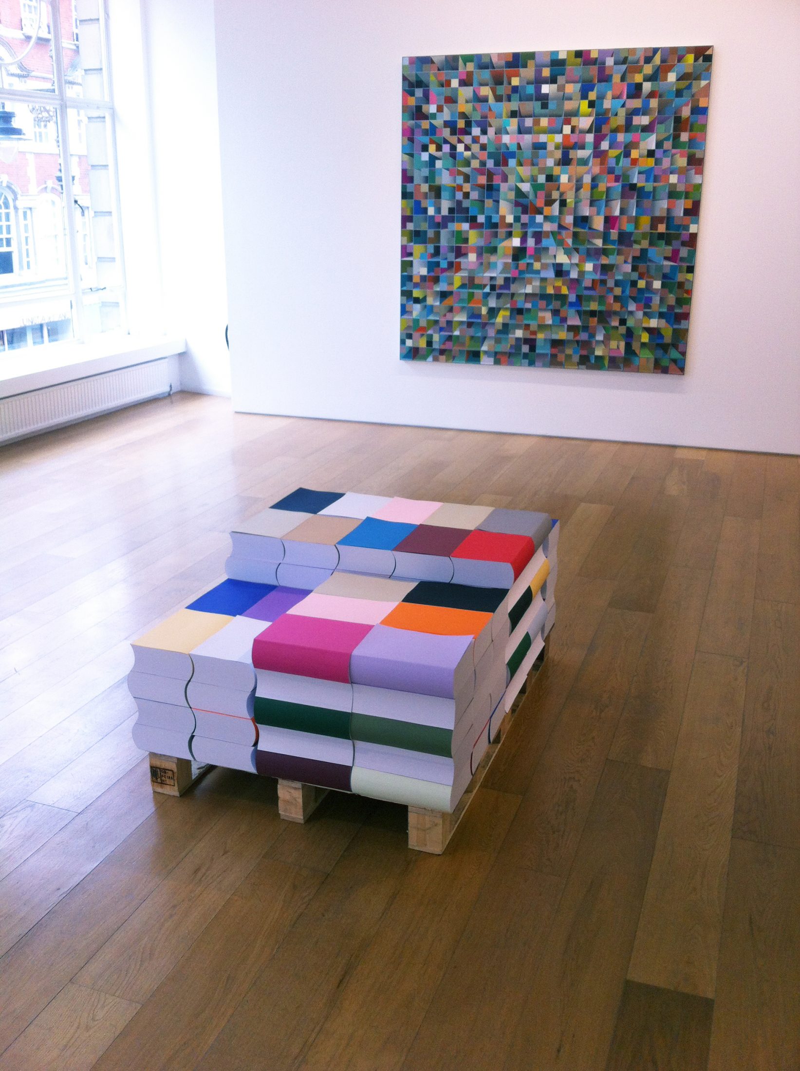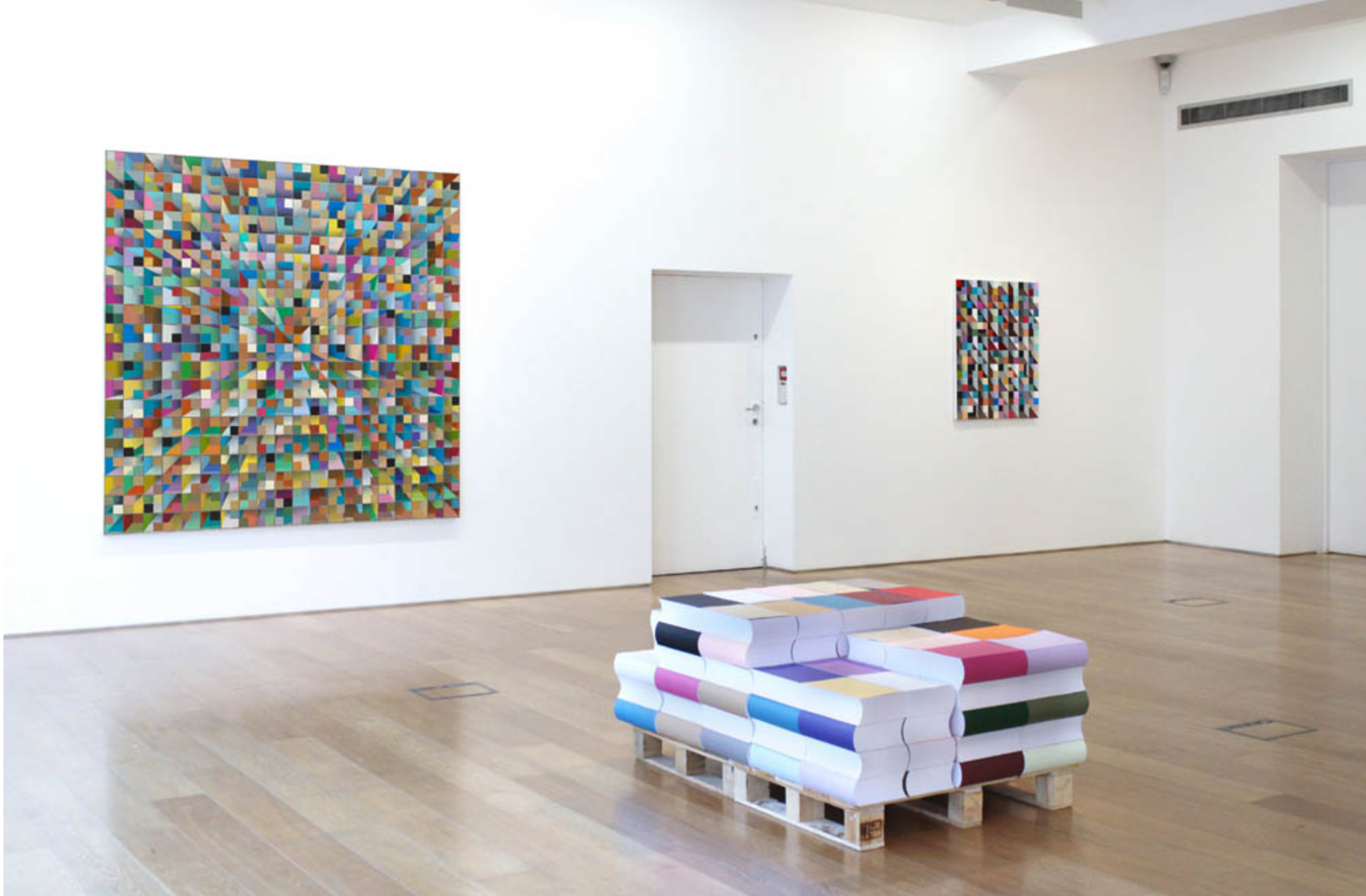A book sculpture created as part of an installation with different coloured blank books with rounded spines.
