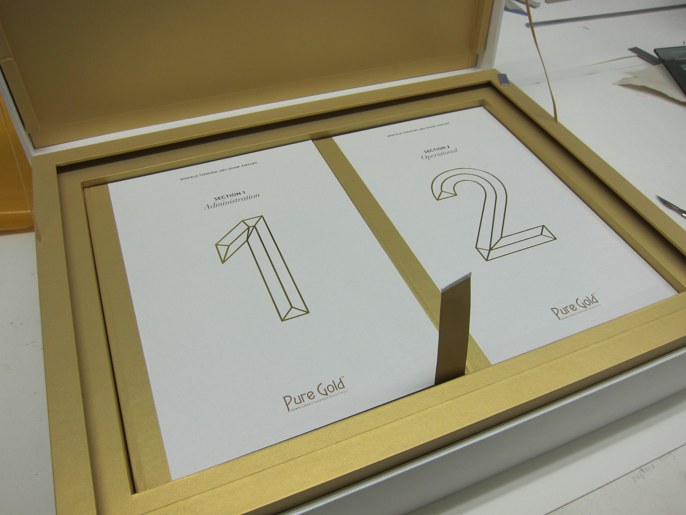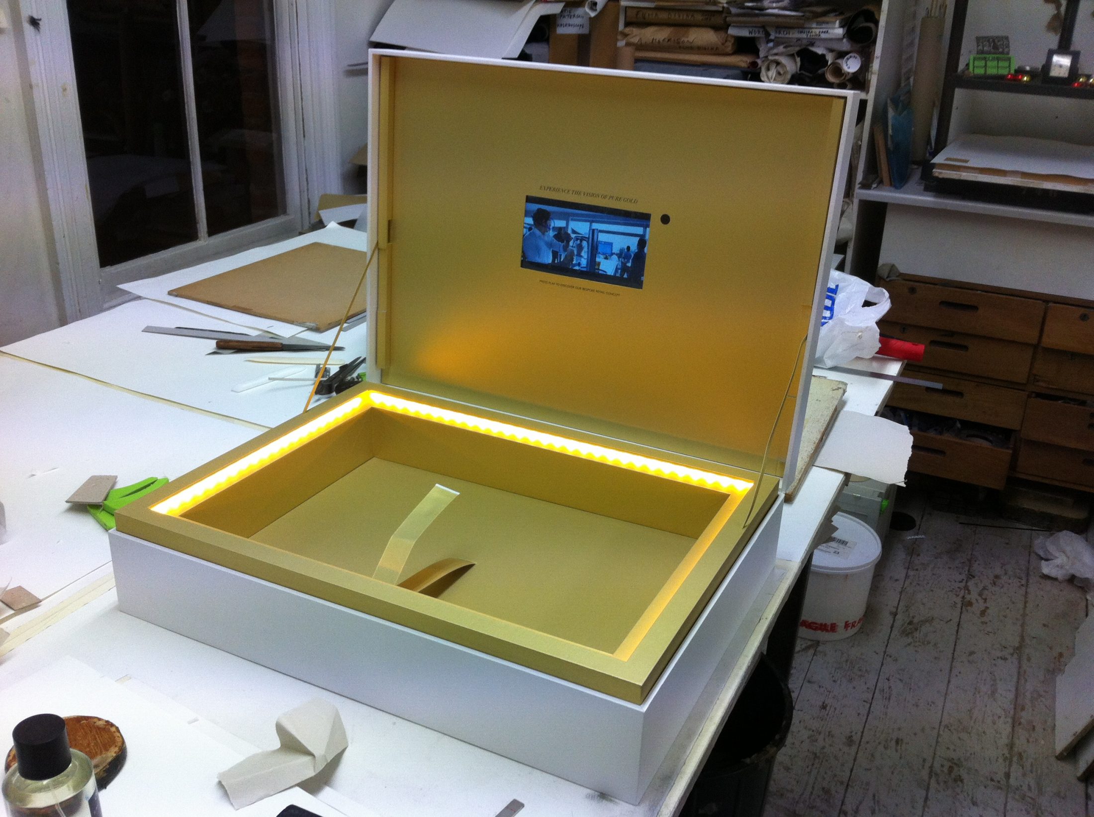 Paper covered hinged case containing various books and printed panels for a business proposal. The box automatically illuminates the interior when the lid is opened. The video screen contained inside the lid is operated by simply touching the ‘on’ button to the top right of the screen.