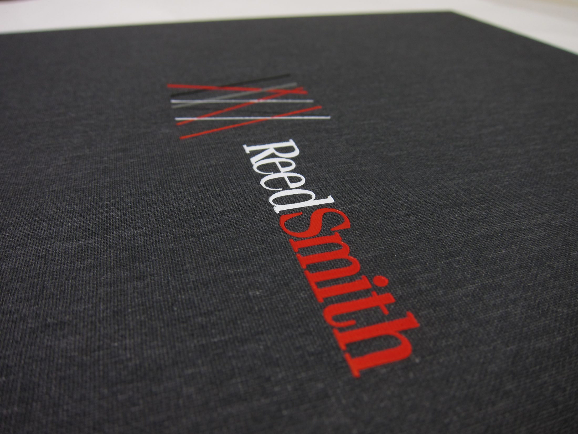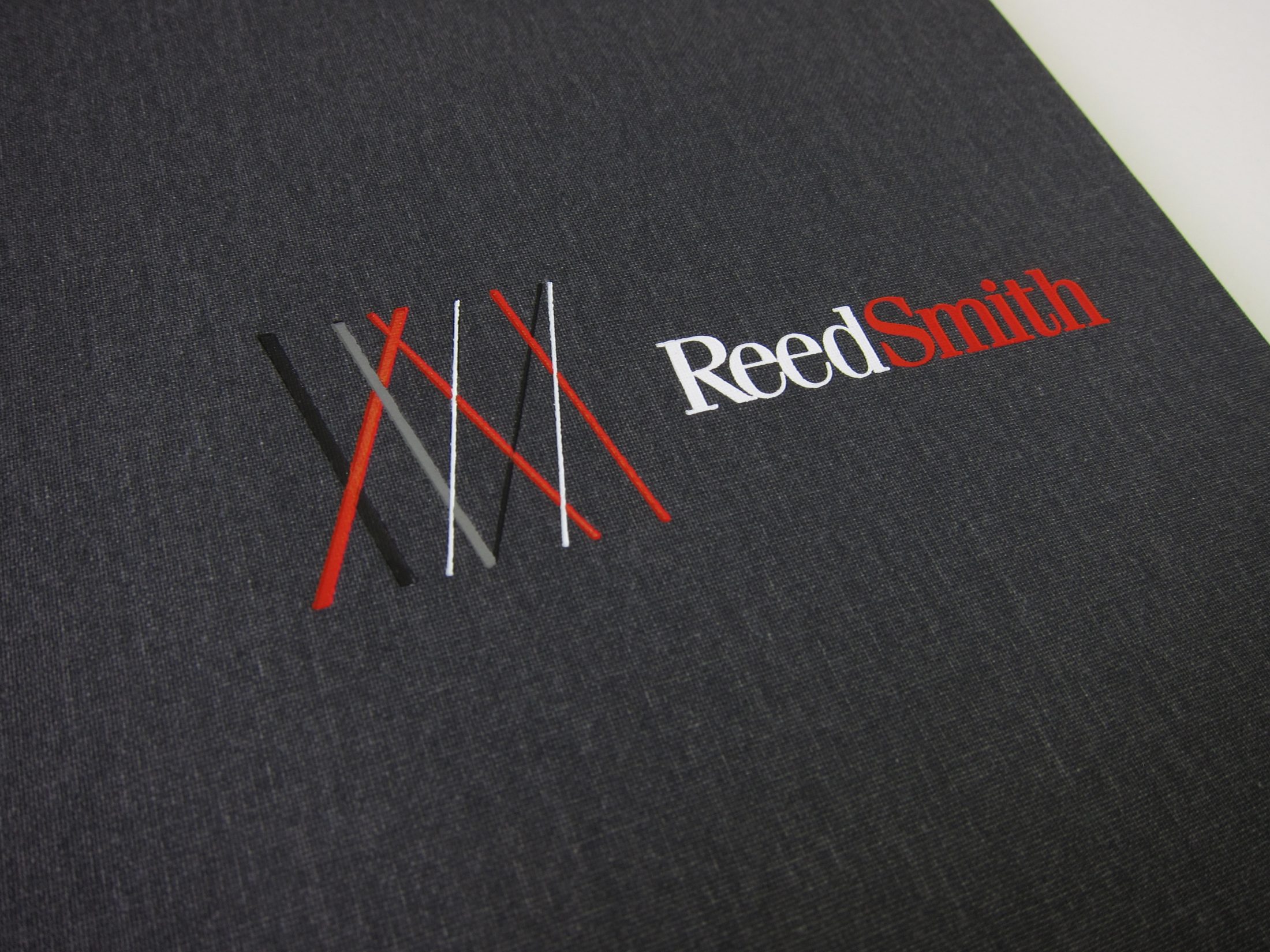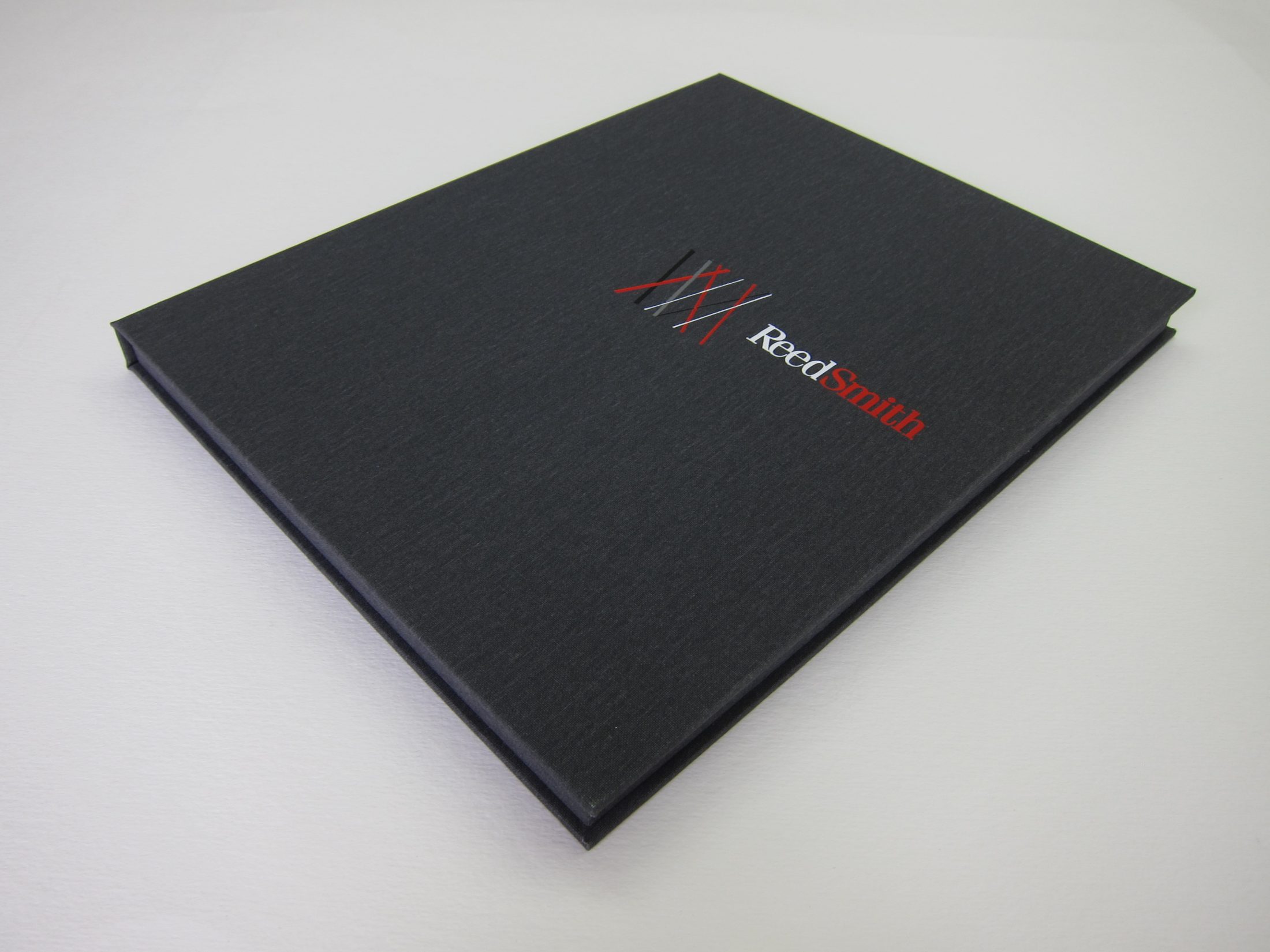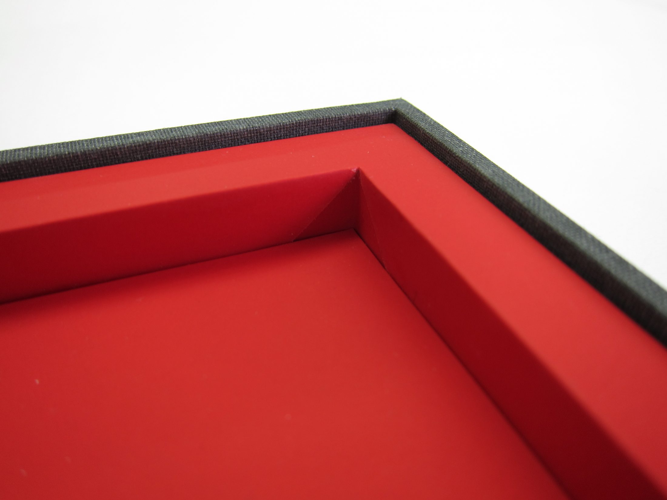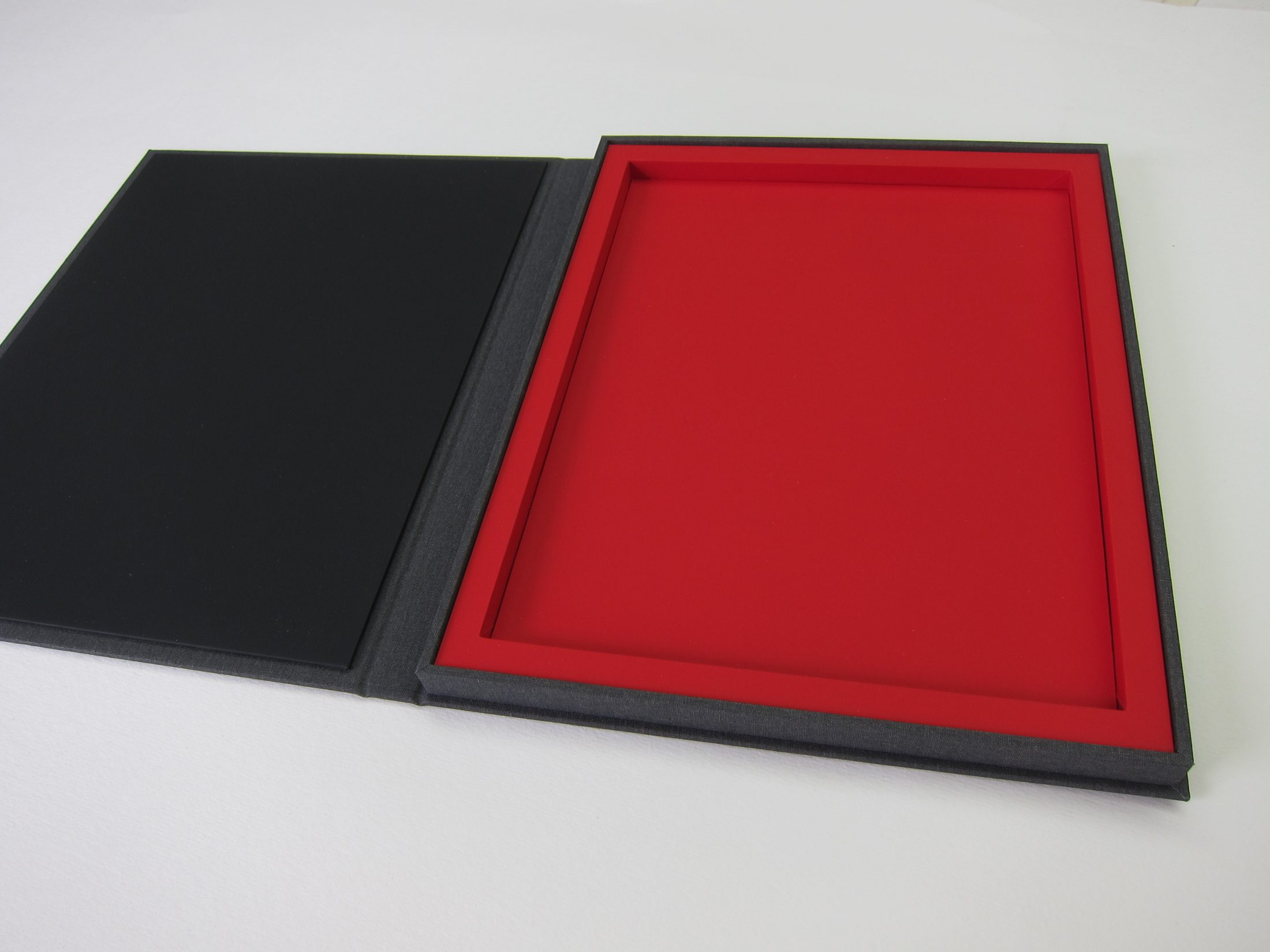 A cloth covered solander box with flat panelled lid created for a presentation. The inner right hand side features a four sided tray with a separate red lined frame. The foil blocking on the front cover is made up of three colours.