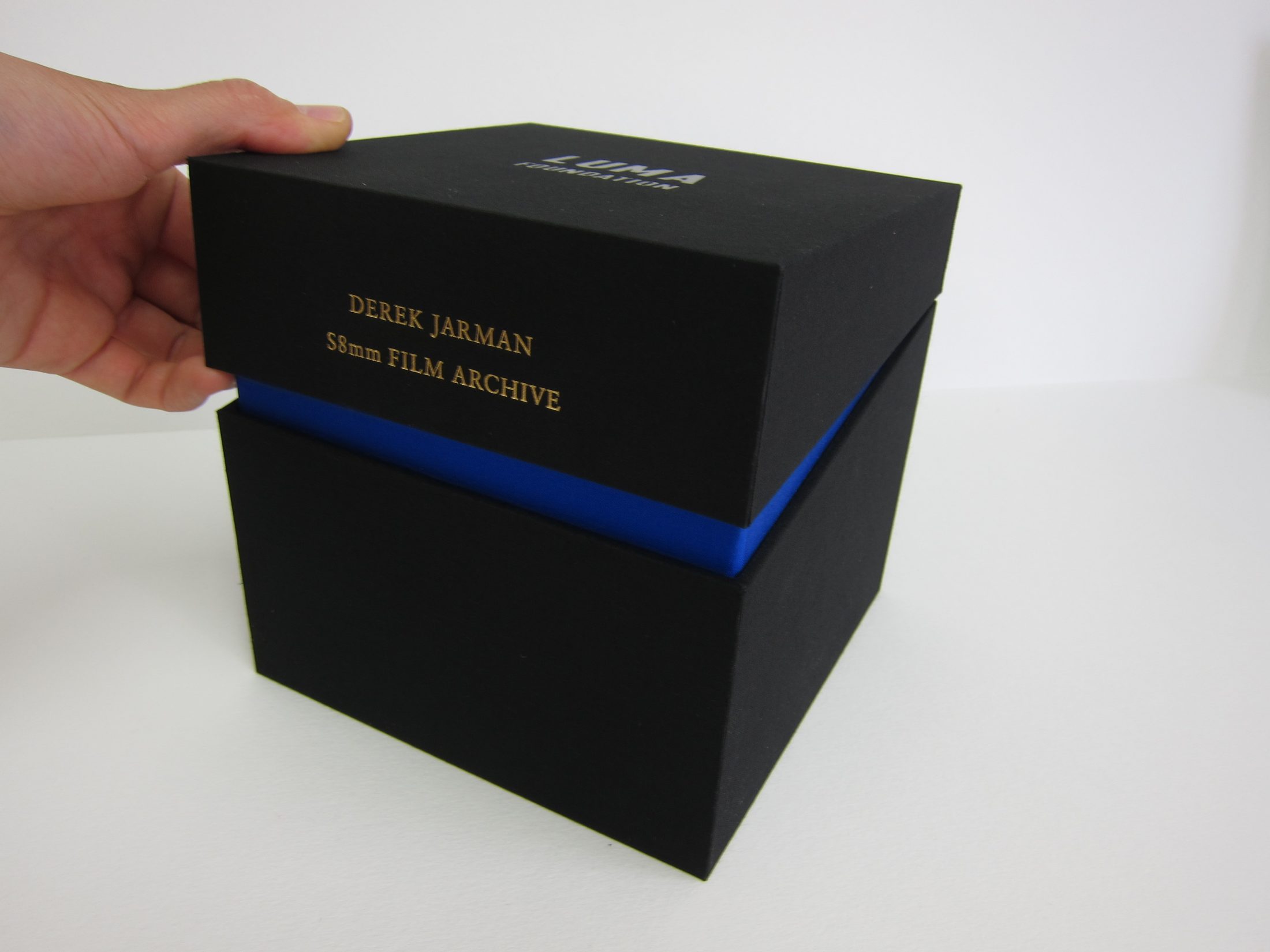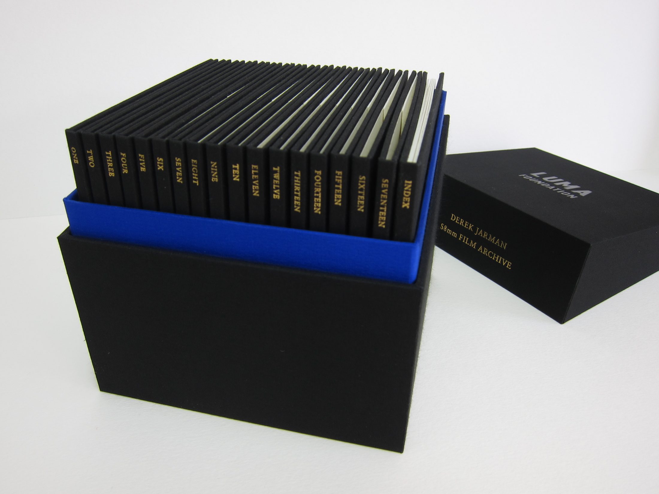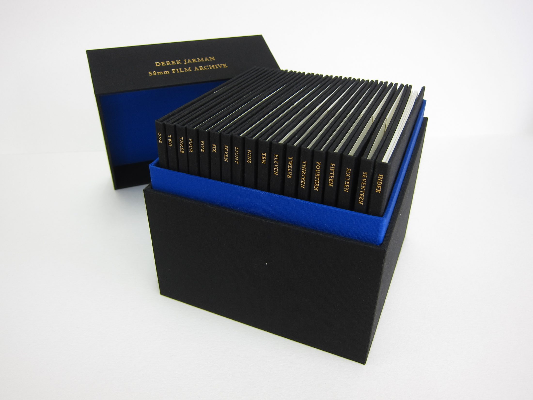 Two-part cloth covered box to contain a series of DVD cases. The boxes are lined with specially printed Yves Klein blue panels. Foil blocked titles throughout.