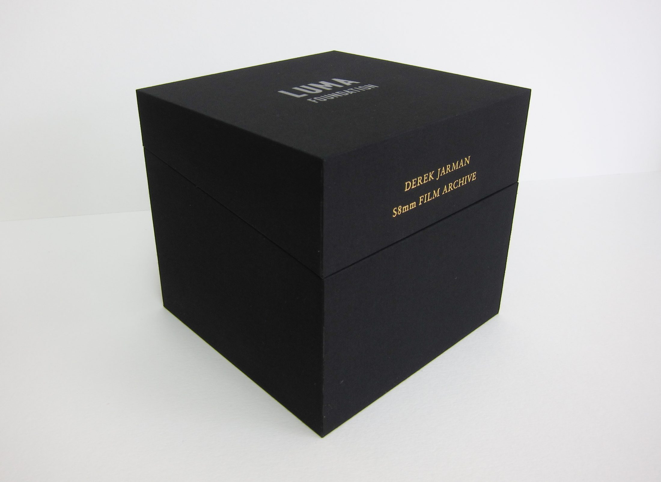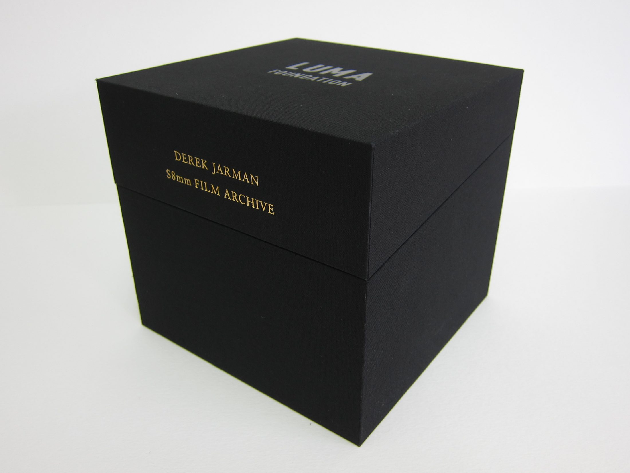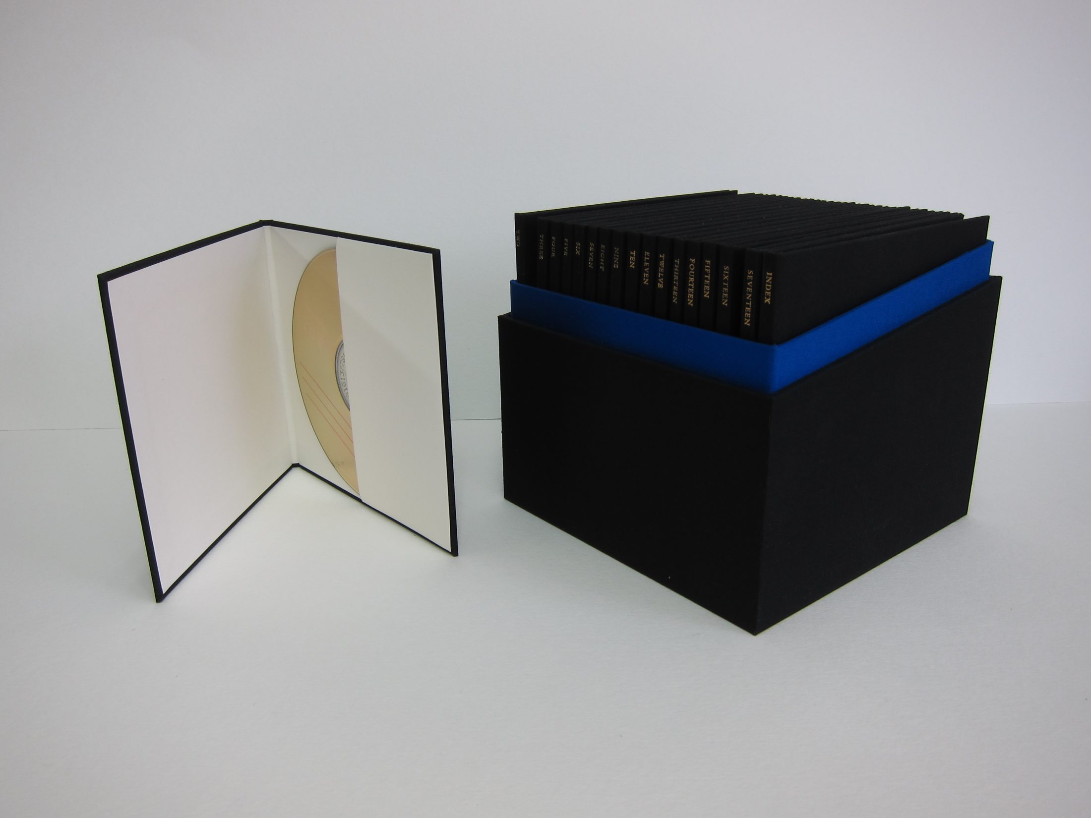 Two-part cloth covered box to contain a series of DVD cases. The boxes are lined with specially printed Yves Klein blue panels. Foil blocked titles throughout.