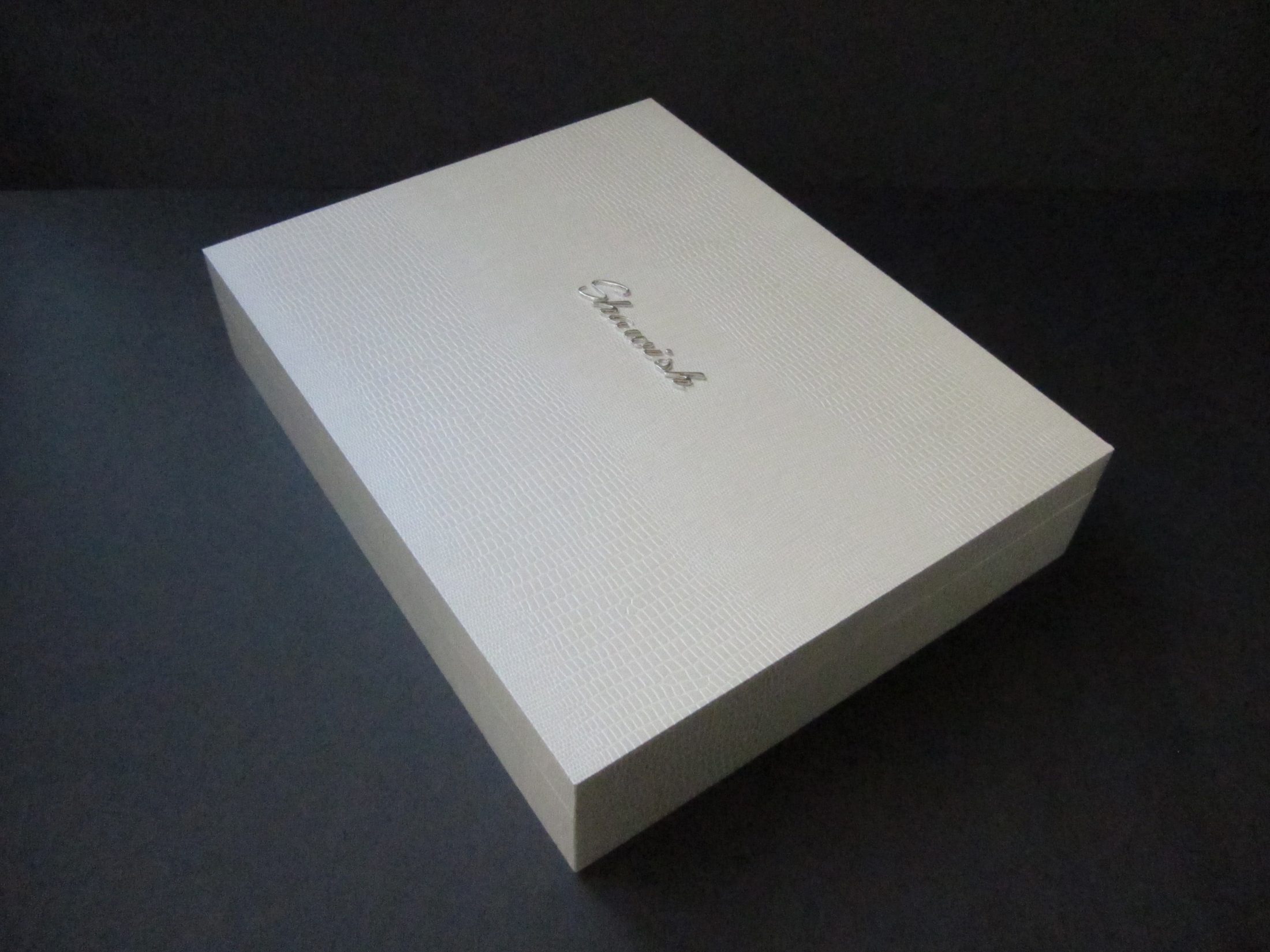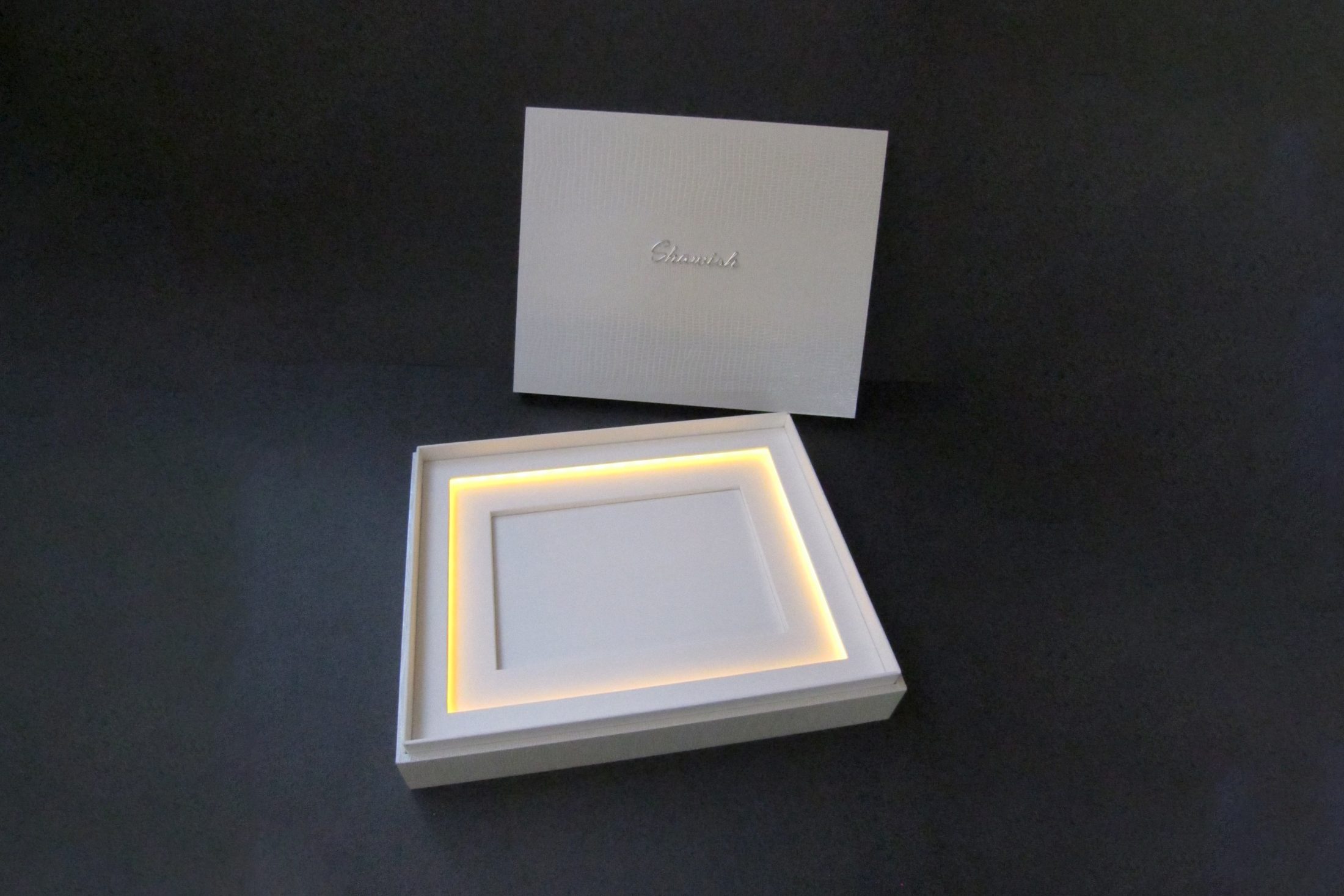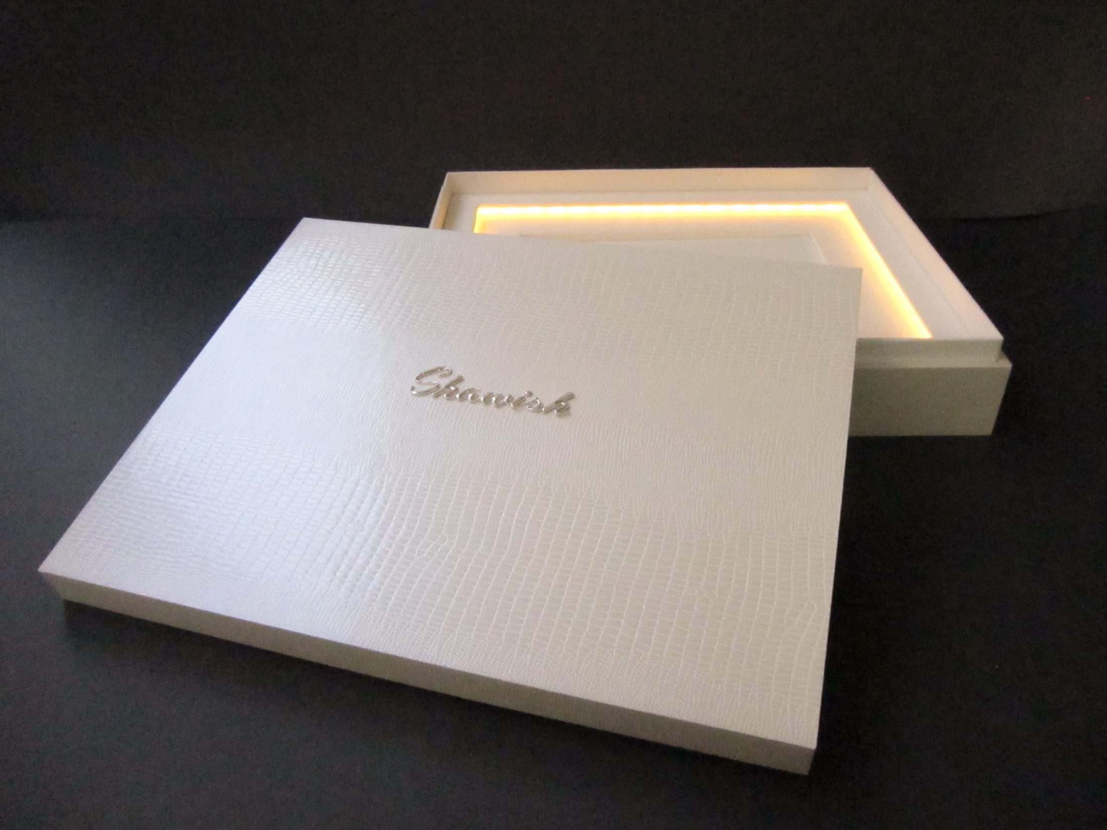 A series of specially created two-part boxes to hold an iPad, with the lid featuring a cast silver title. Once the lid is removed the interior is automatically illuminated, highlighting the contents.
