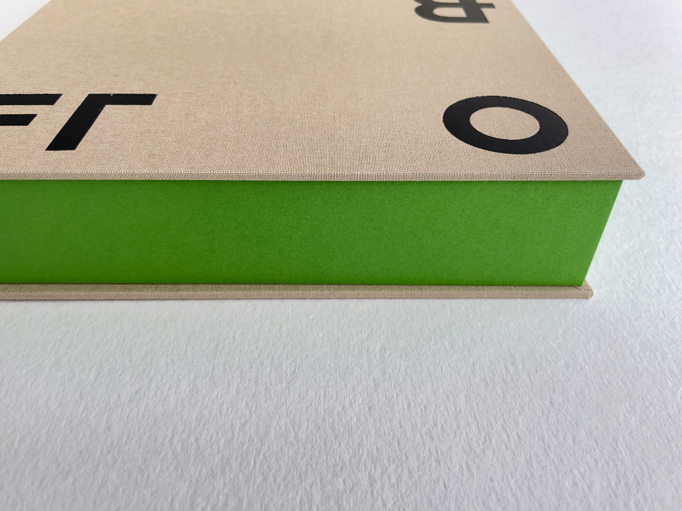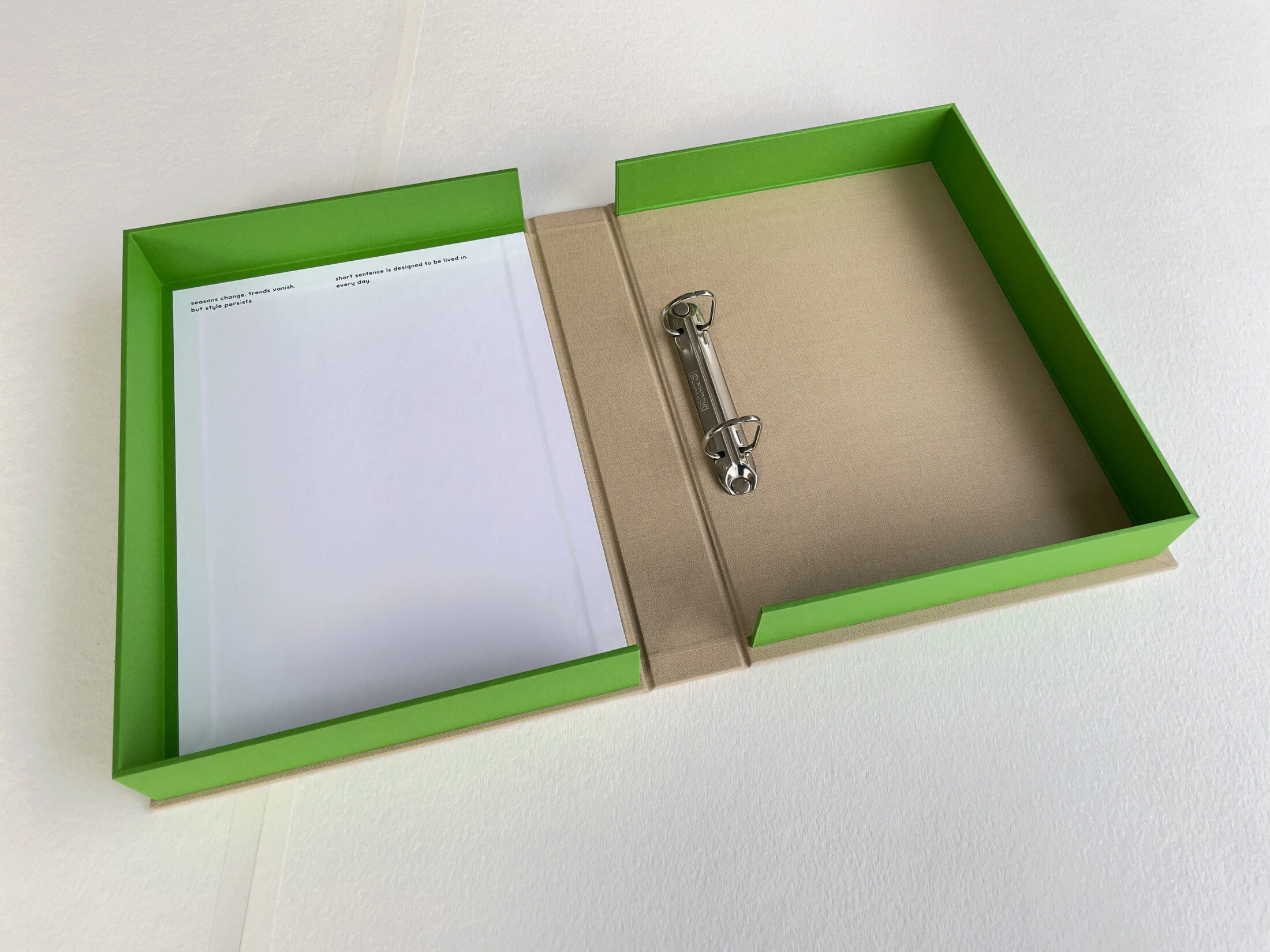 Clamshell style boxes designed by Twelve, covered in two different colours of bookcloth. They have a matt black powder coated ring binder inside, and the cover and spine is foil blocked.