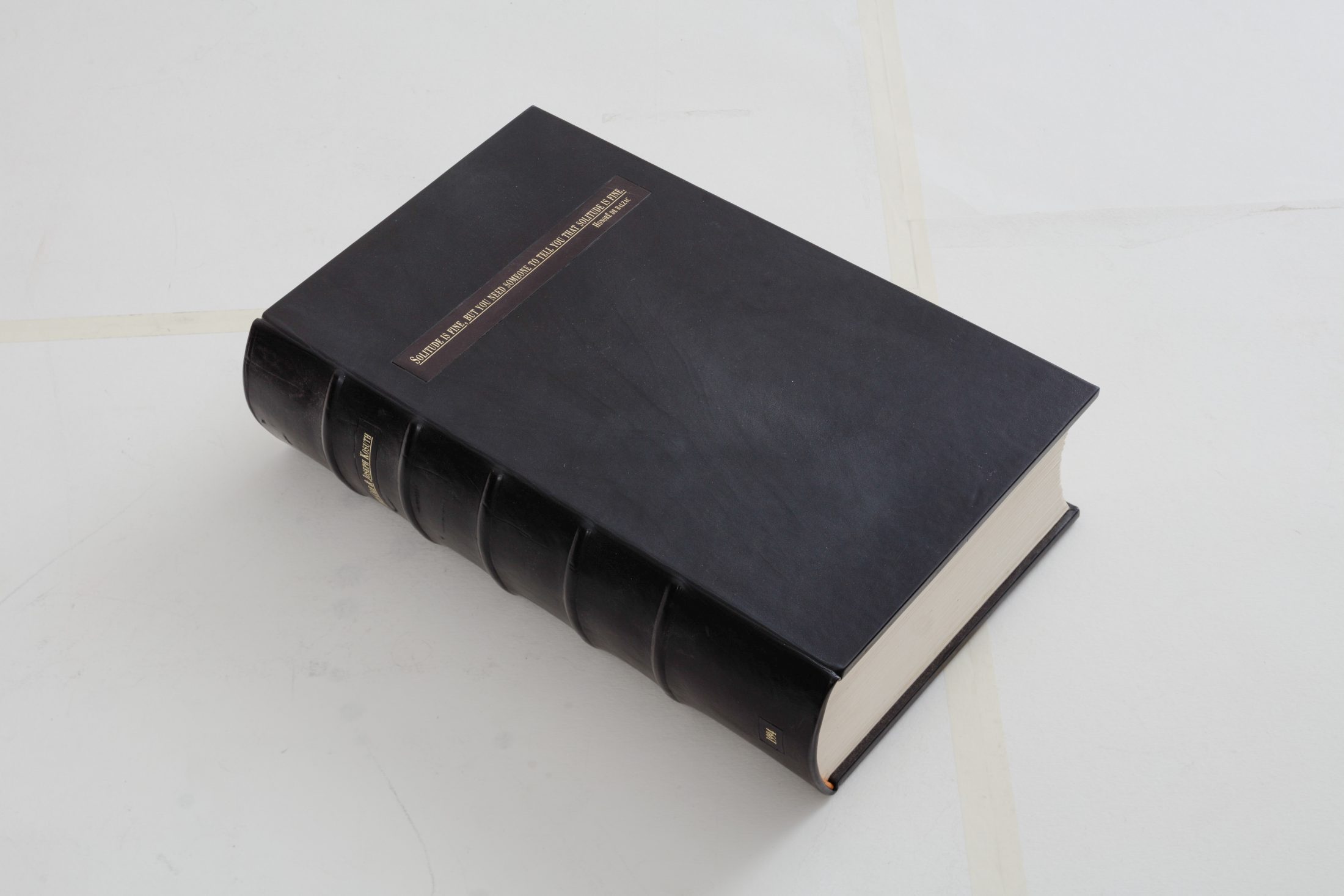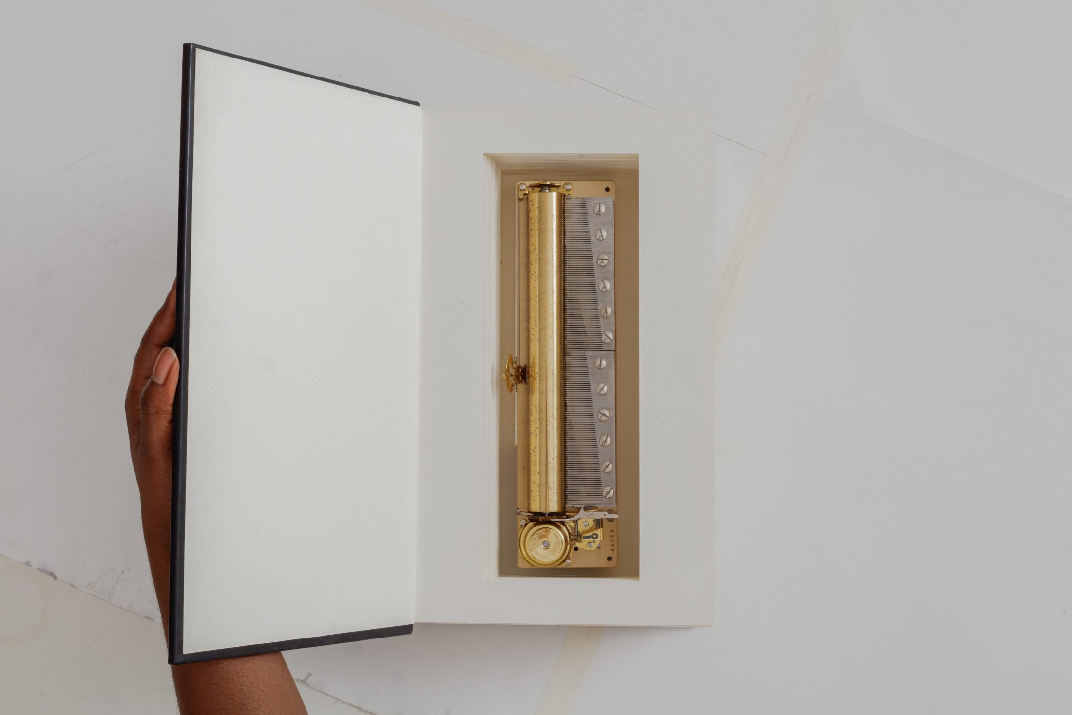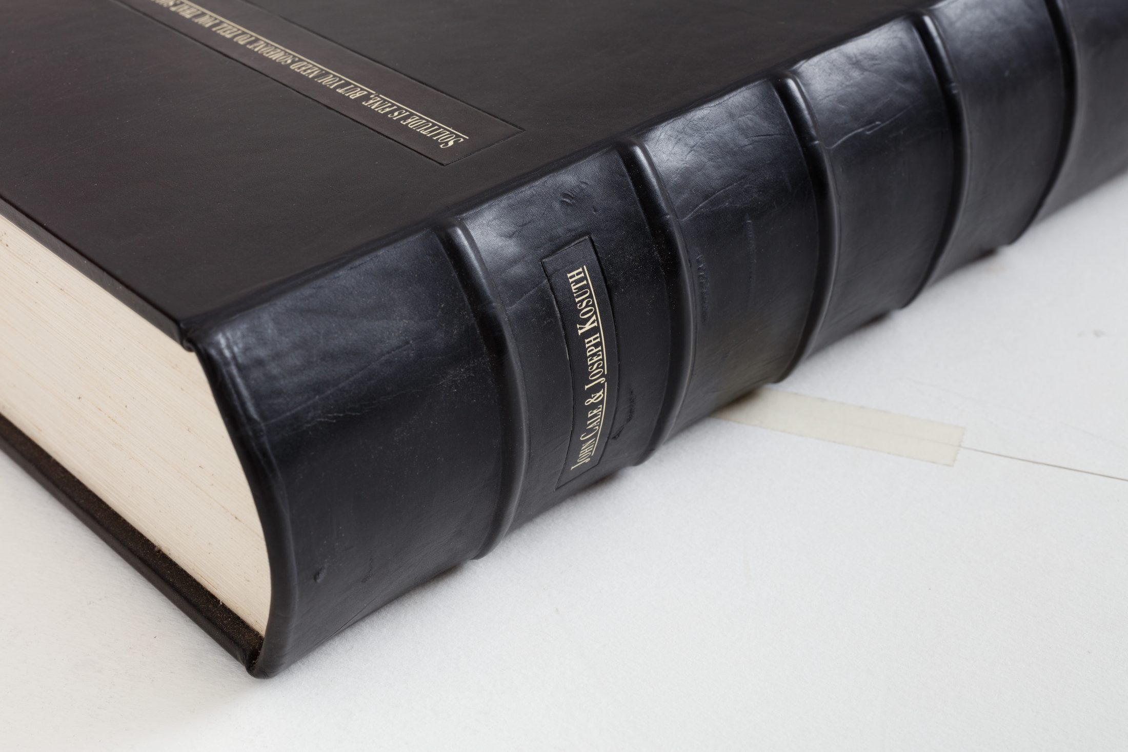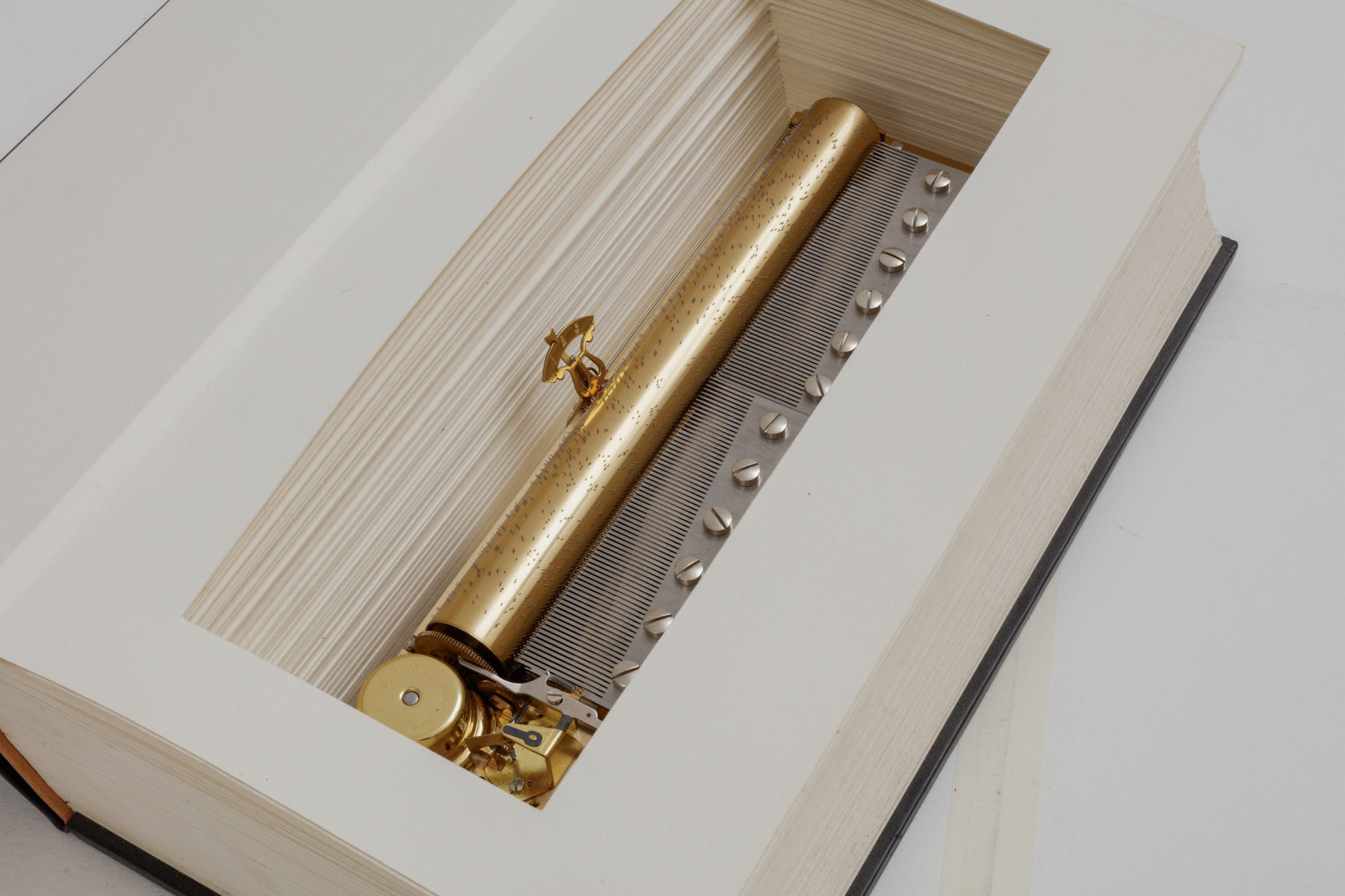 A limited edition Music box produced for Carl Solway Gallery. The book is made from a hollowed out book block of pages and is bound in black calfskin with inlaid titles on the front cover and spine. Each book contains a 144 note musical mechanism that plays 3 different versions of the tune composed by John Cale. The mechanism is mounted on a soundbox that has steel studs running through to the back cover to enhance the sound.
