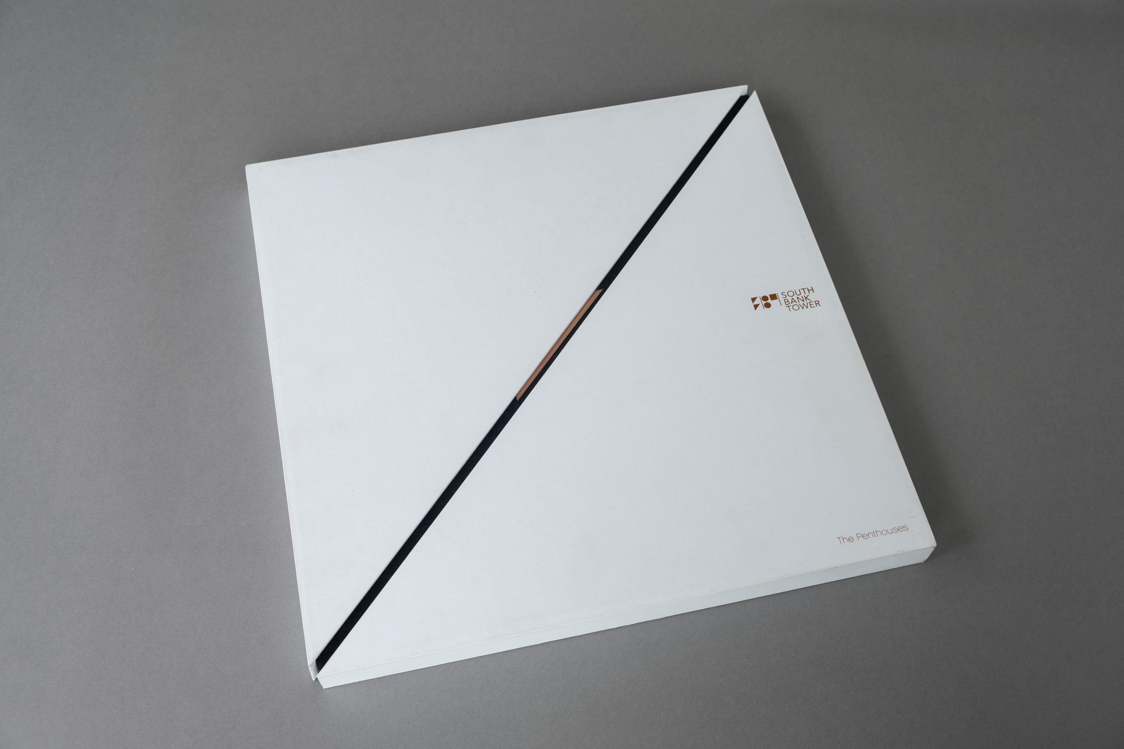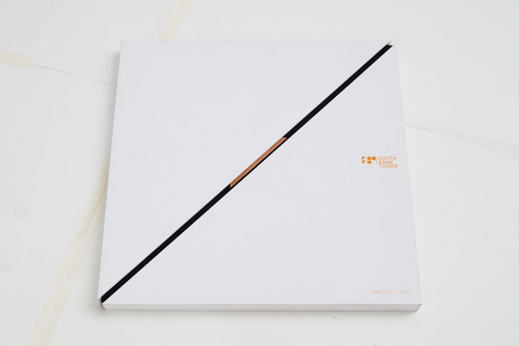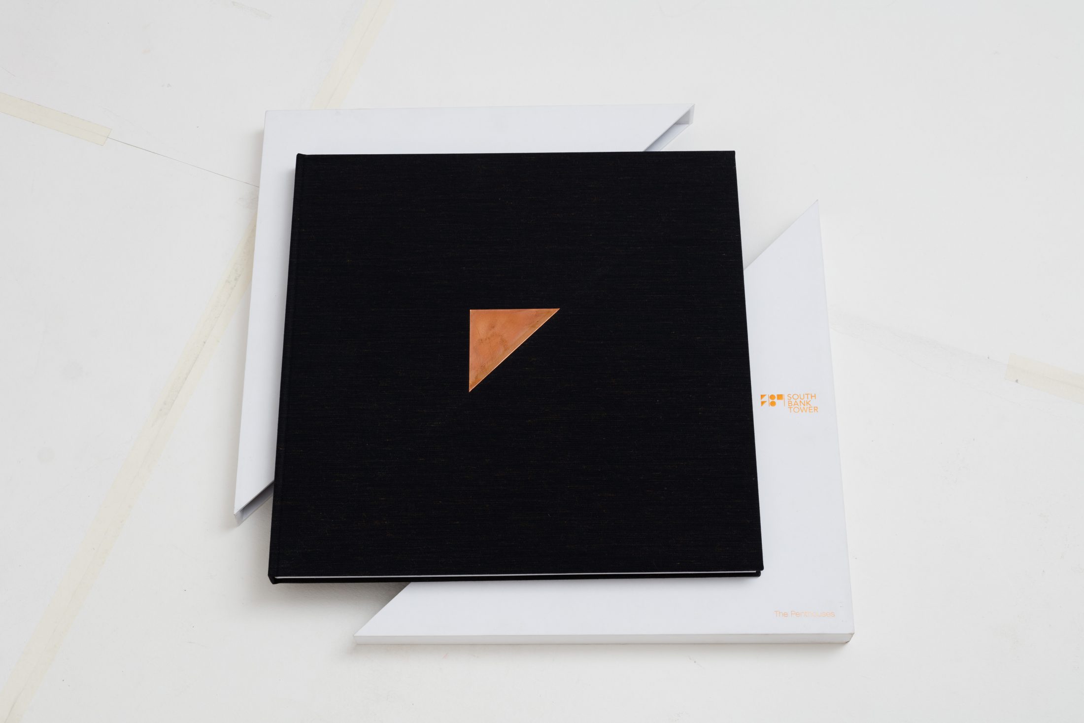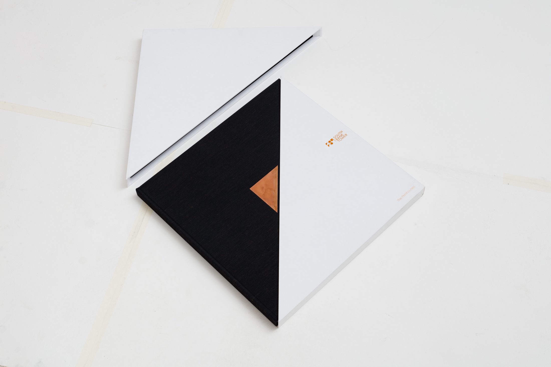 Printed and bound presentation books promoting a real estate property. Bound in bookcloth with a copper triangle inlaid onto the front cover. The paper covered two-part case housing the book fits perfectly across the diagonal to highlight the edge of the copper triangle.