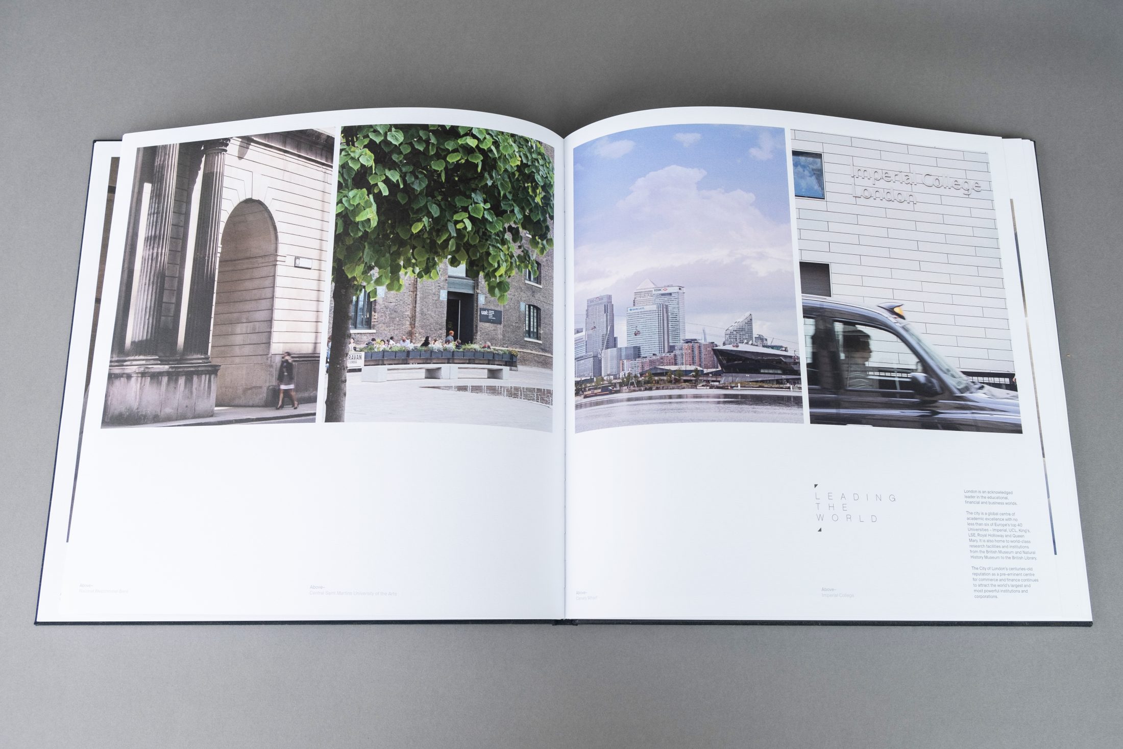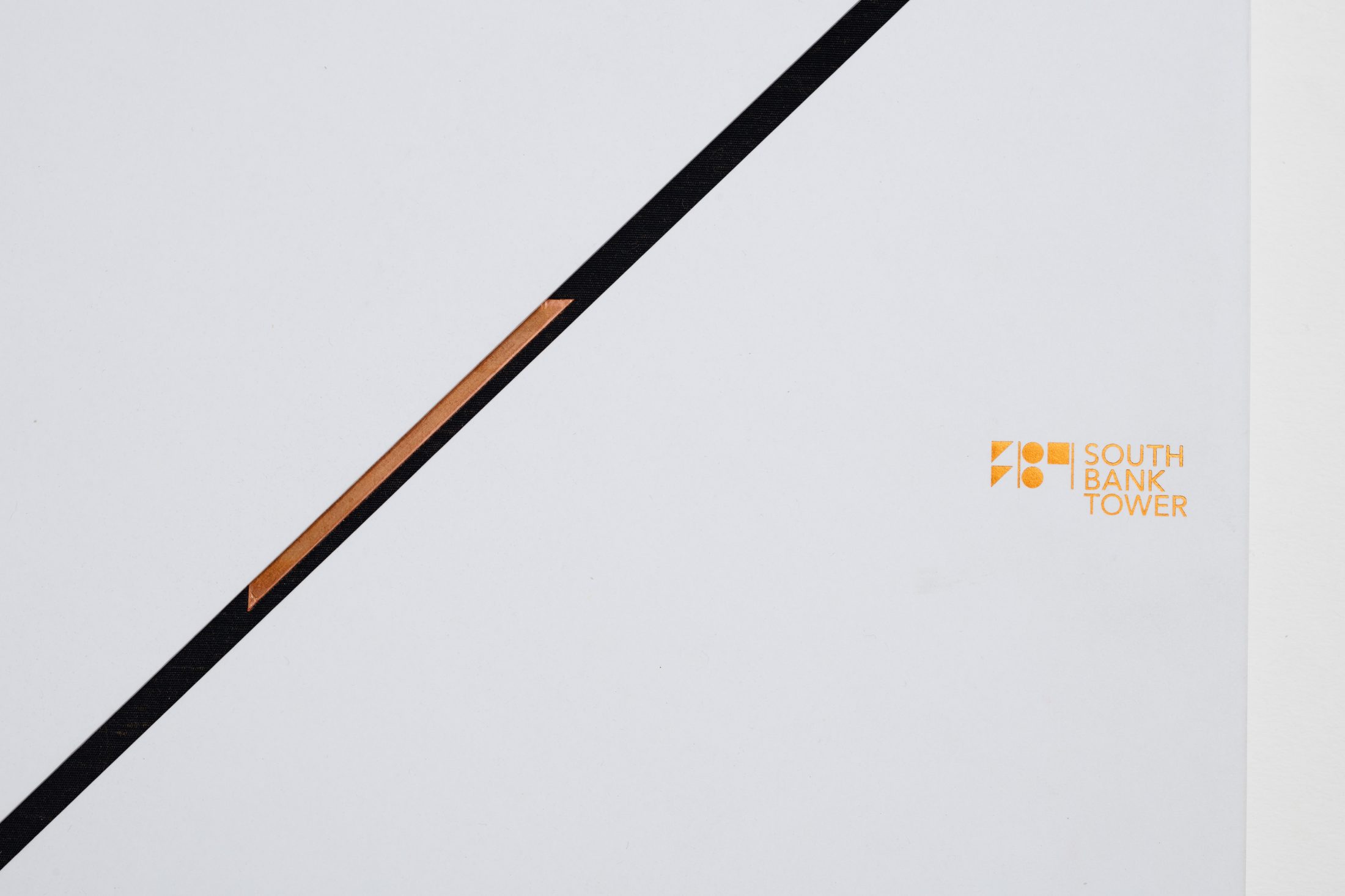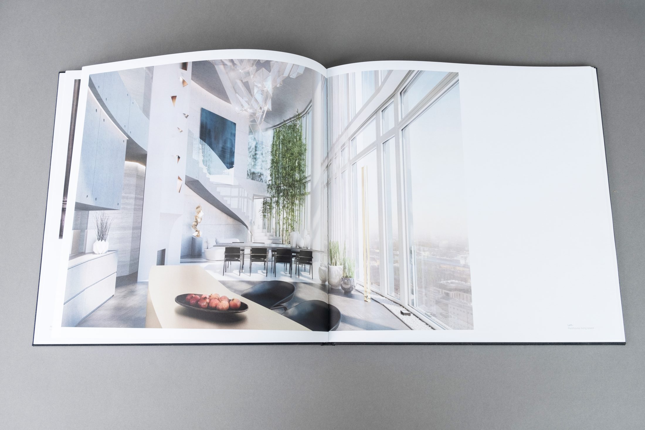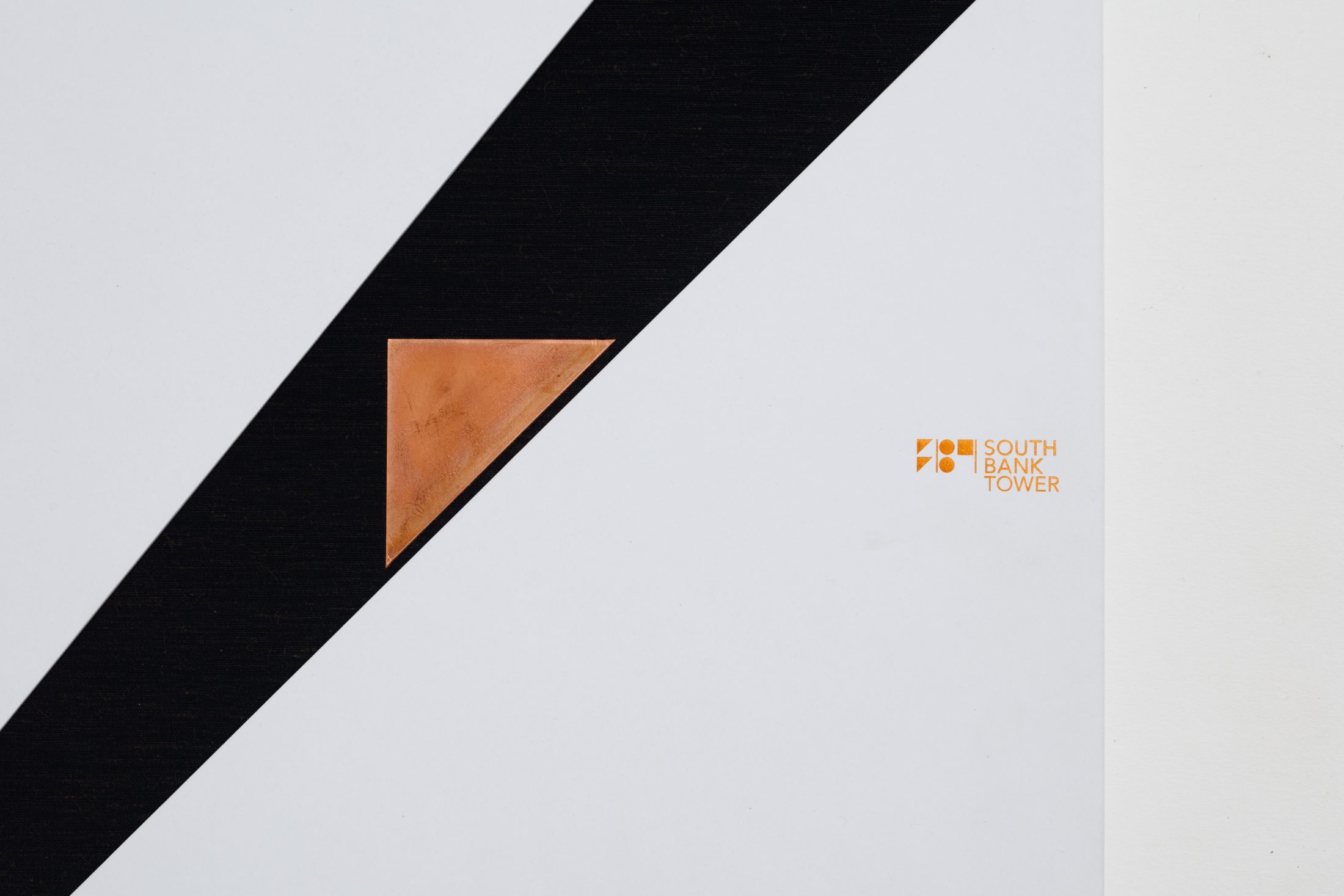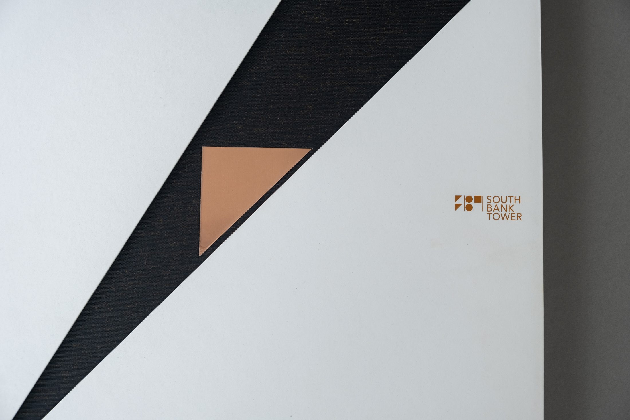 Printed and bound presentation books promoting a real estate property. Bound in bookcloth with a copper triangle inlaid onto the front cover. The paper covered two-part case housing the book fits perfectly across the diagonal to highlight the edge of the copper triangle.