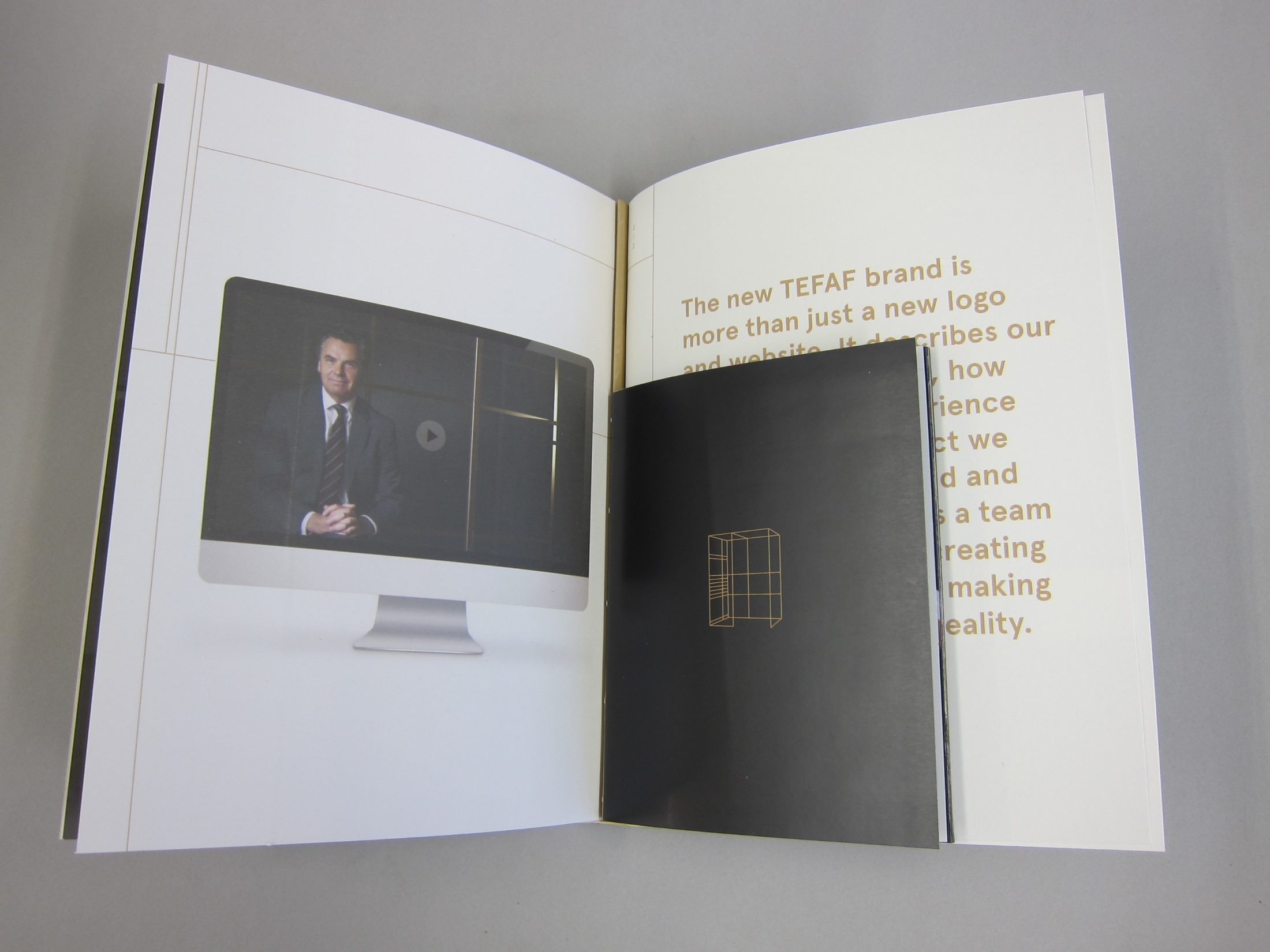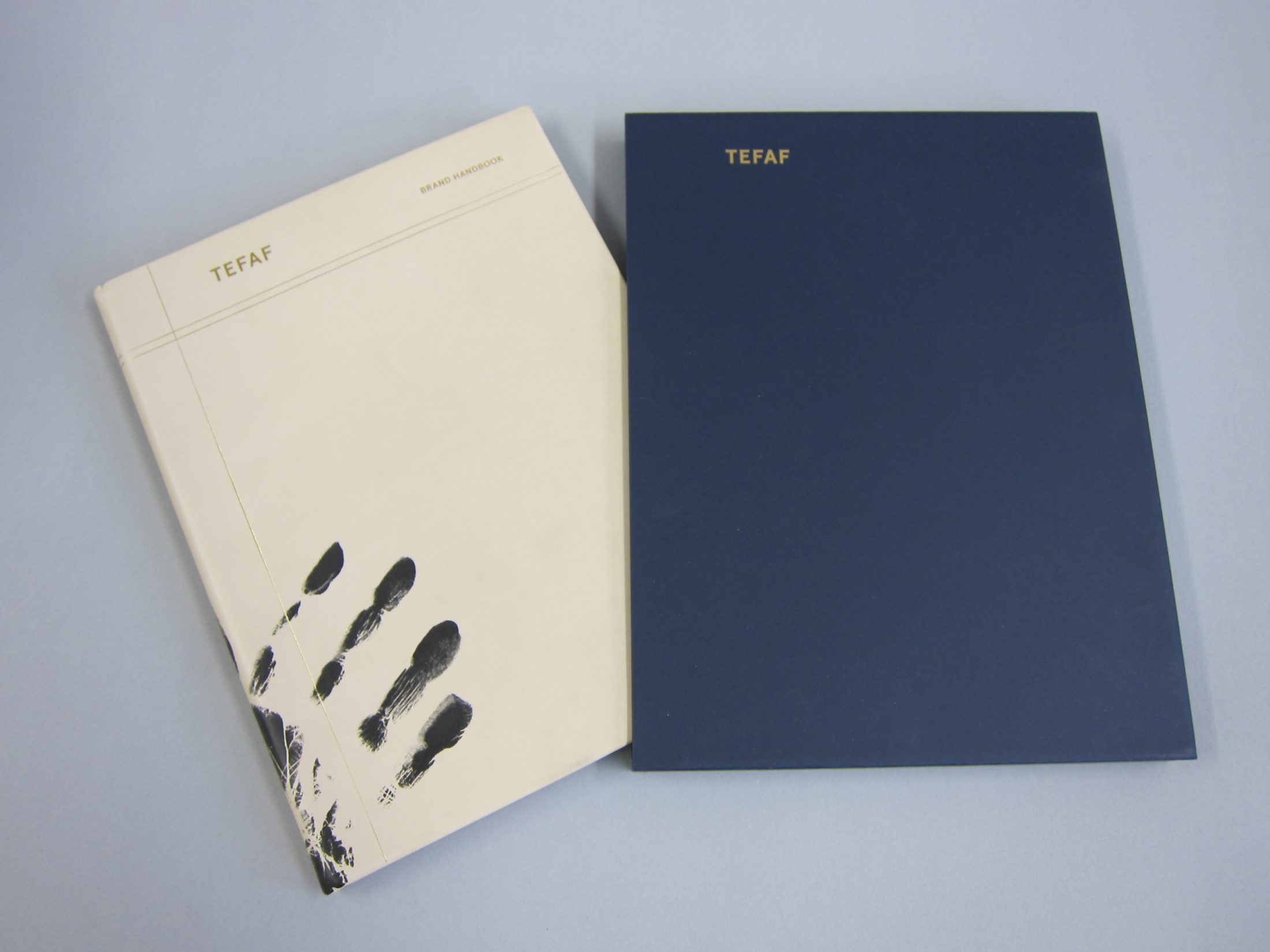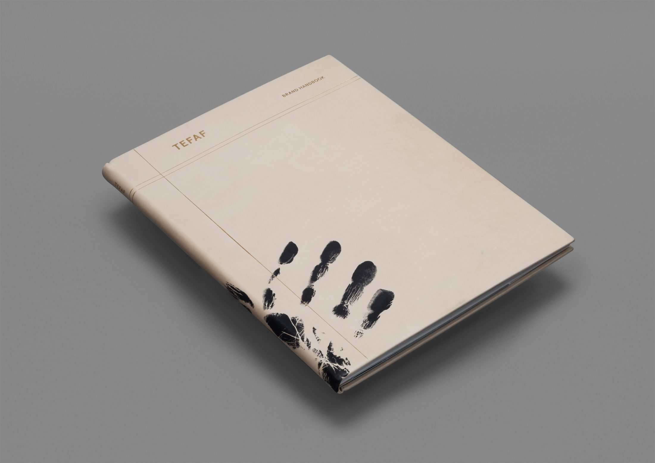 Design prototype with Indigo printed pages. The calfskin cover is foil blocked in gold and then individually printed with a hand. The book contains different sized inserts amongst the pages.