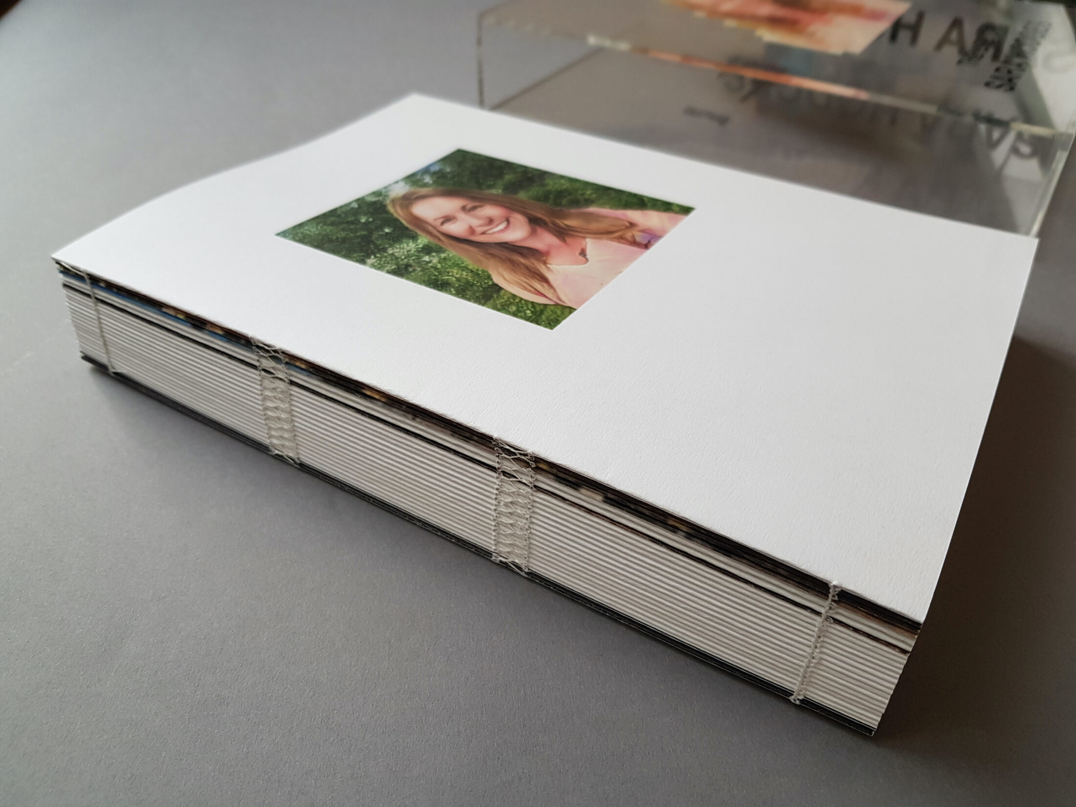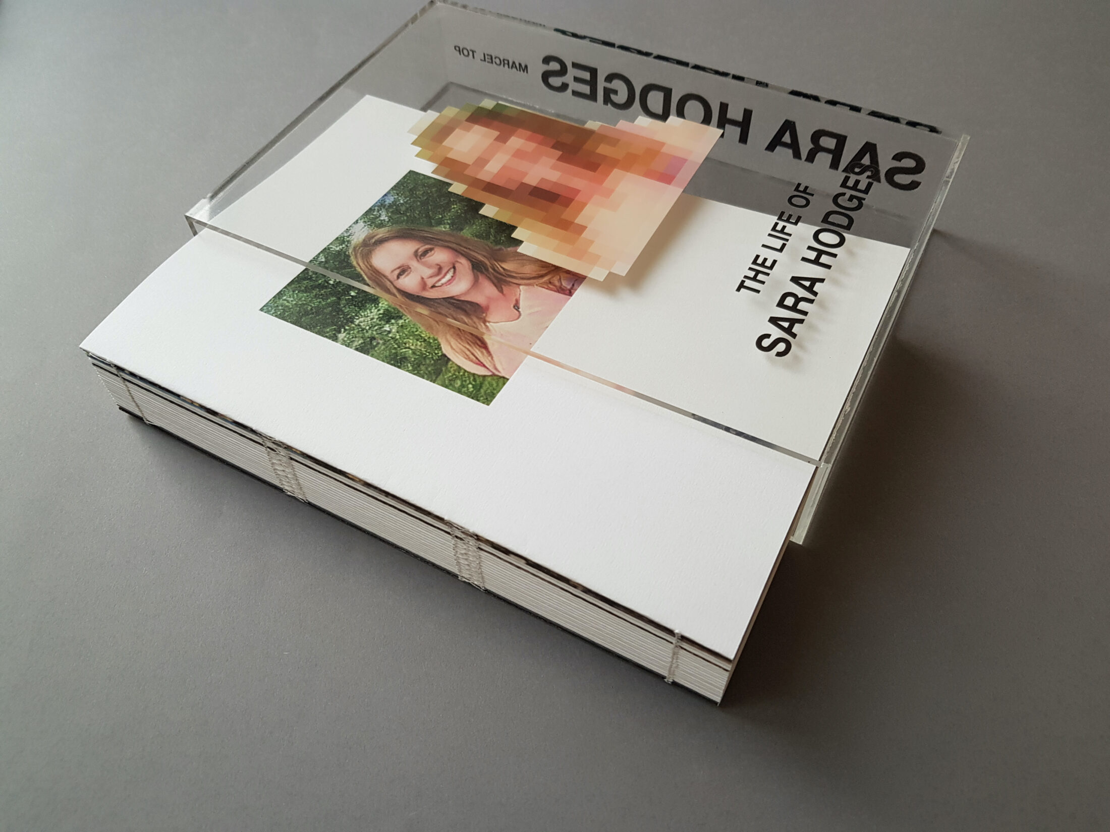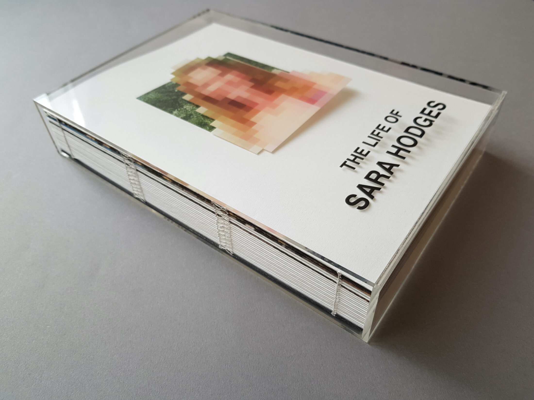 Printed book with exposed sewing on the spine, and a specially designed and printed acrylic slipcase.