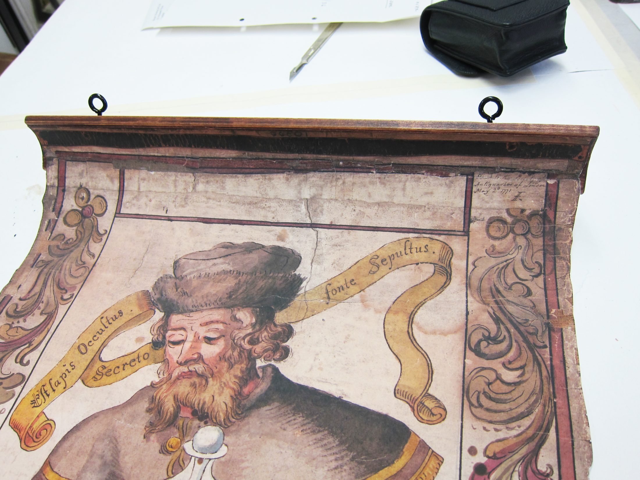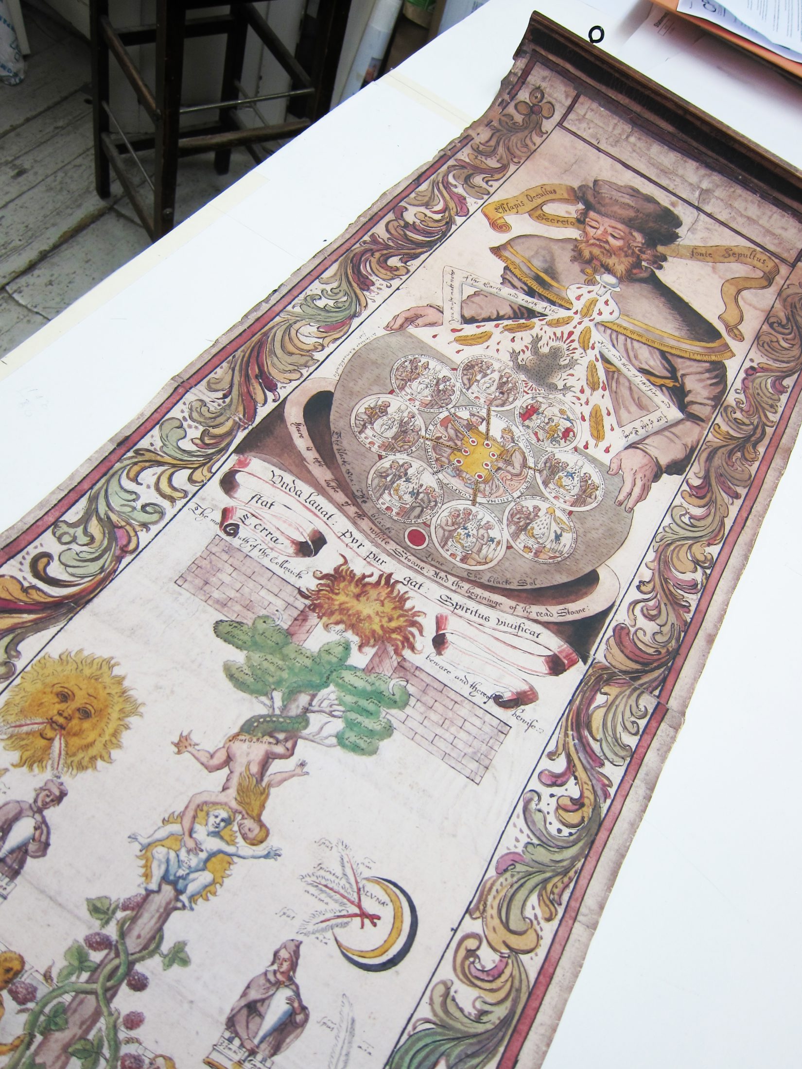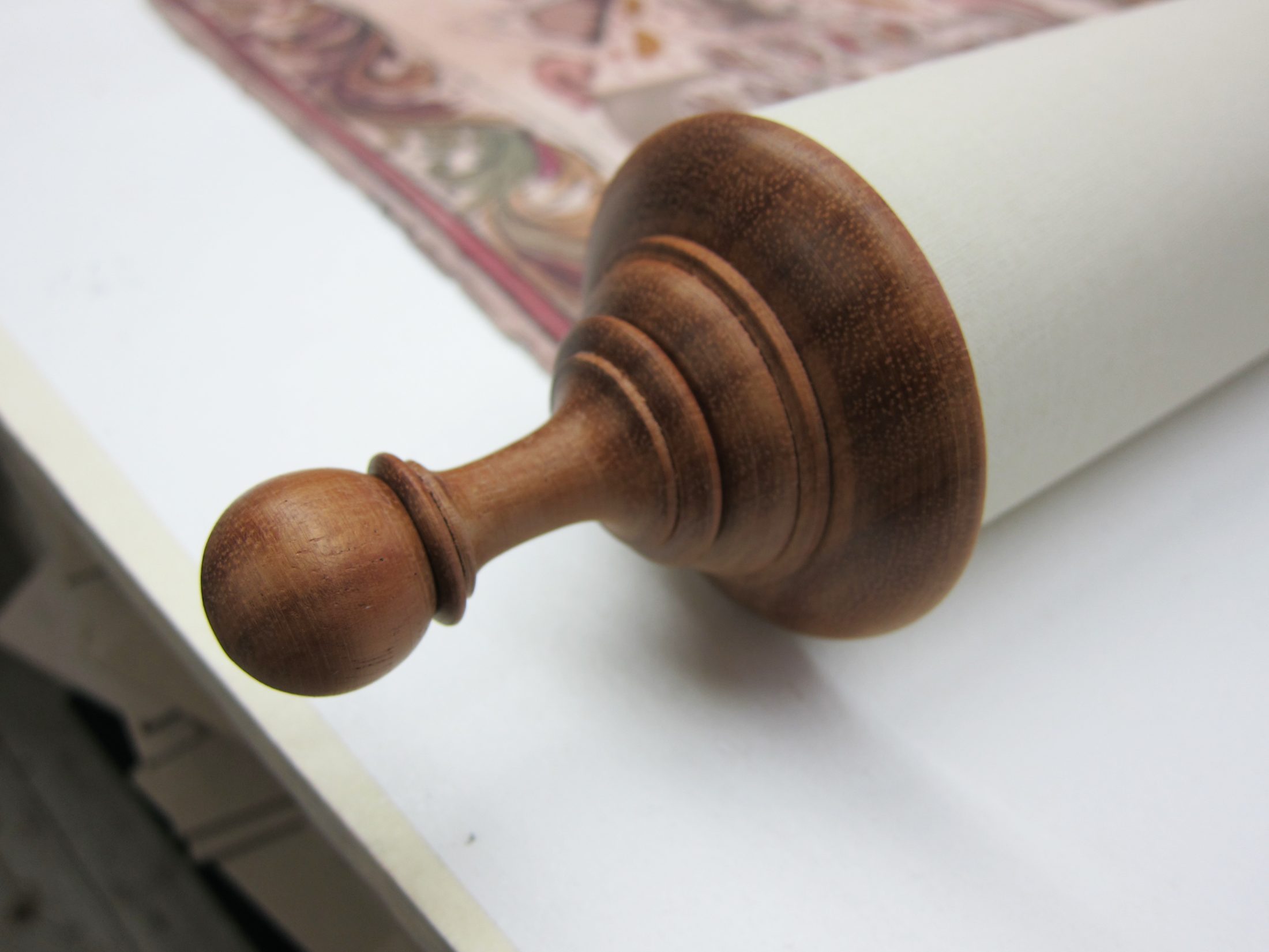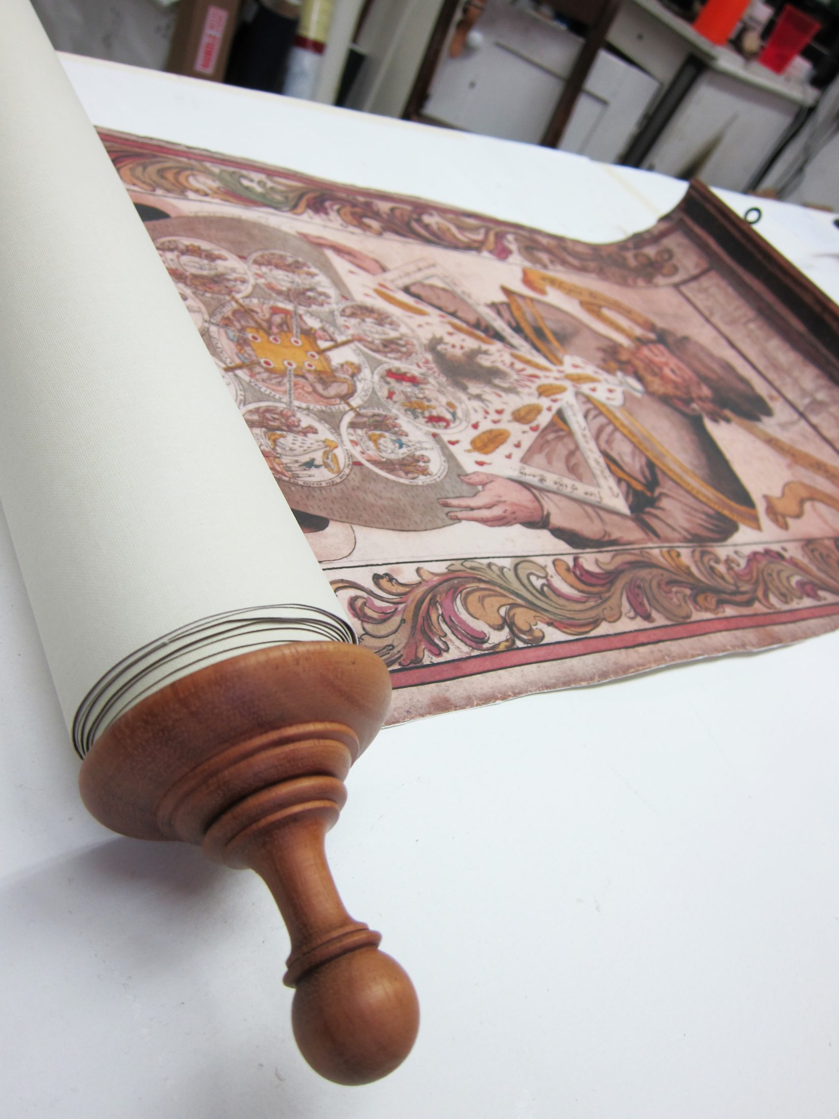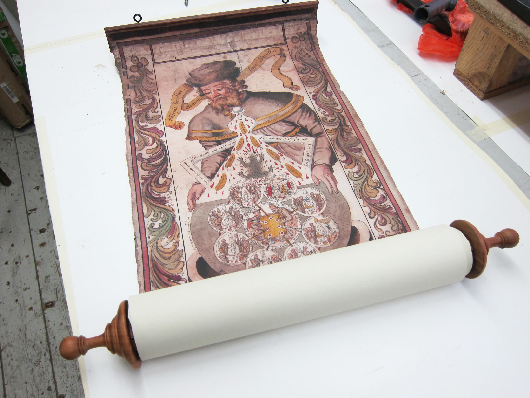 A facsimile of a hand painted scroll created for an exhibition at the Wellcome Collection. The paper scroll is lined with a cotton material and attached to newly turned scroll bars.